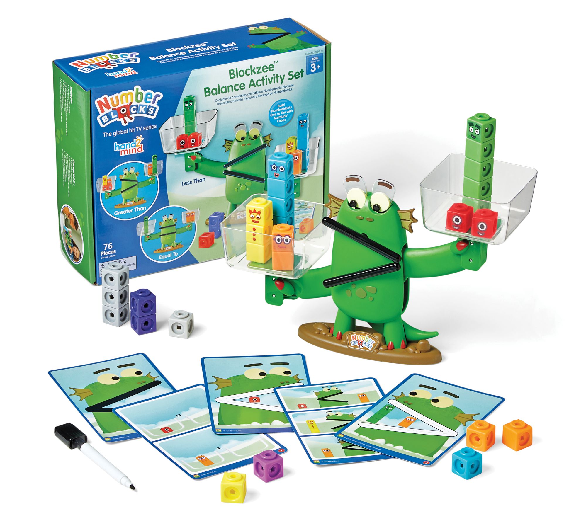 • Includes one Blockzee Balance with two clear buckets, 61 MathLink Cubes, 10 double-sided activity cards, one activity guide, one sticker sheet, and one dry-erase marker