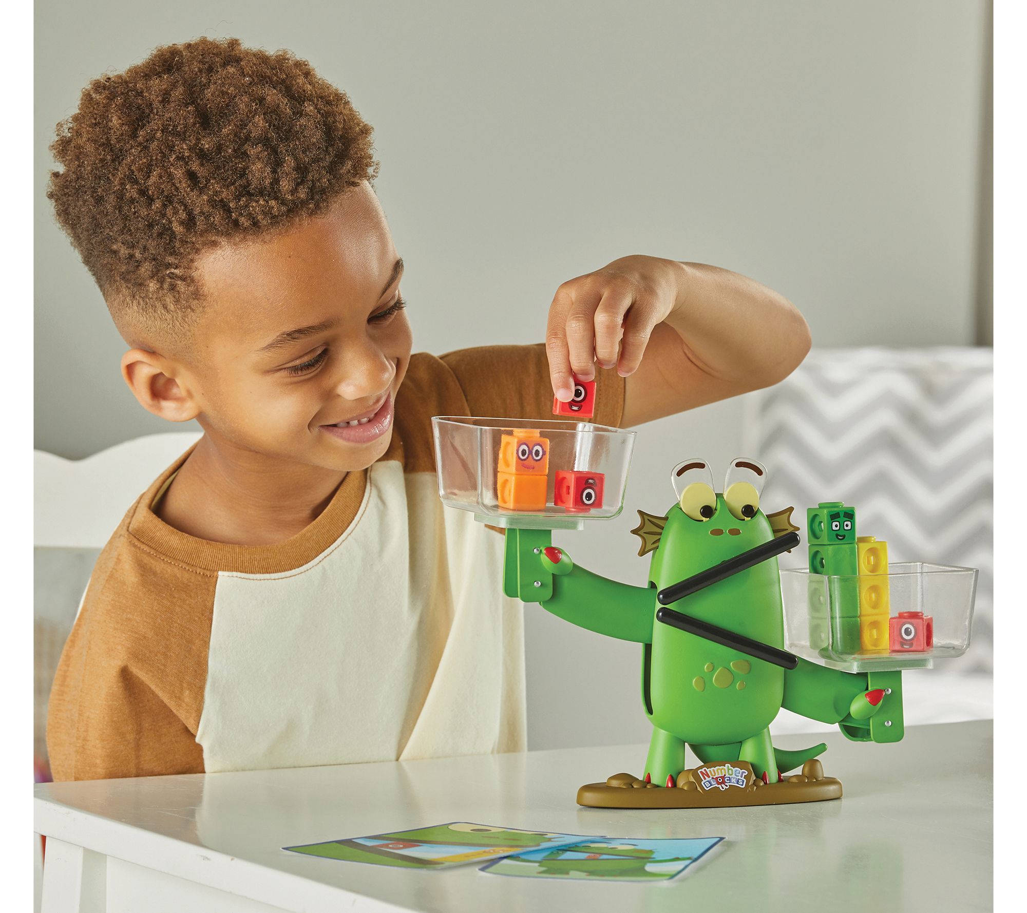 Try letting math skills come alive as little learners explore counting, sorting, and number comparison with an animated, character-led activity set inspired by a favorite TV series. Watch eyes and arms move while balancing colorful blocks and following playful cards for dozens of hands-on challenges. From Hand2Mind.