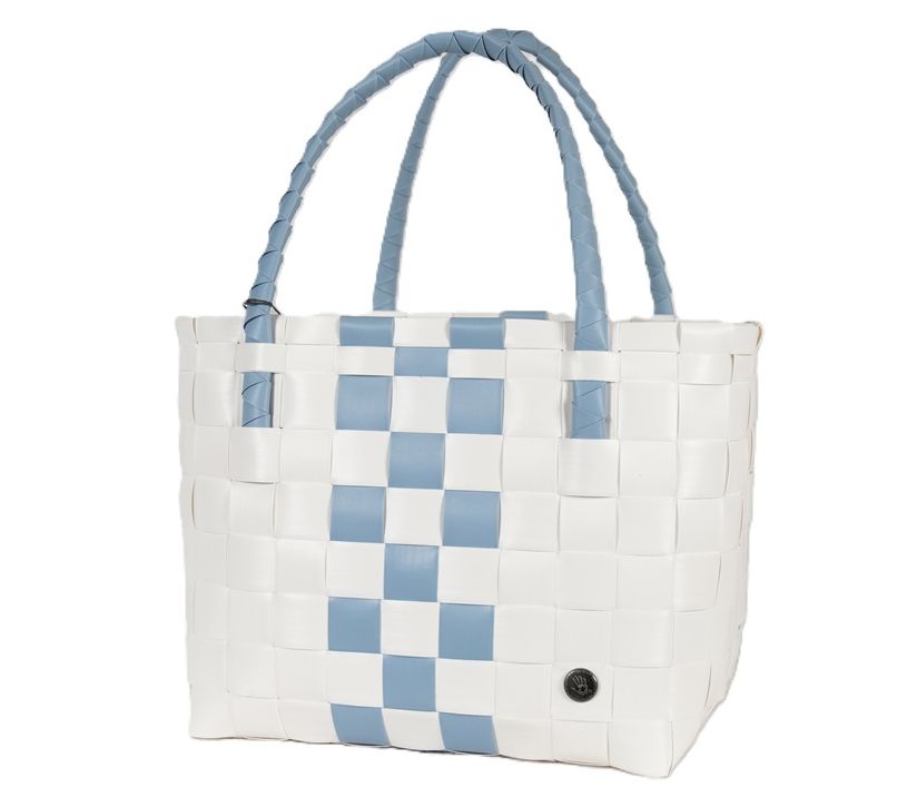 • Woven exterior, checkboard pattern, silvertone hardware, open top, double handles