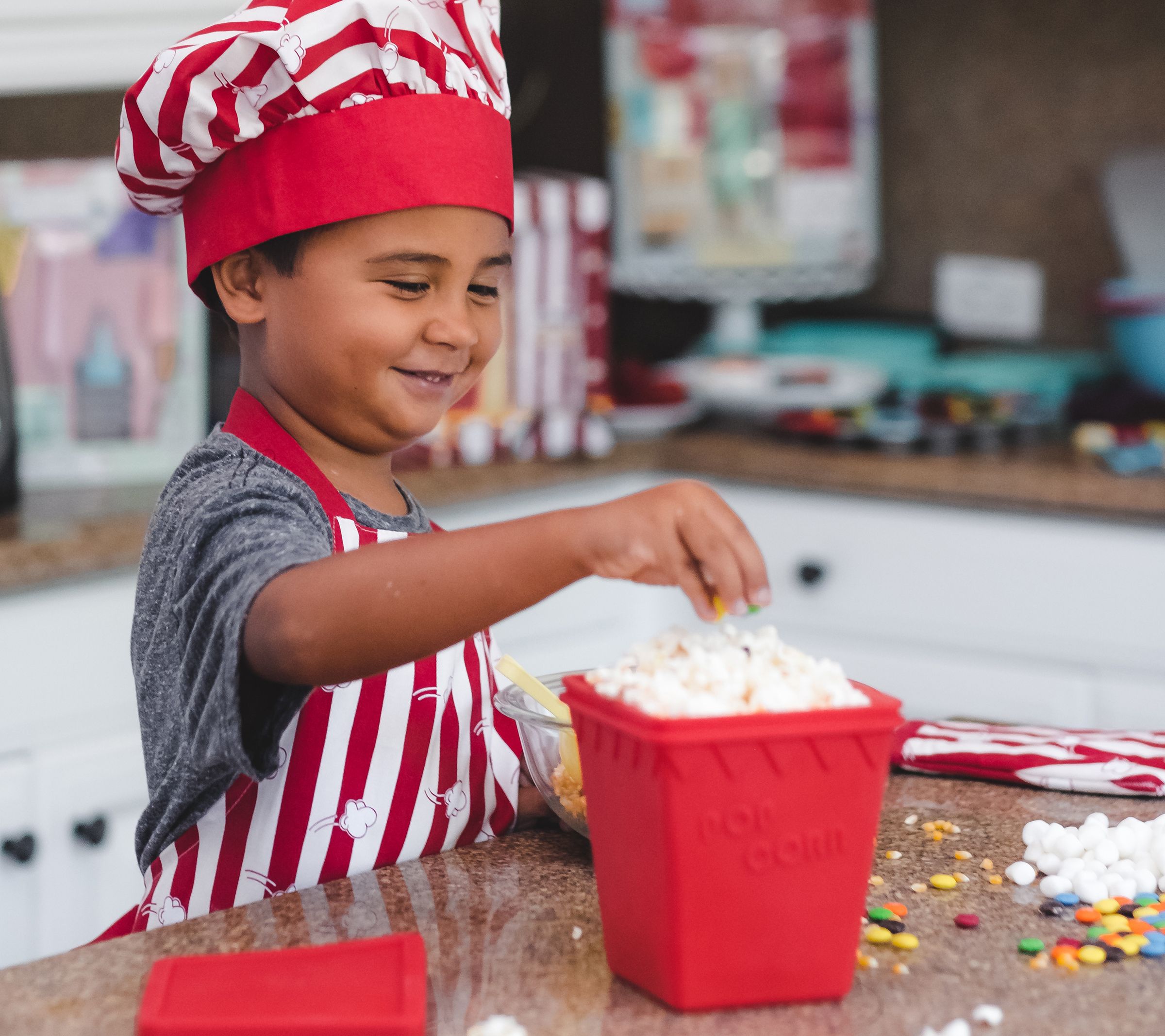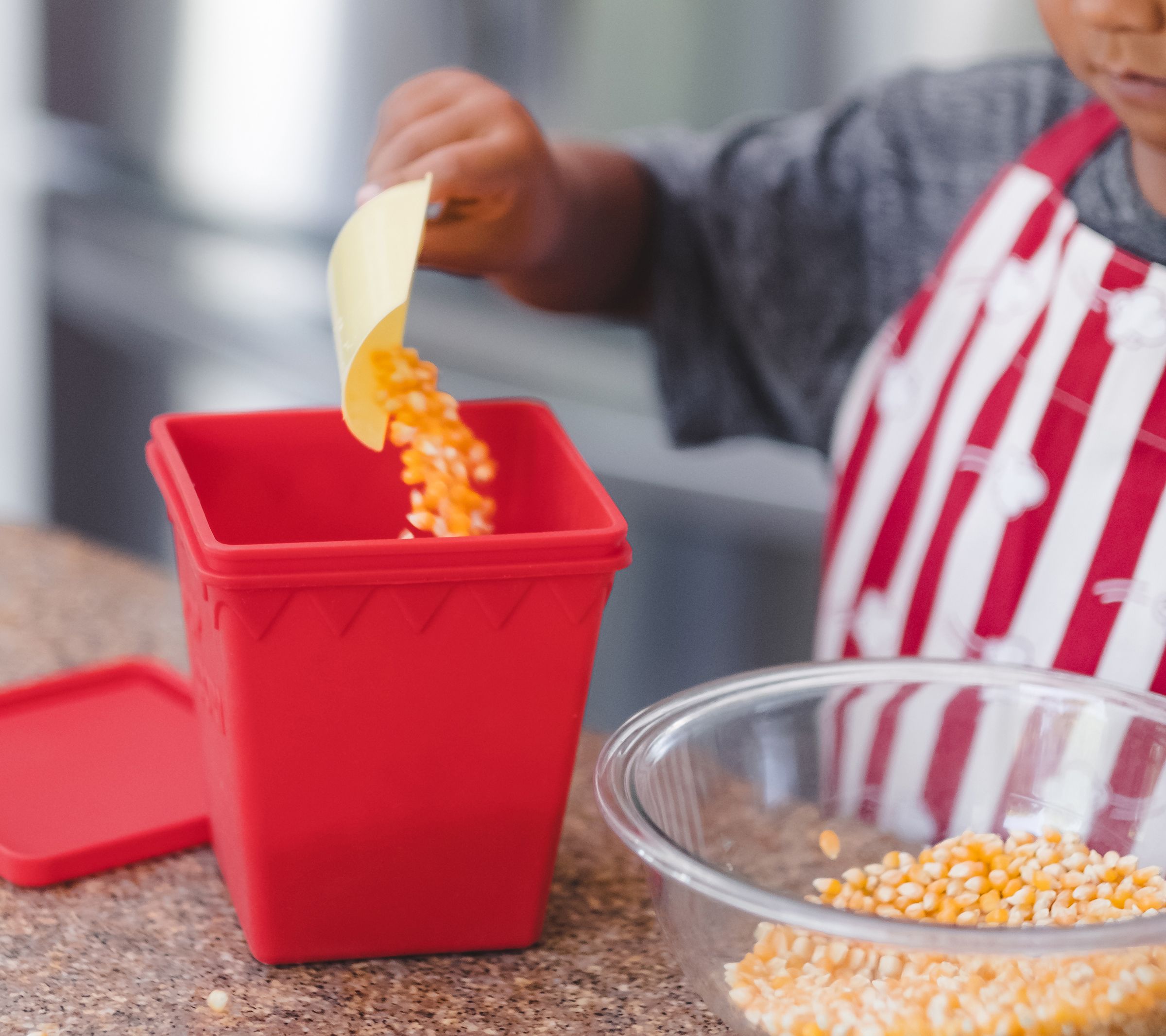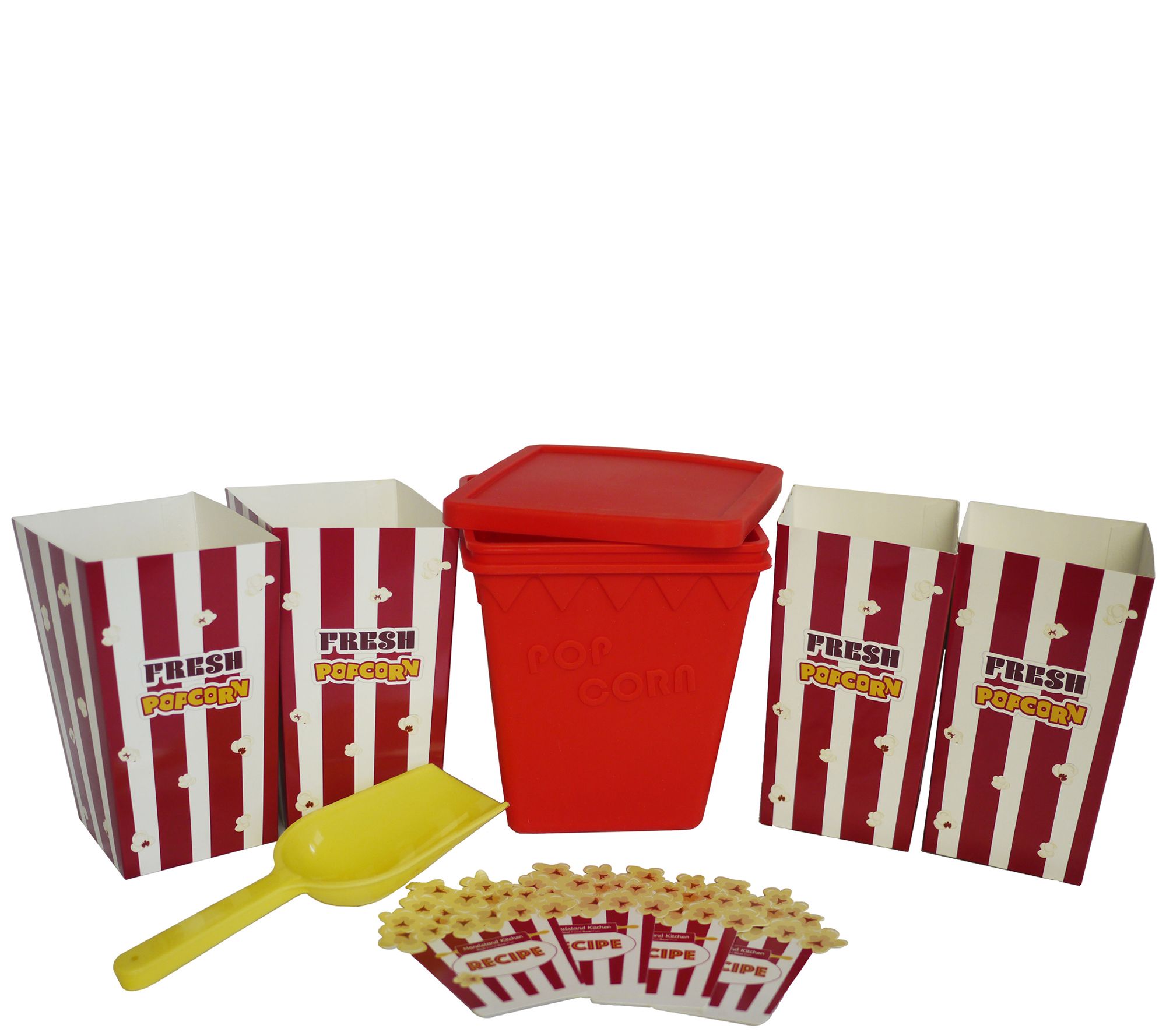 • Includes silicone popping container with lid, 1/4-cup scoop, four serving containers, and four recipe cards