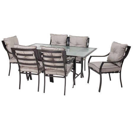 Includes dining table and six chairs with cushions