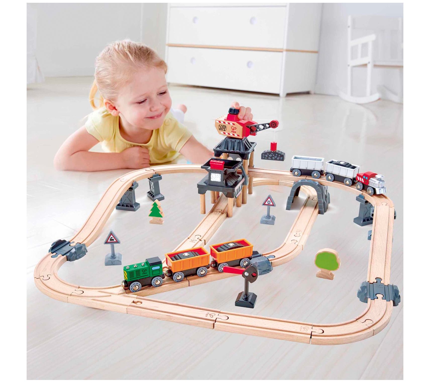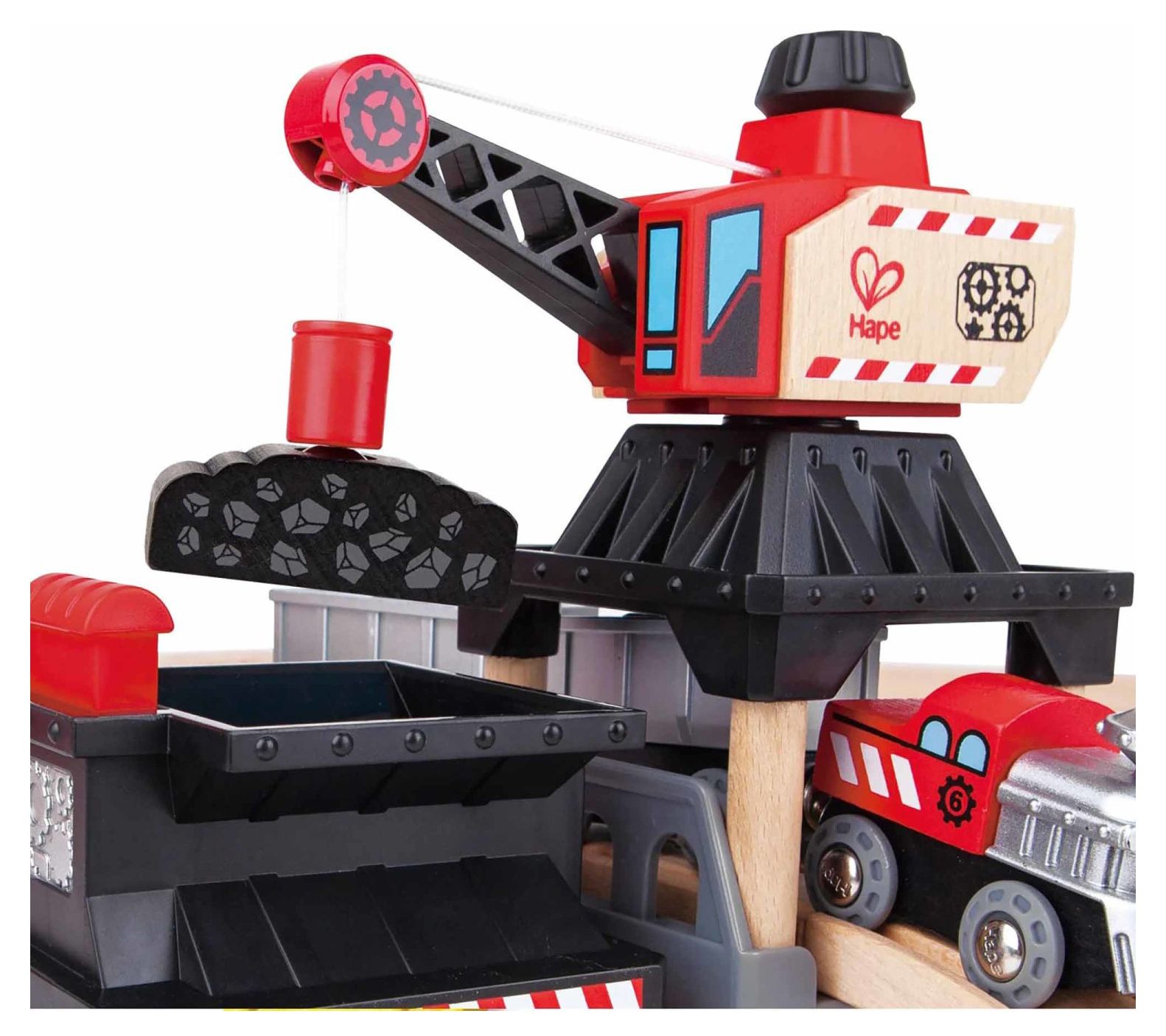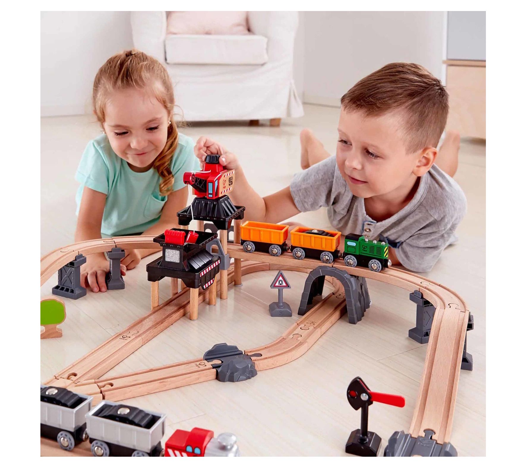 Bring the excitement of a bustling rail yard to playtime with this mining loader train set, featuring imaginative accessories and a functional magnetic crane for endless storytelling. Children can engage in hands-on fun by lifting loads, operating the loader, and transporting cargo through the included tunnels and tracks. From Hape.