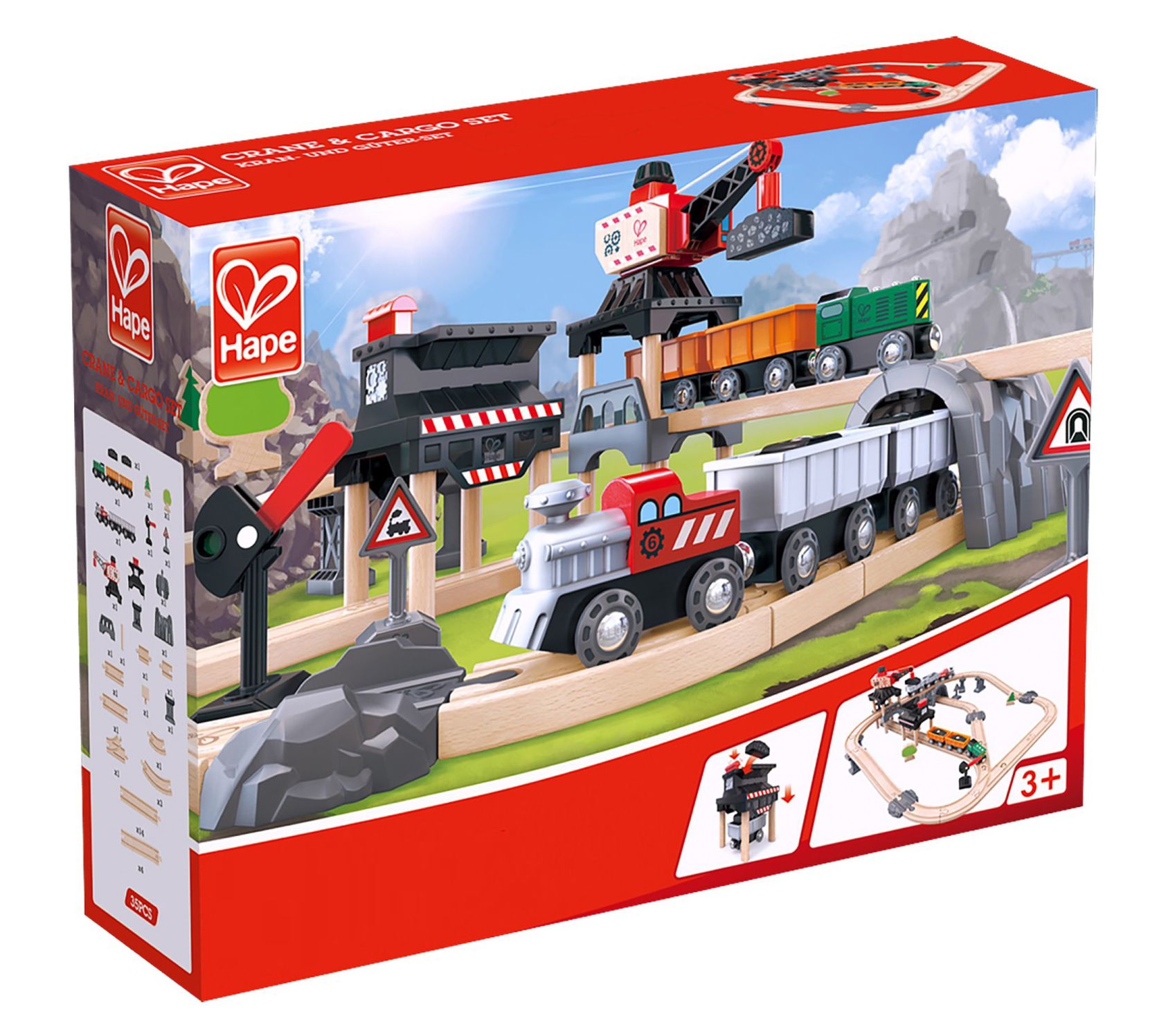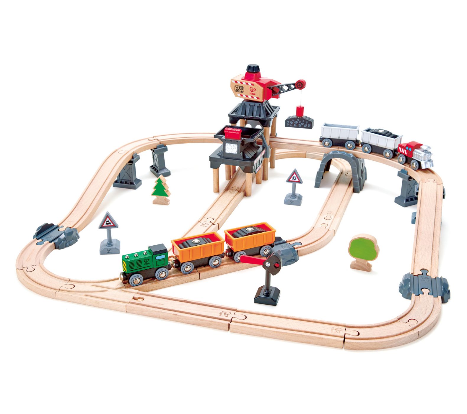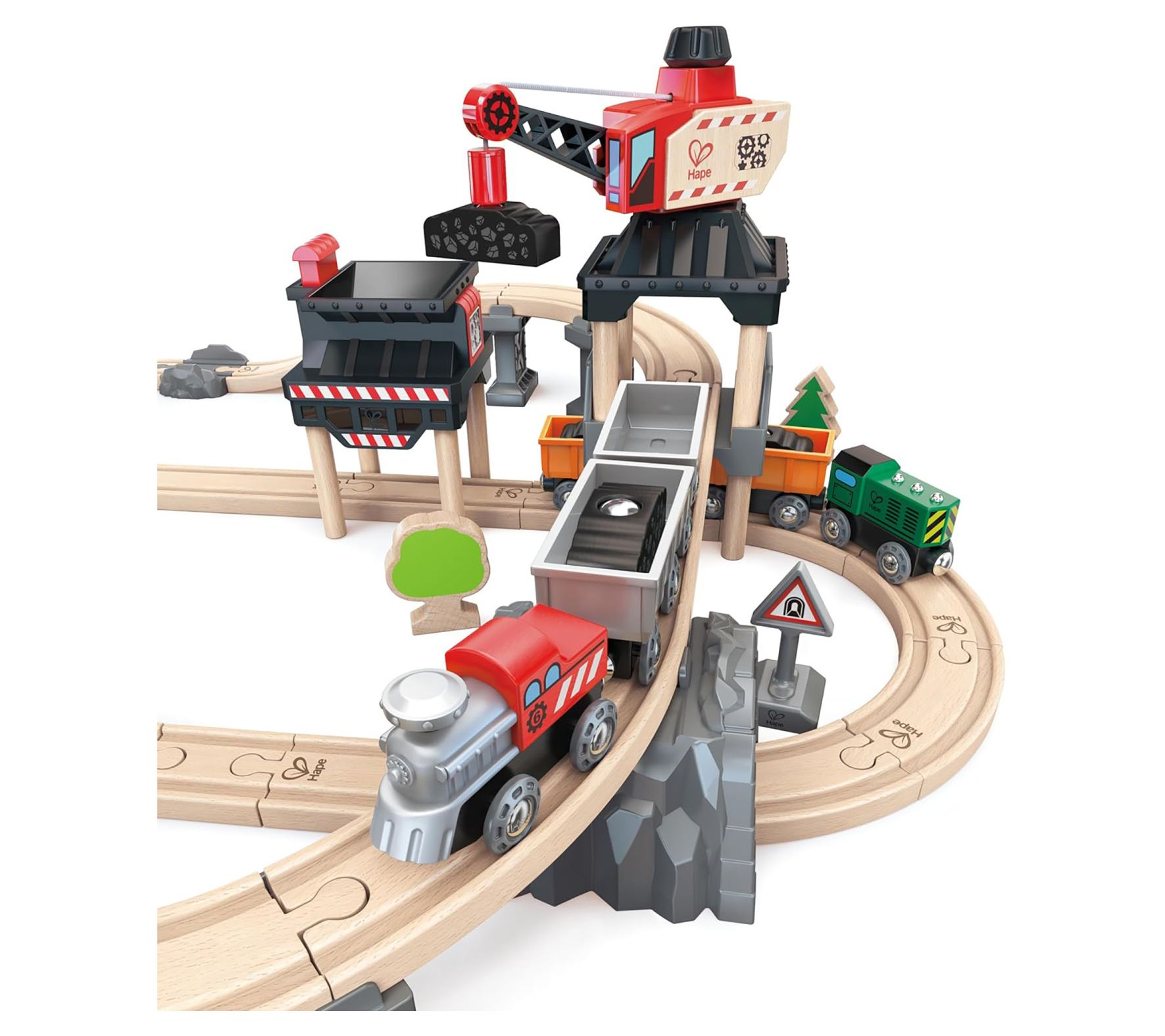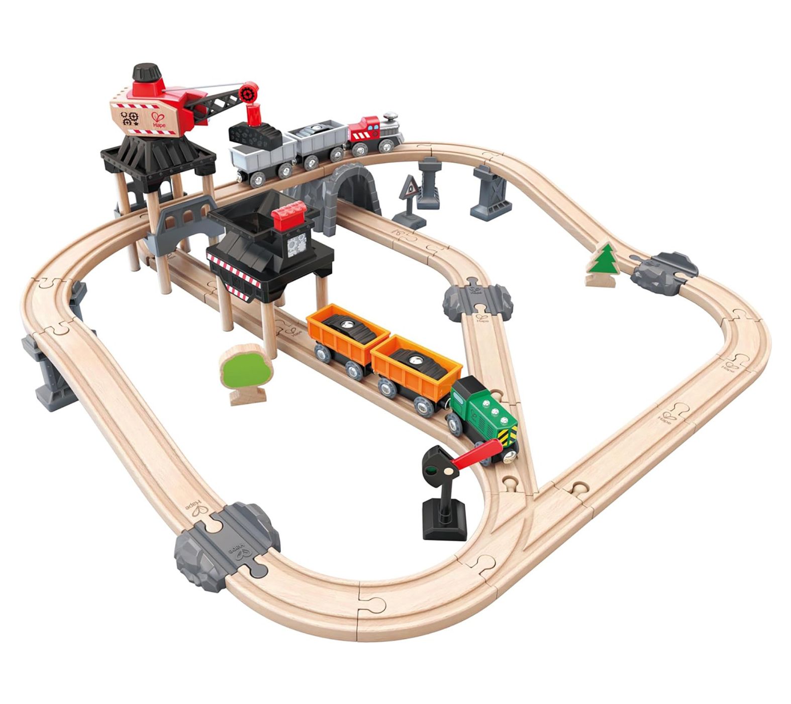 Bring the excitement of a bustling rail yard to playtime with this mining loader train set, featuring imaginative accessories and a functional magnetic crane for endless storytelling. Children can engage in hands-on fun by lifting loads, operating the loader, and transporting cargo through the included tunnels and tracks. From Hape.