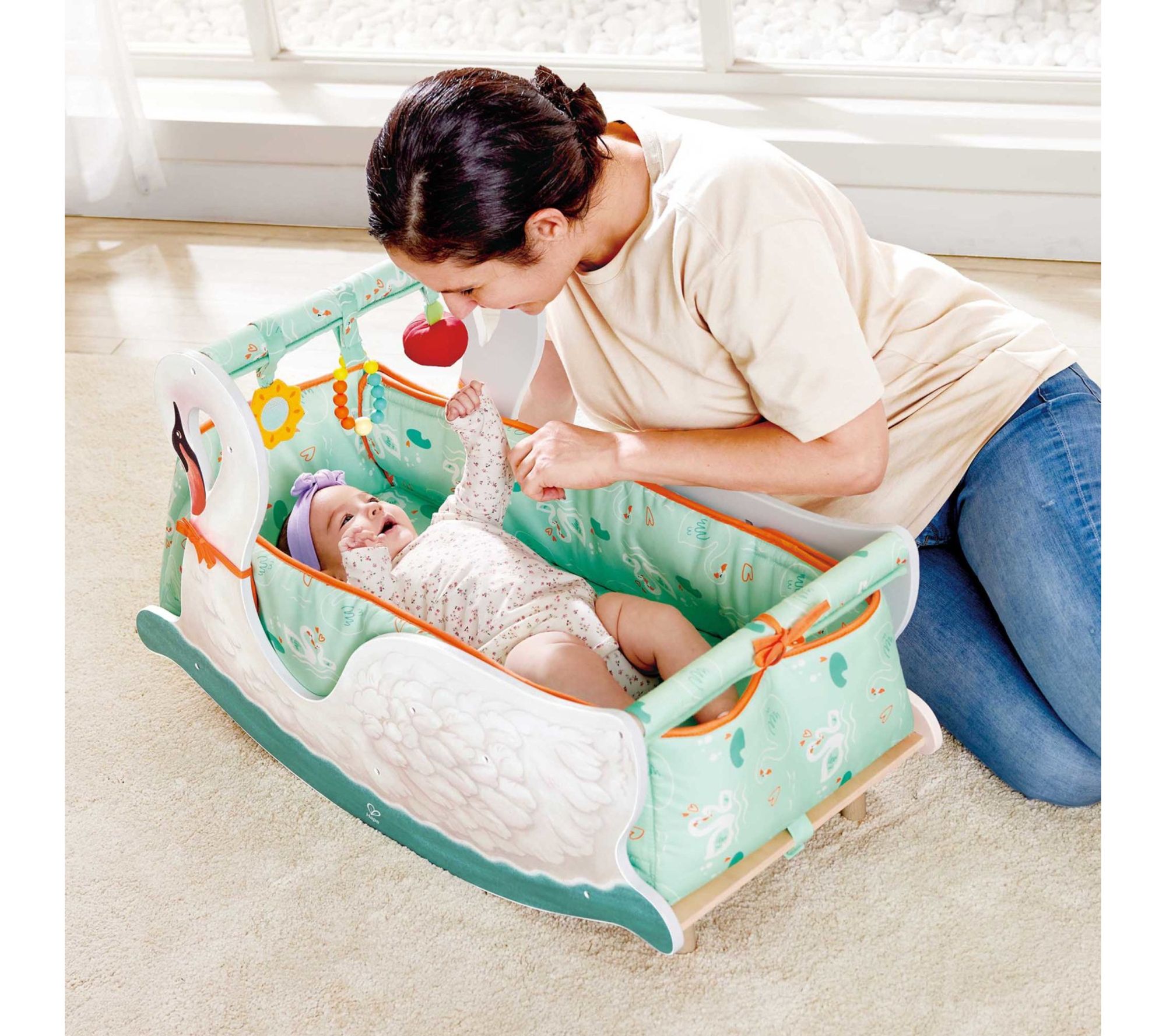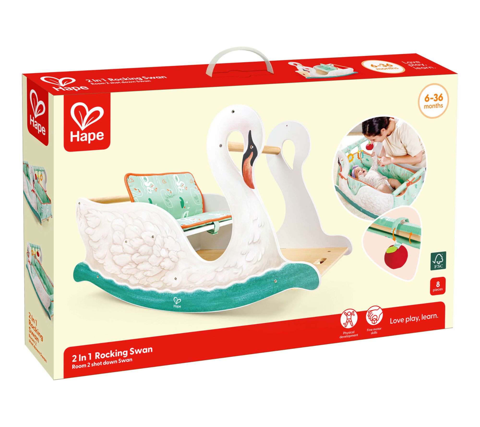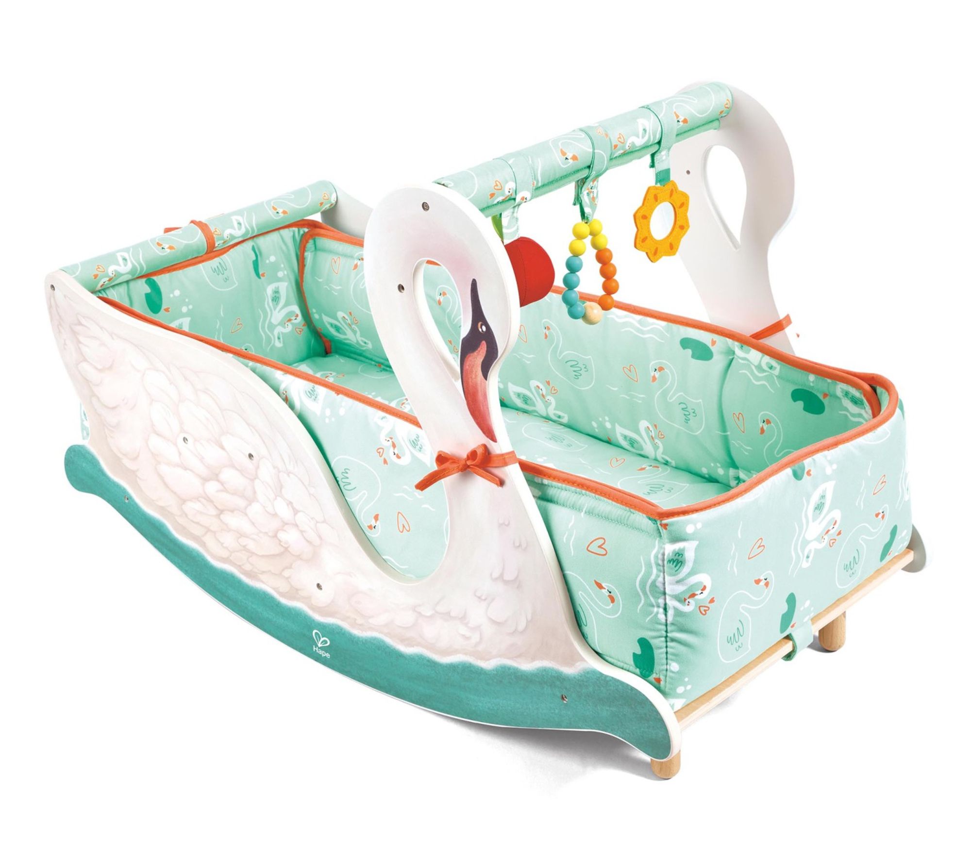 Give your little one the best of both worlds with the Hape 2-in-1 swan seat baby rocking bassinet cradle. This versatile piece transitions from a baby gym with hanging toys to a rocking chair that mimics the sensation of riding a swan. Perfect for playtime and relaxation. From Hape.