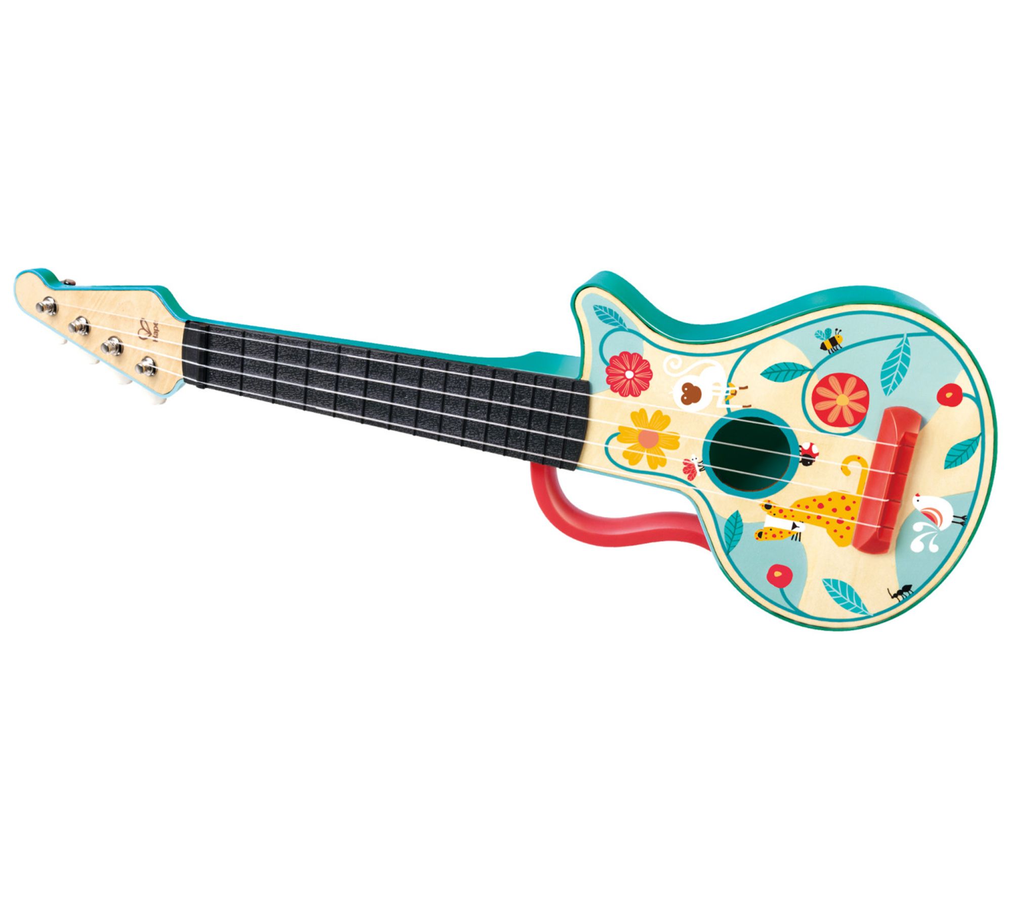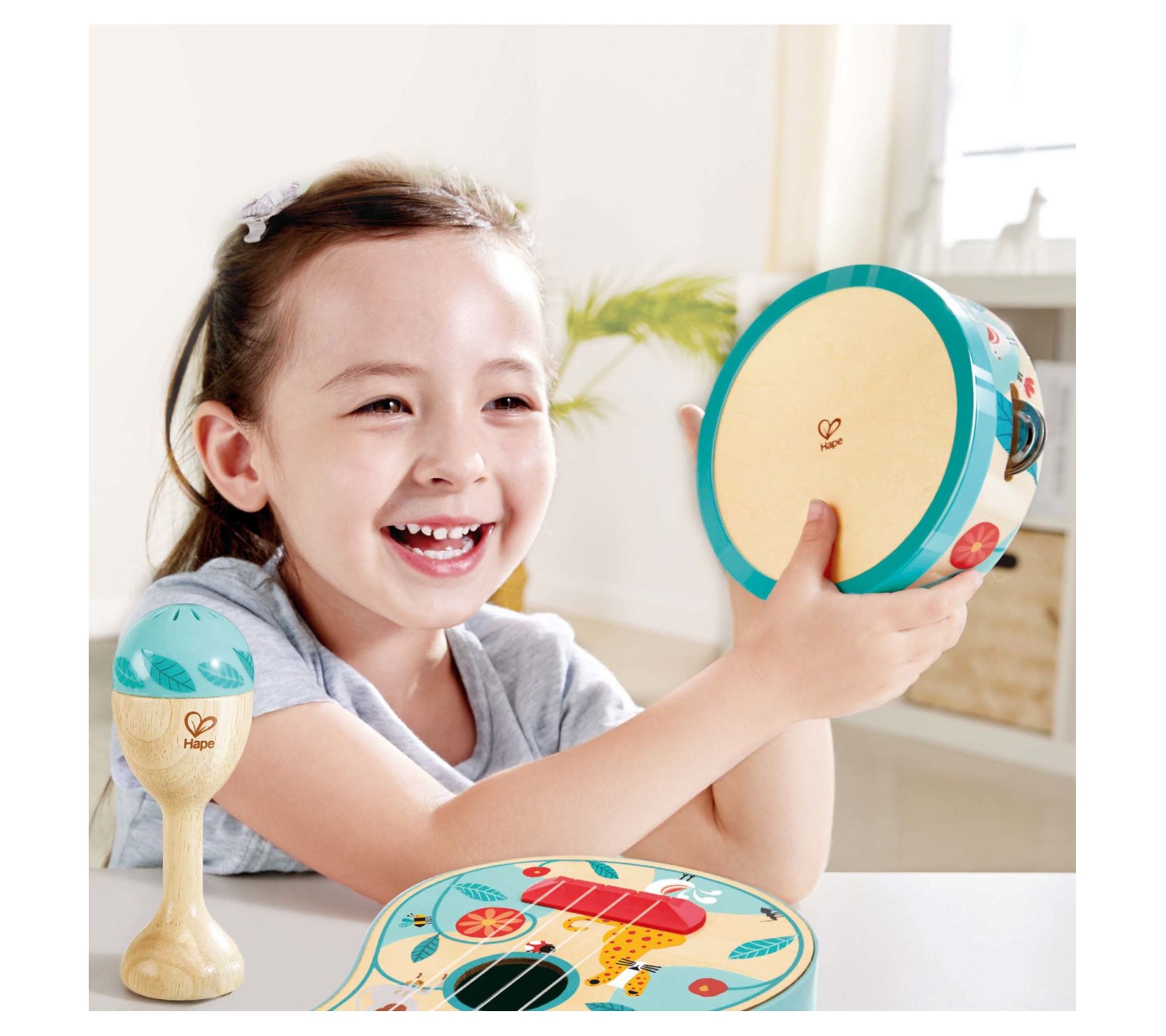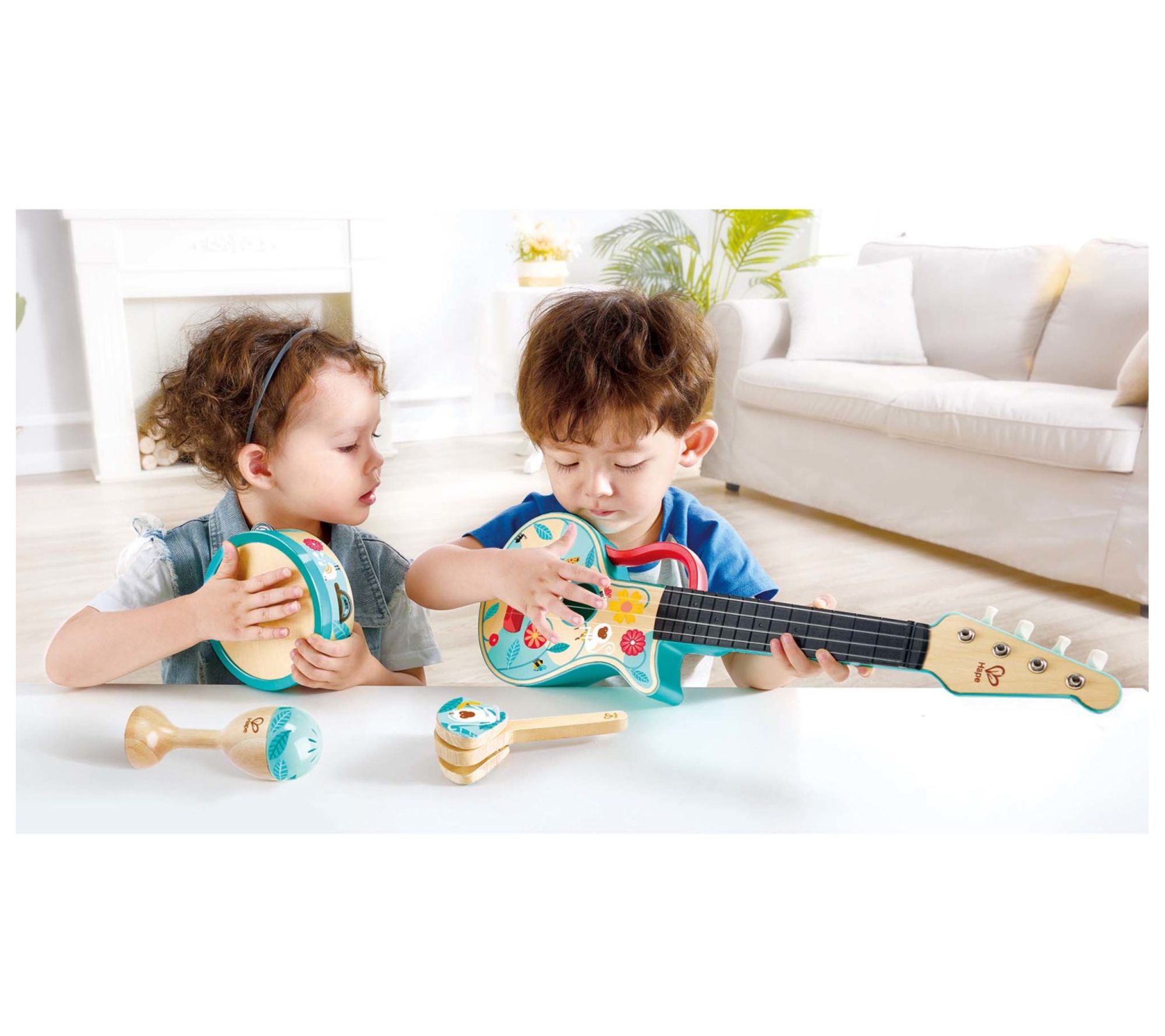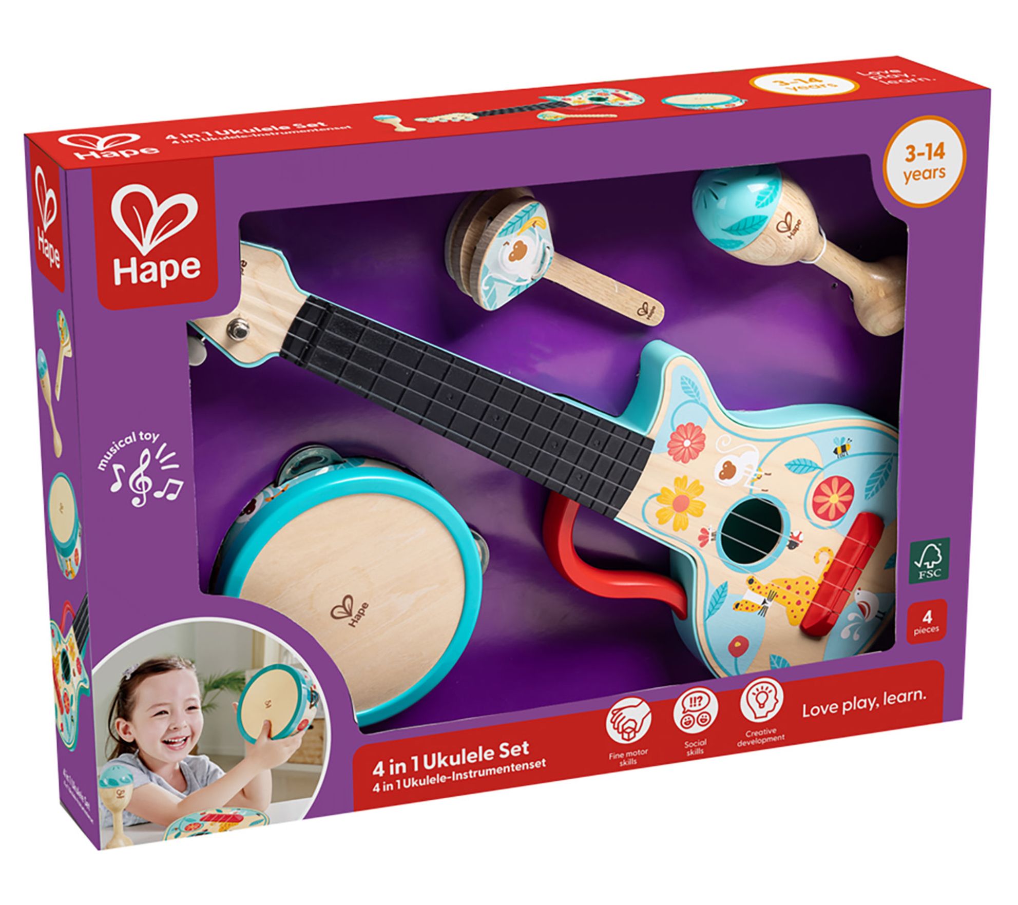Ignite your child's musical creativity with the Hape 4-In-1 wooden ukulele set. This vibrant set lets little ones explore rhythms and melodies with a ukulele, maraca, tambourine, and castanet. Perfect for budding musicians, it encourages learning of basic notes and rhythmic patterns. From Hape.