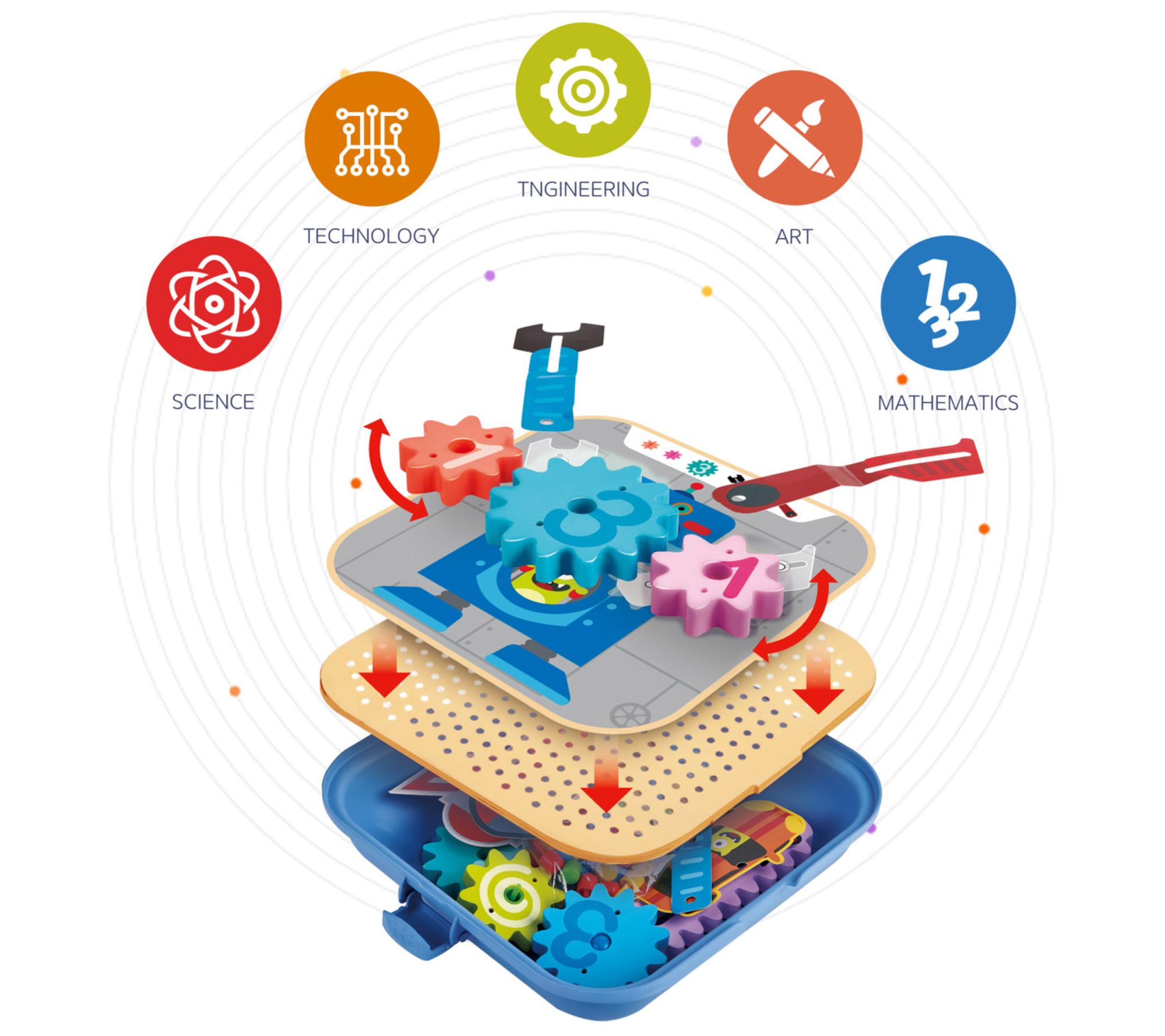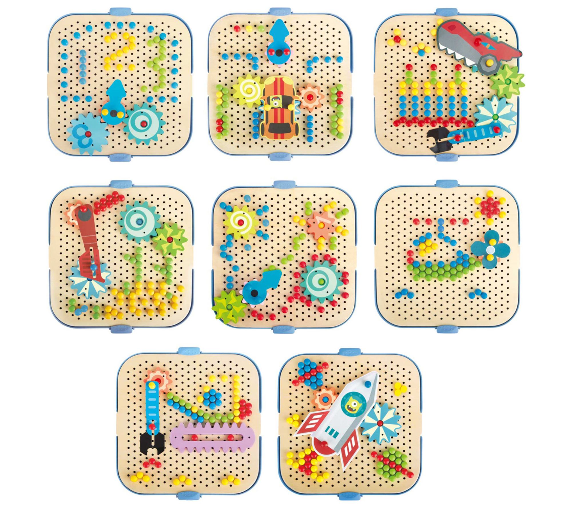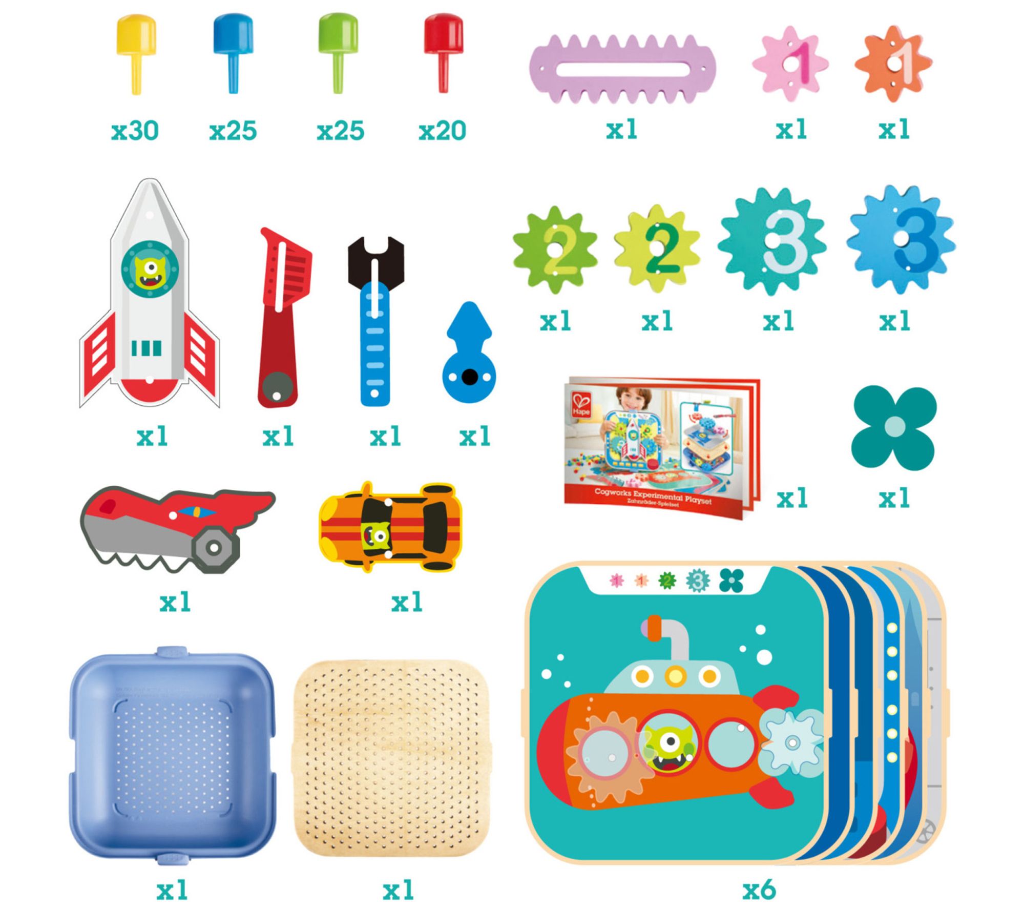 • Includes six backgrounds, pegboard, cover, 100 pins, seven elements, seven gears, book