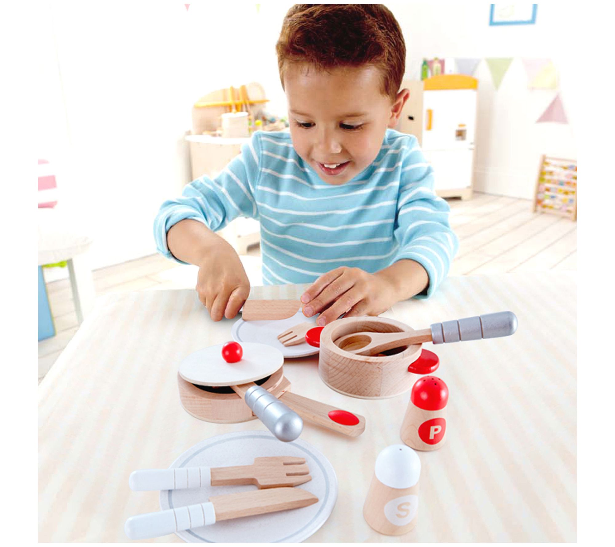 • Includes pot, pan, lid, spoon, spatula, two plates, two sets of knives and forks, and a pair of salt and pepper shakers