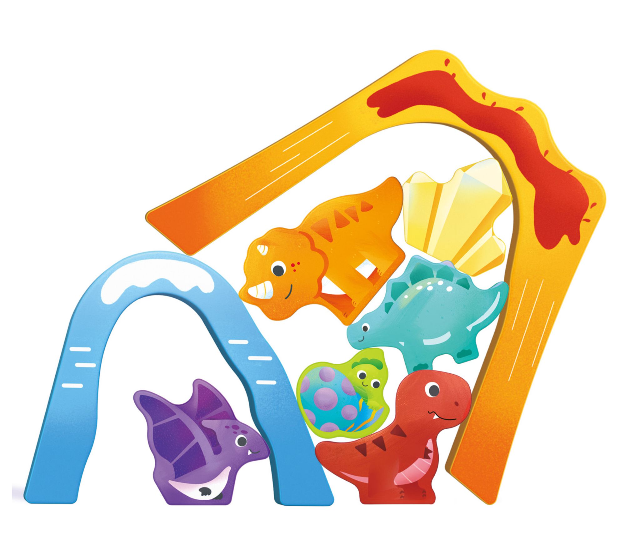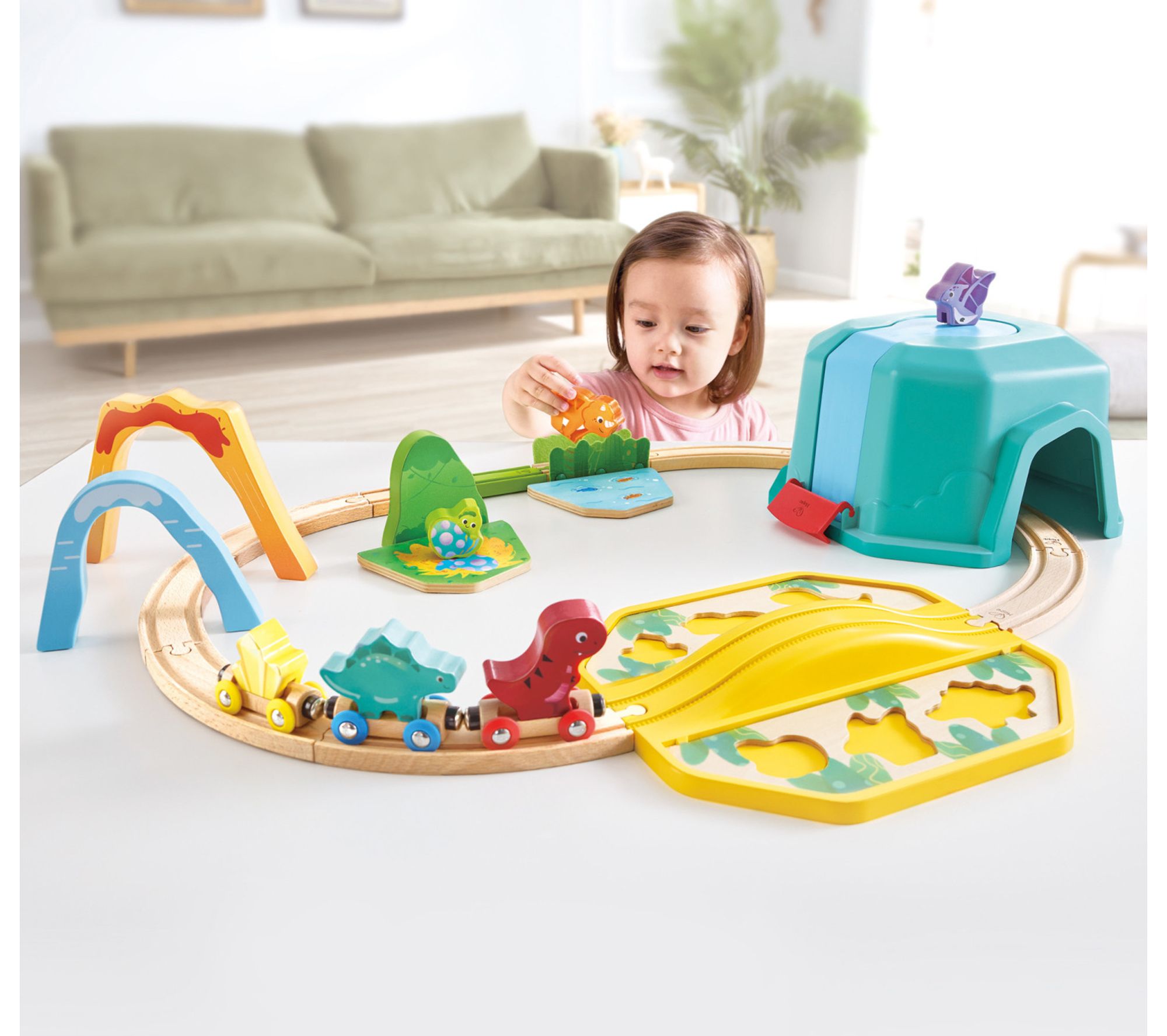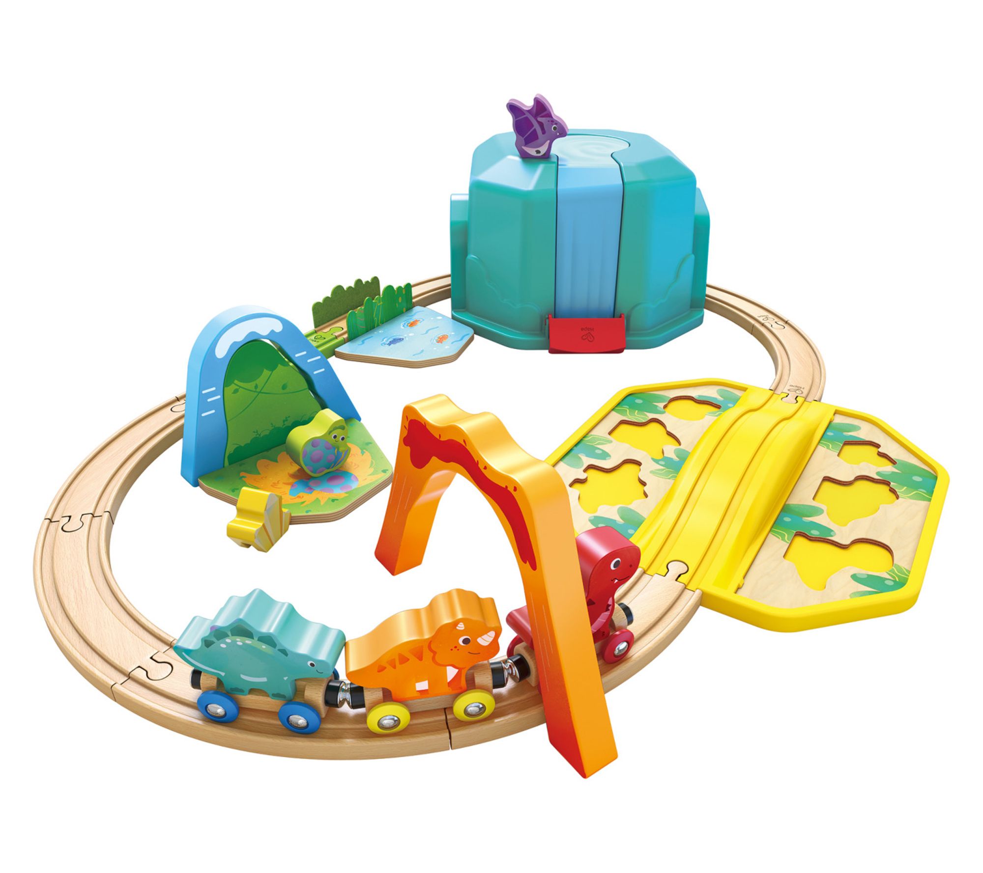Create a prehistoric adventure with the Hape dinosaur wooden train puzzle set. Ride through volcanoes and waterfalls, stack up dinosaurs, and enjoy sound effects with every corner turned. It's a perfect pick-up for little ones to develop fine motor skills, color recognition, and spatial thinking while exploring imaginative play. From Hape.