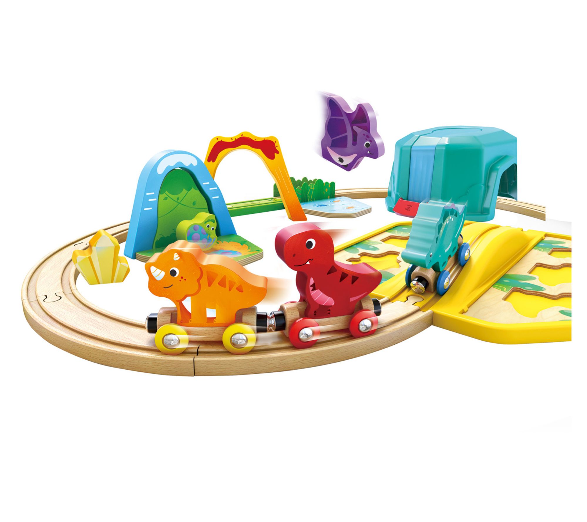 • Includes 10 rail tracks, six dinosaurs, two scenes, three caves, three rail car bases, one box lid, one bottom box, one plastic interaction rail
