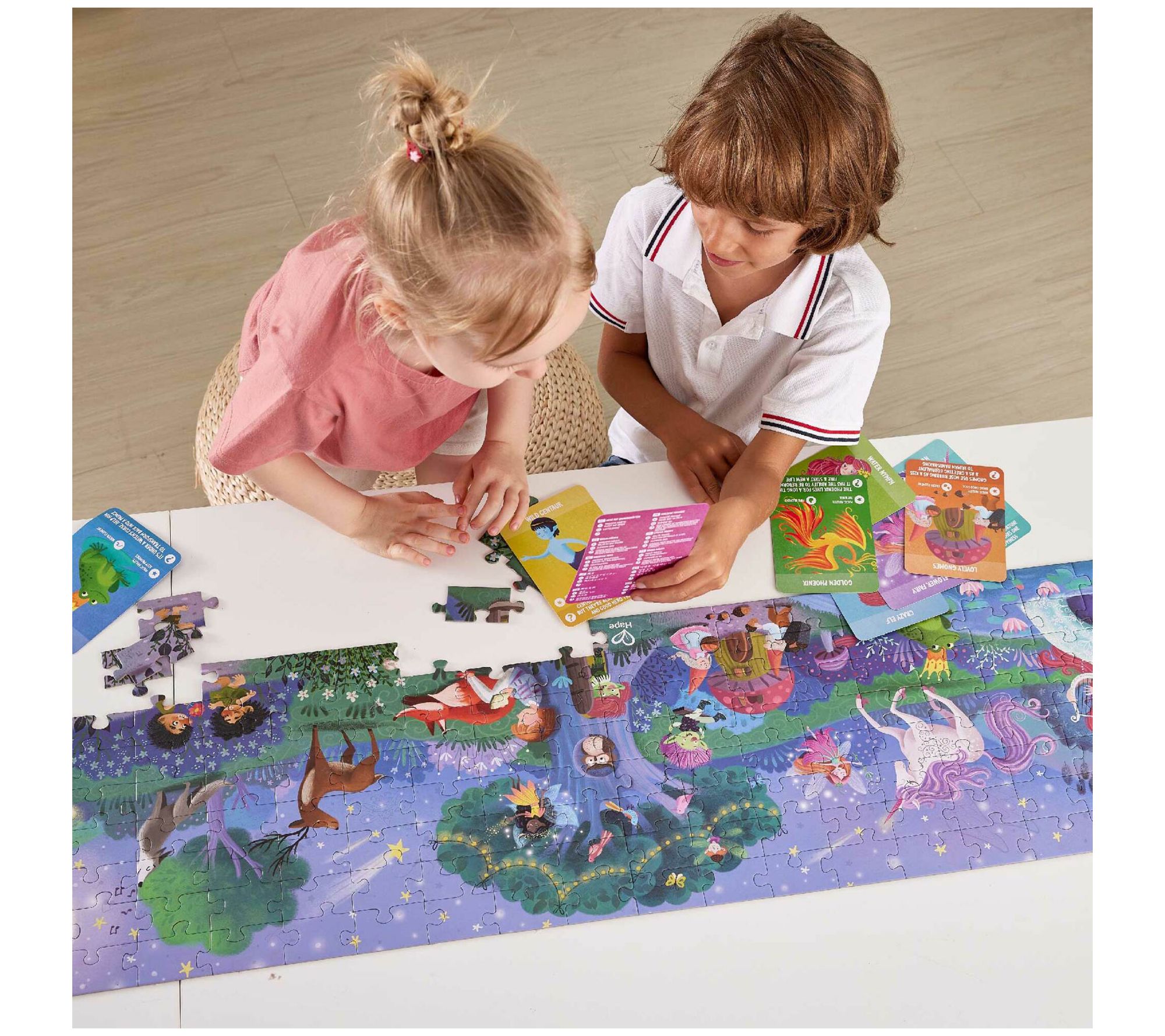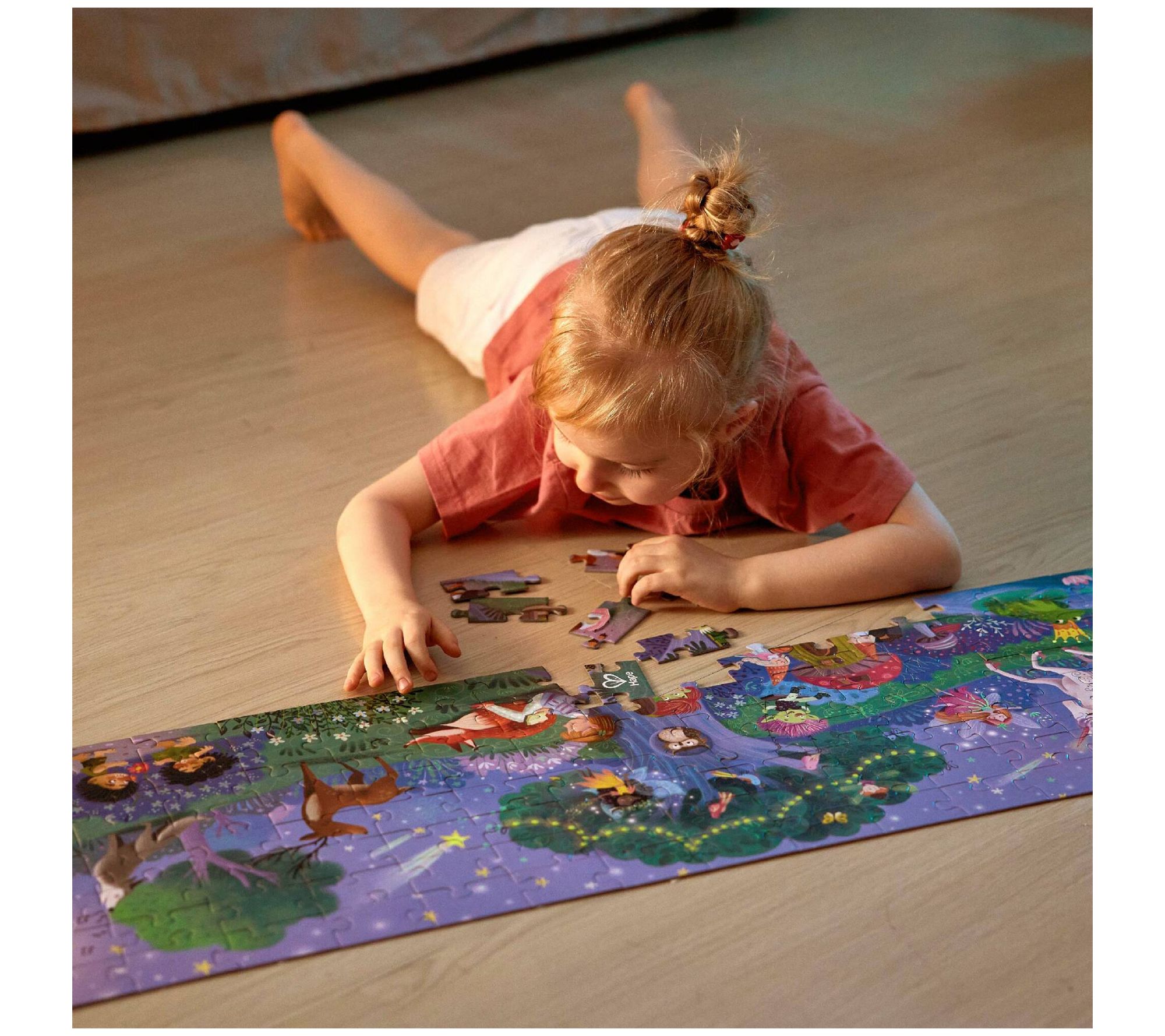 Visit an enchanted, whimsical land with this beautiful floor puzzle that features fun characters, bright colors, and a design that magically glows in the dark. From Hape International.