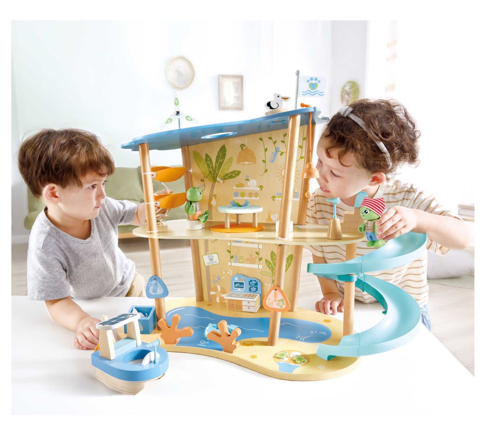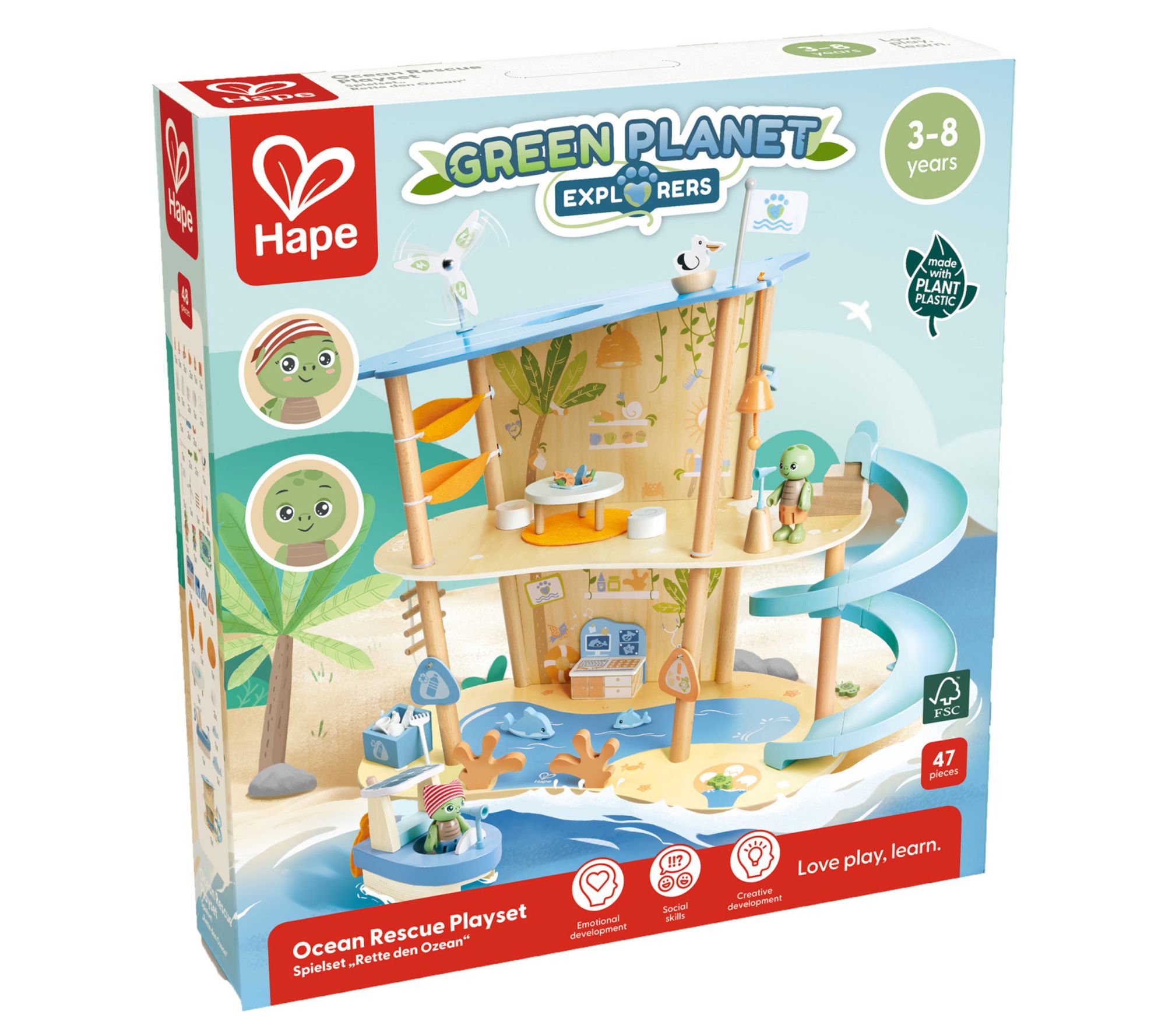 Help your child learn the importance of ocean conservation while having fun with the Hape Green Planet Explorers Ocean Rescue Playset. Watch them dive into adventures, cleaning up the sea and caring for sea creatures with a solar-powered speedboat and a spiral slide. Encourage imaginative play and teach valuable lessons about our environment in a playful, engaging way. From Hape.