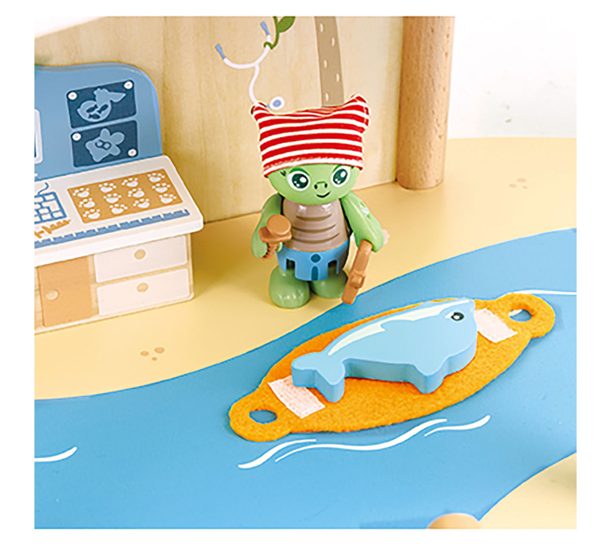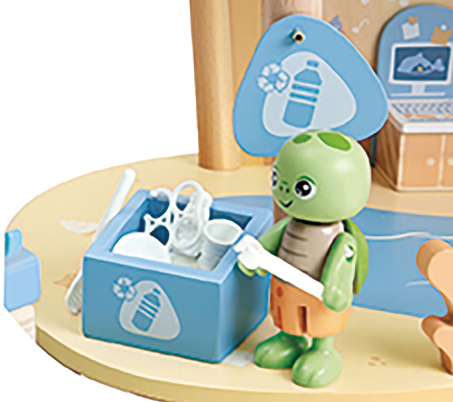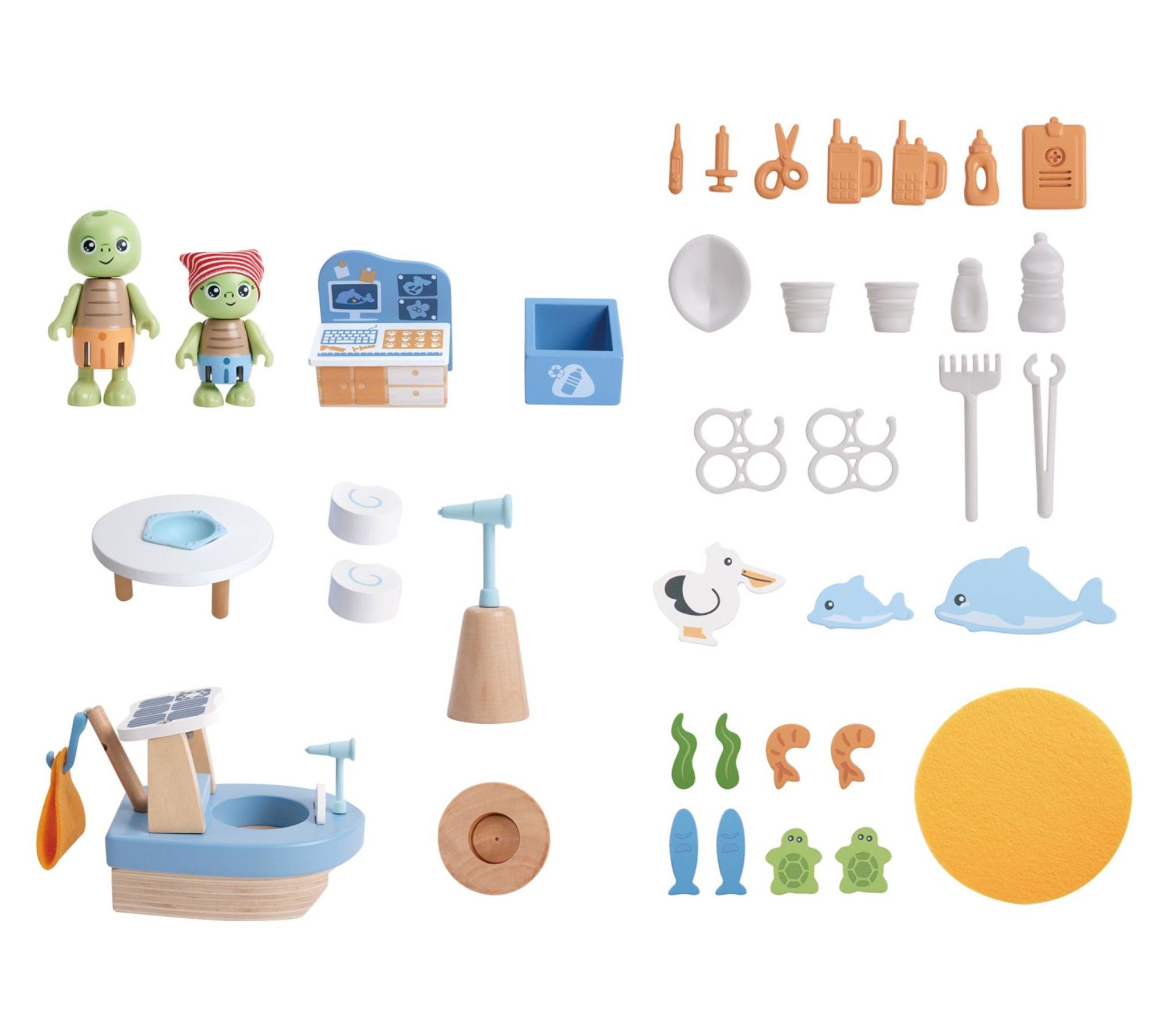 • Includes base with spiral slide, speedboat with felt mat, turning wind turbine, seven rubbish, five ocean animals, two turtle figurines, loads of rescue accessories