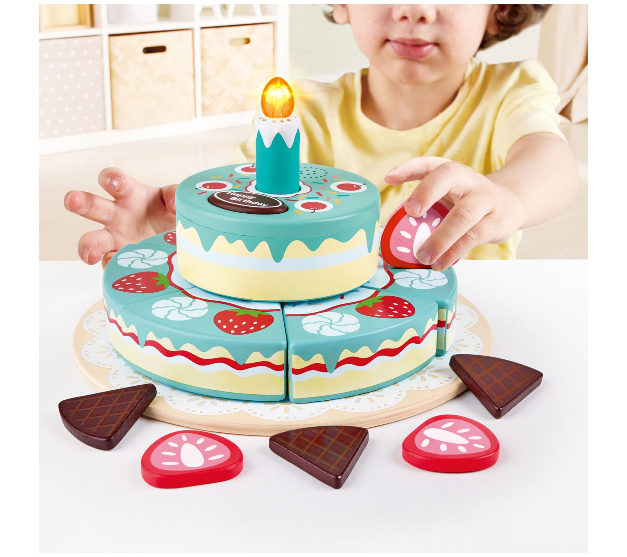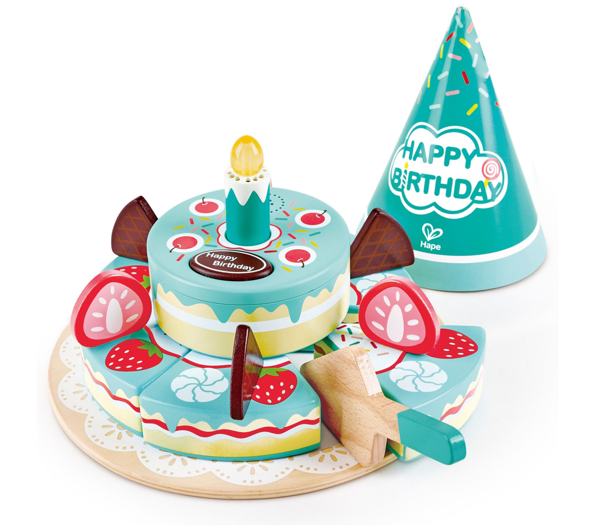 • Includes cake plate, three strawberry slices, three chocolate slices, six cake slices, electronic cake tier with candle, server, and birthday hat