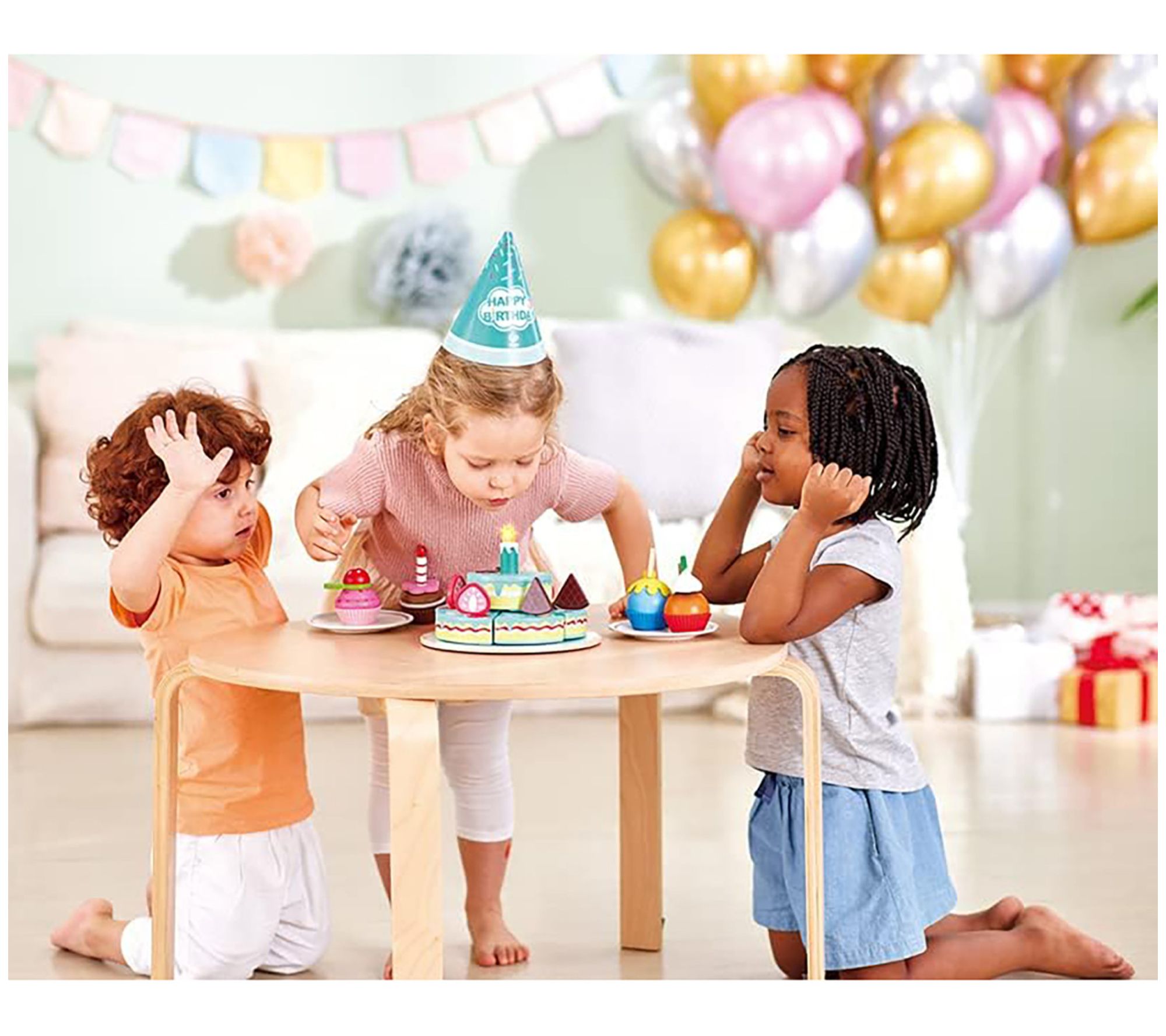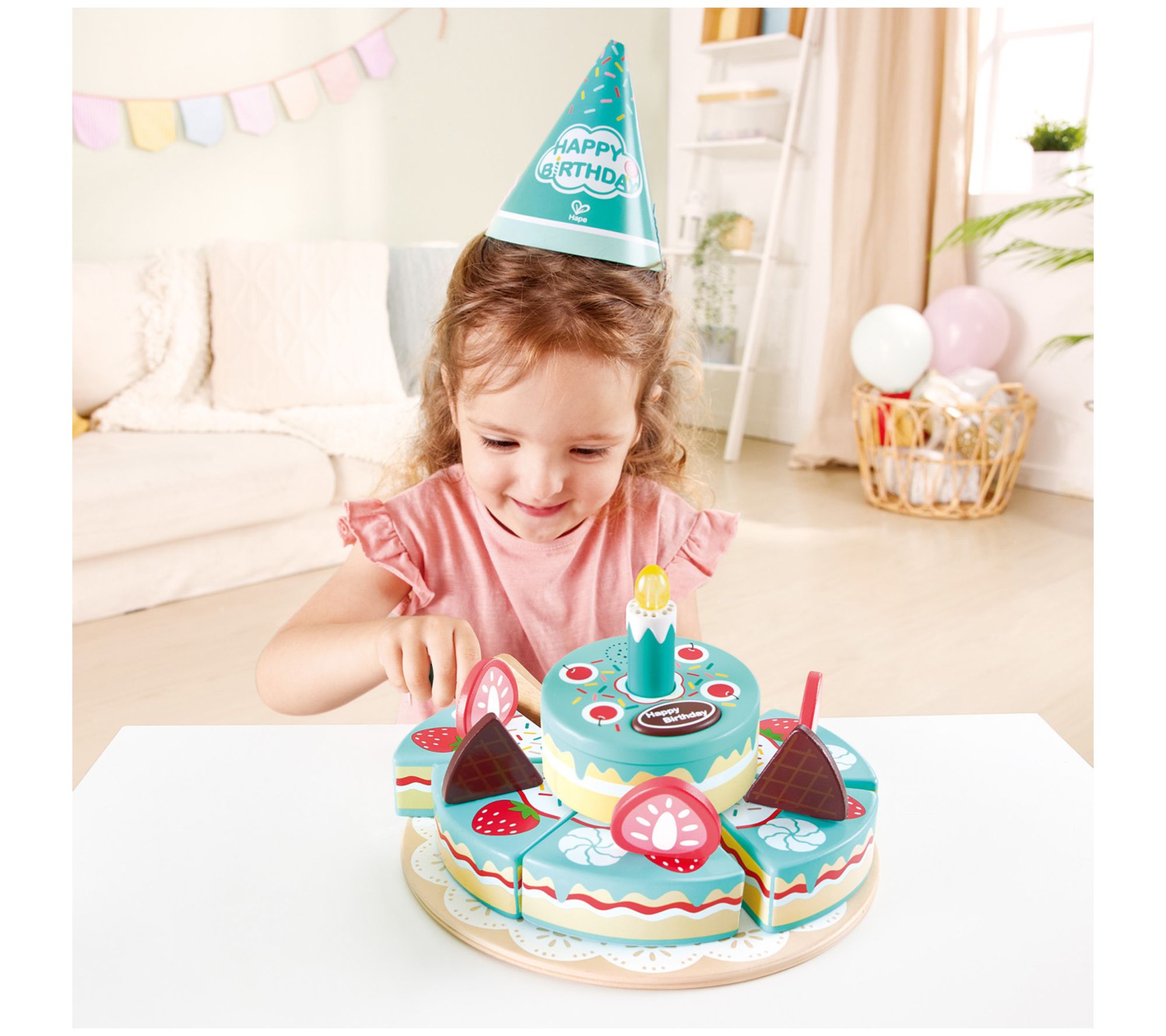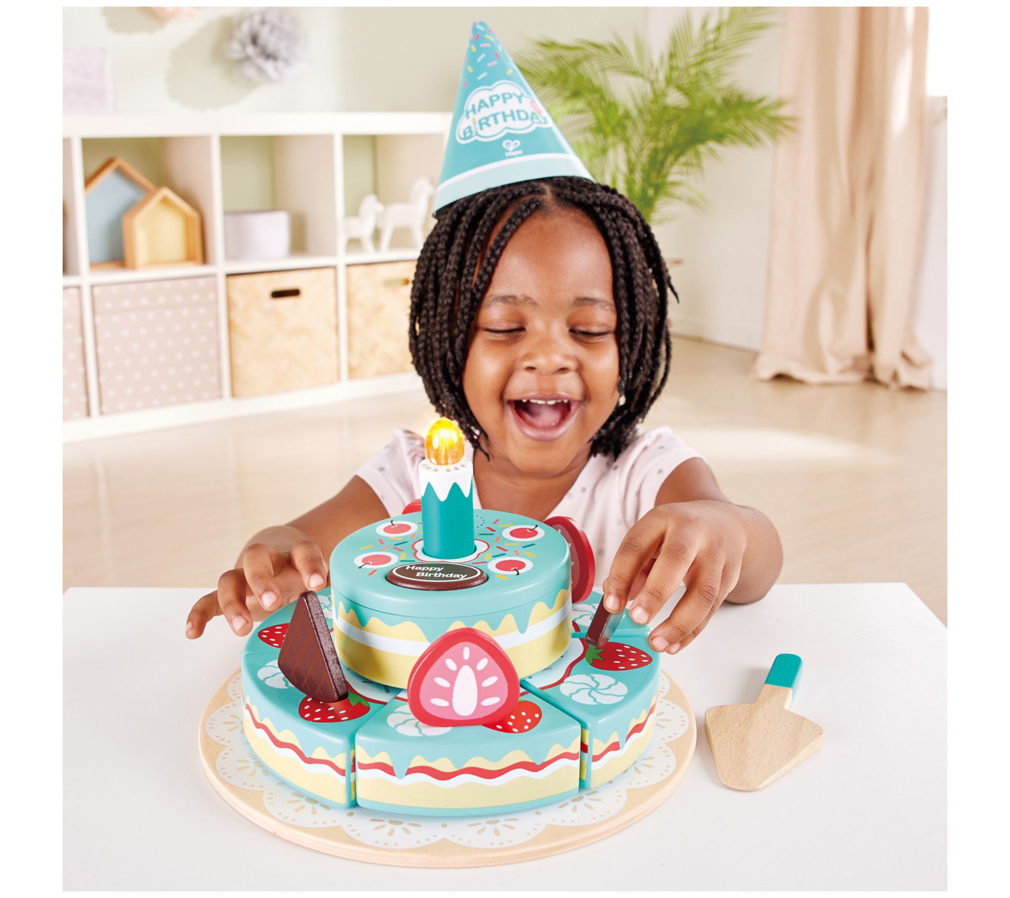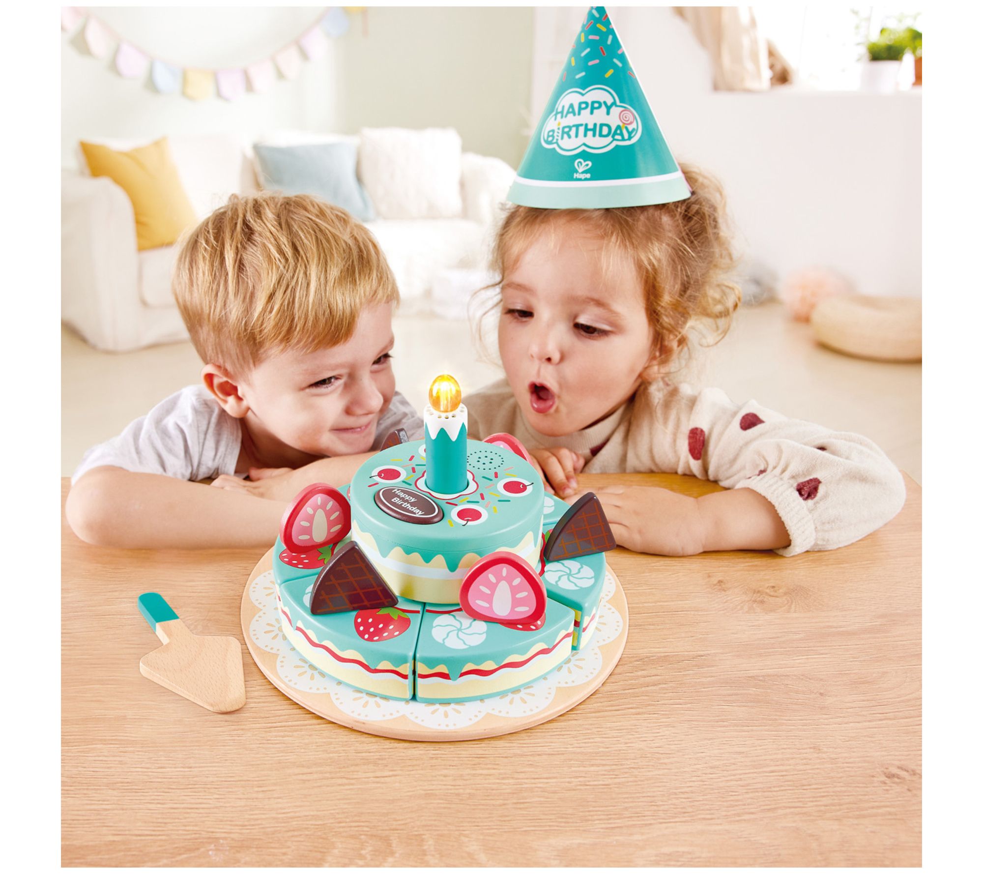 Give your little one's birthday celebration a magical twist with the Hape Interactive Happy Birthday Cake. This delightful playset features fun sound effects and an electric top cake with a candle that lights up and plays the birthday song. Perfect for imaginative play, it includes strawberries, chocolate wafers, and a server for endless cake-cutting fun. From Hape.