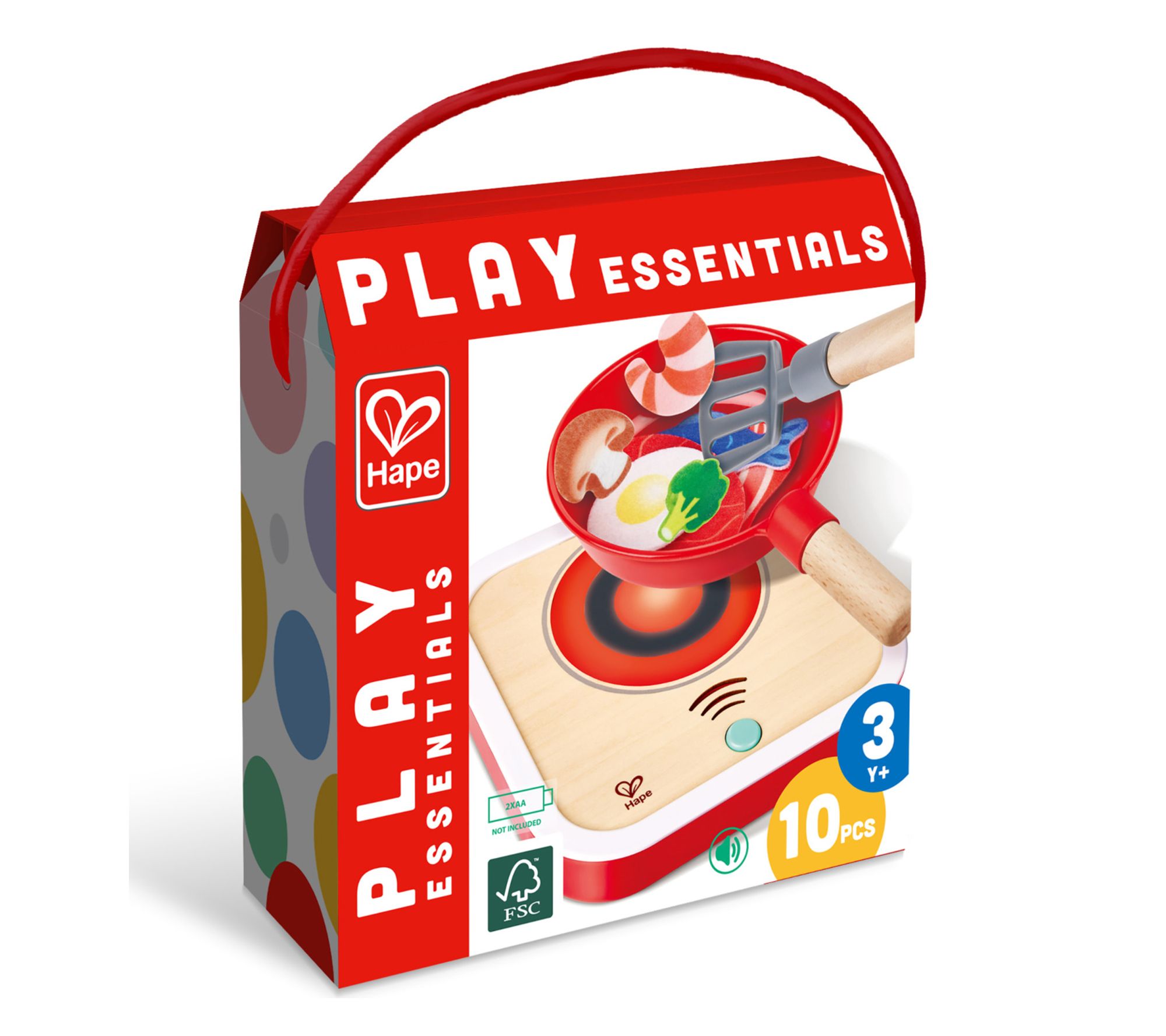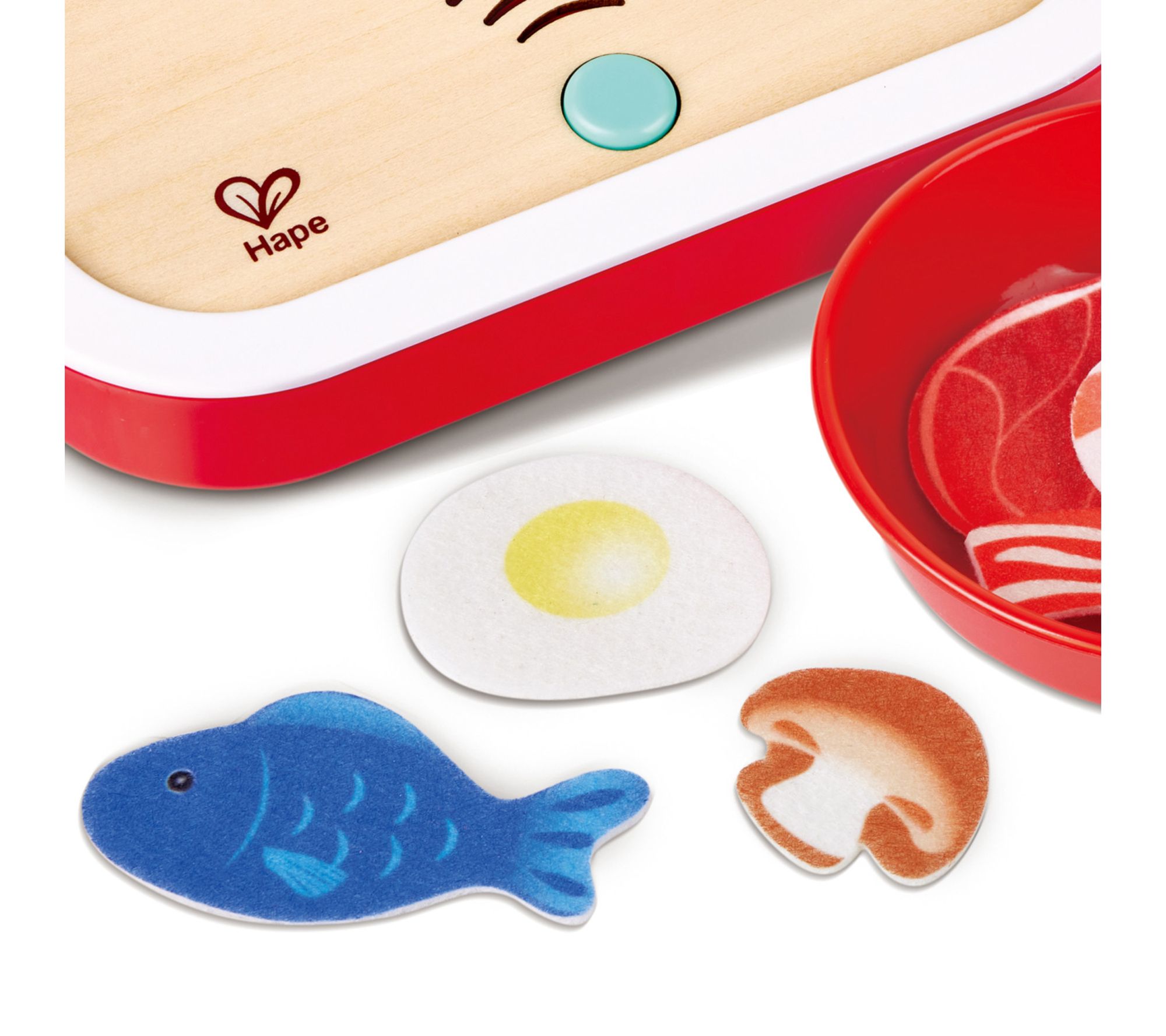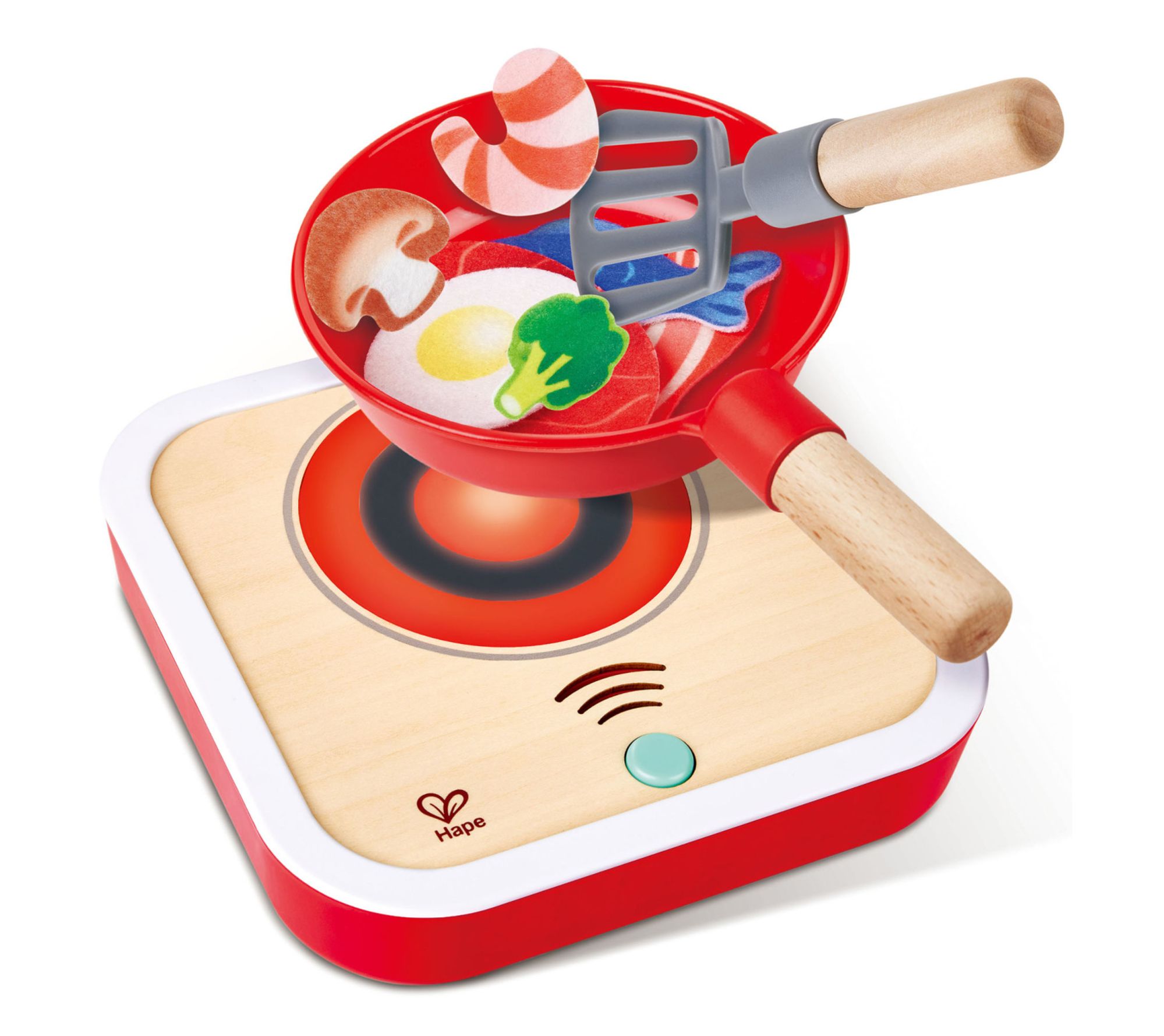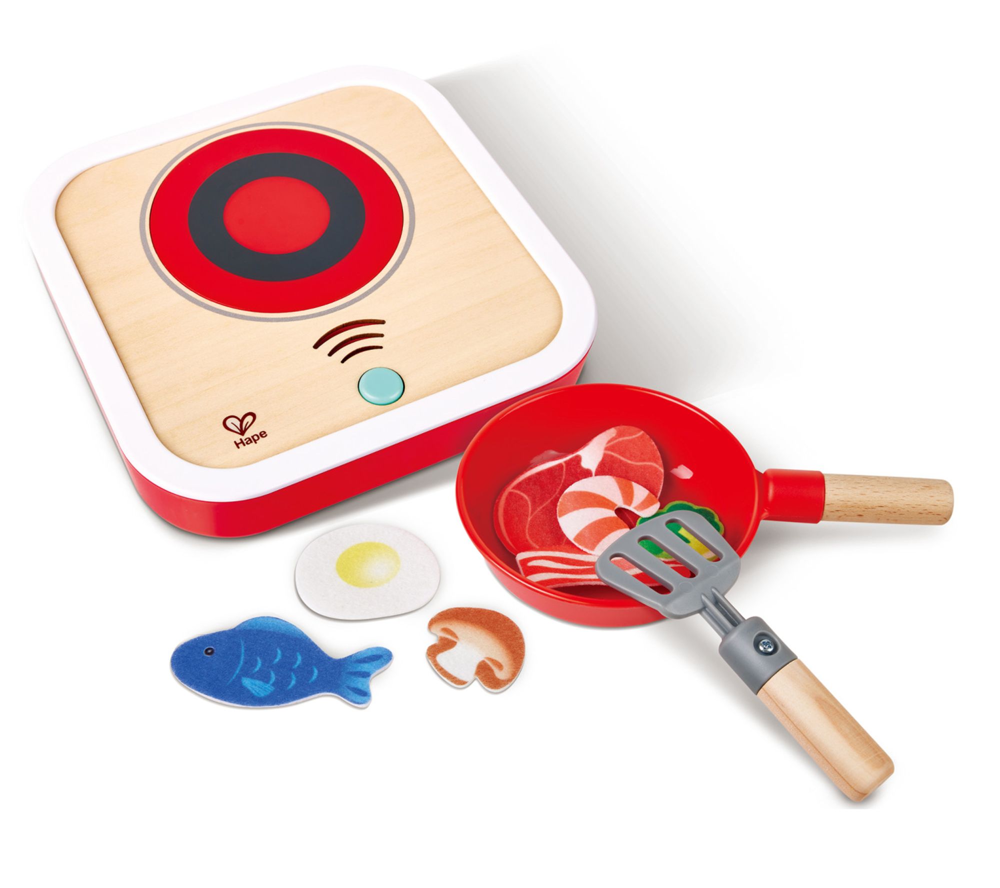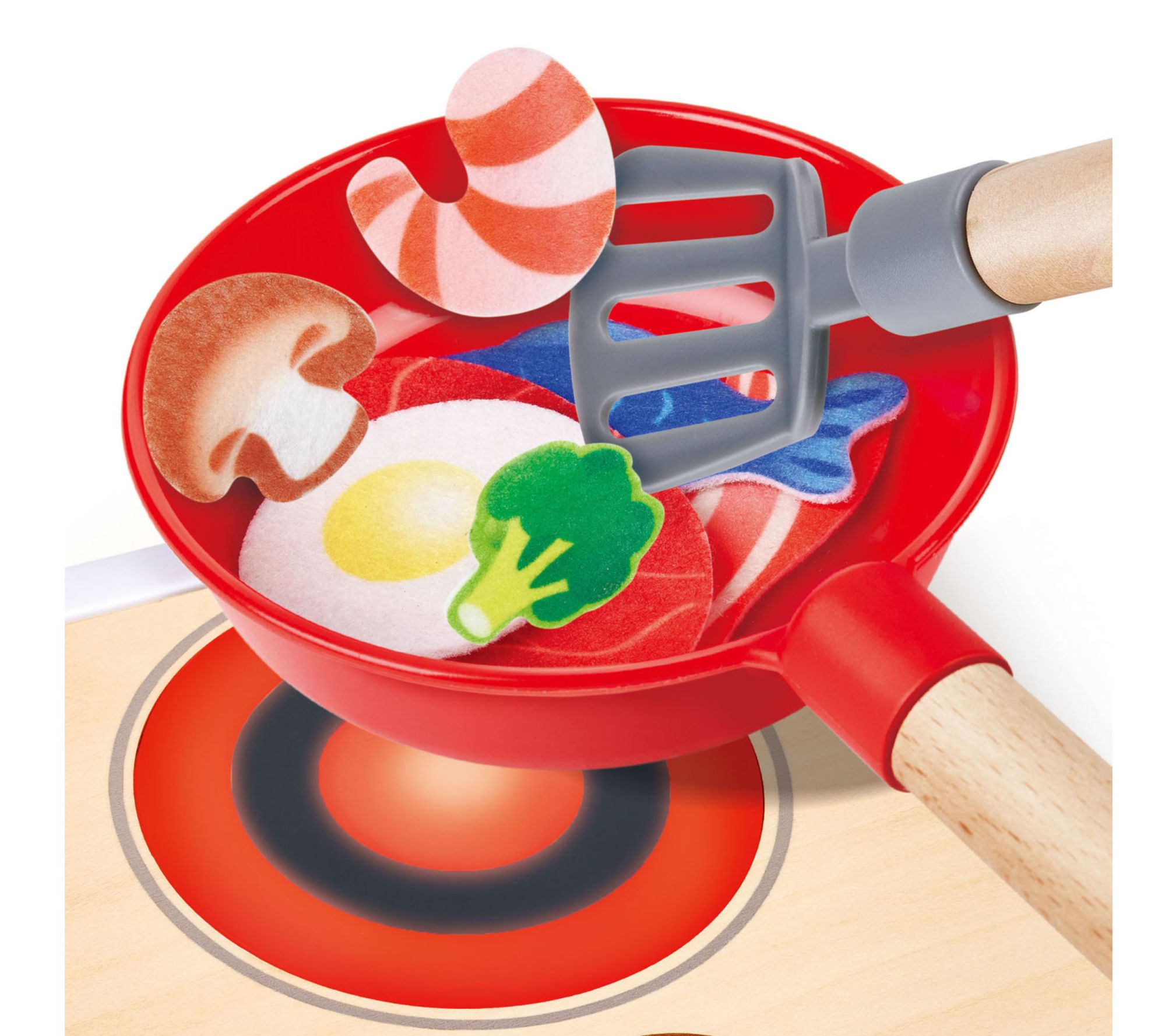 Fuel your child's culinary creativity with the Hape Interactive Stove Play Set. This engaging toy features a stove with light and sound effects, a pan, spatula, and seven pieces of felt food, making it perfect for imaginative play. Watch as the hob glows, flashes, and sizzles, adding realism to their cooking adventures. From Hape.