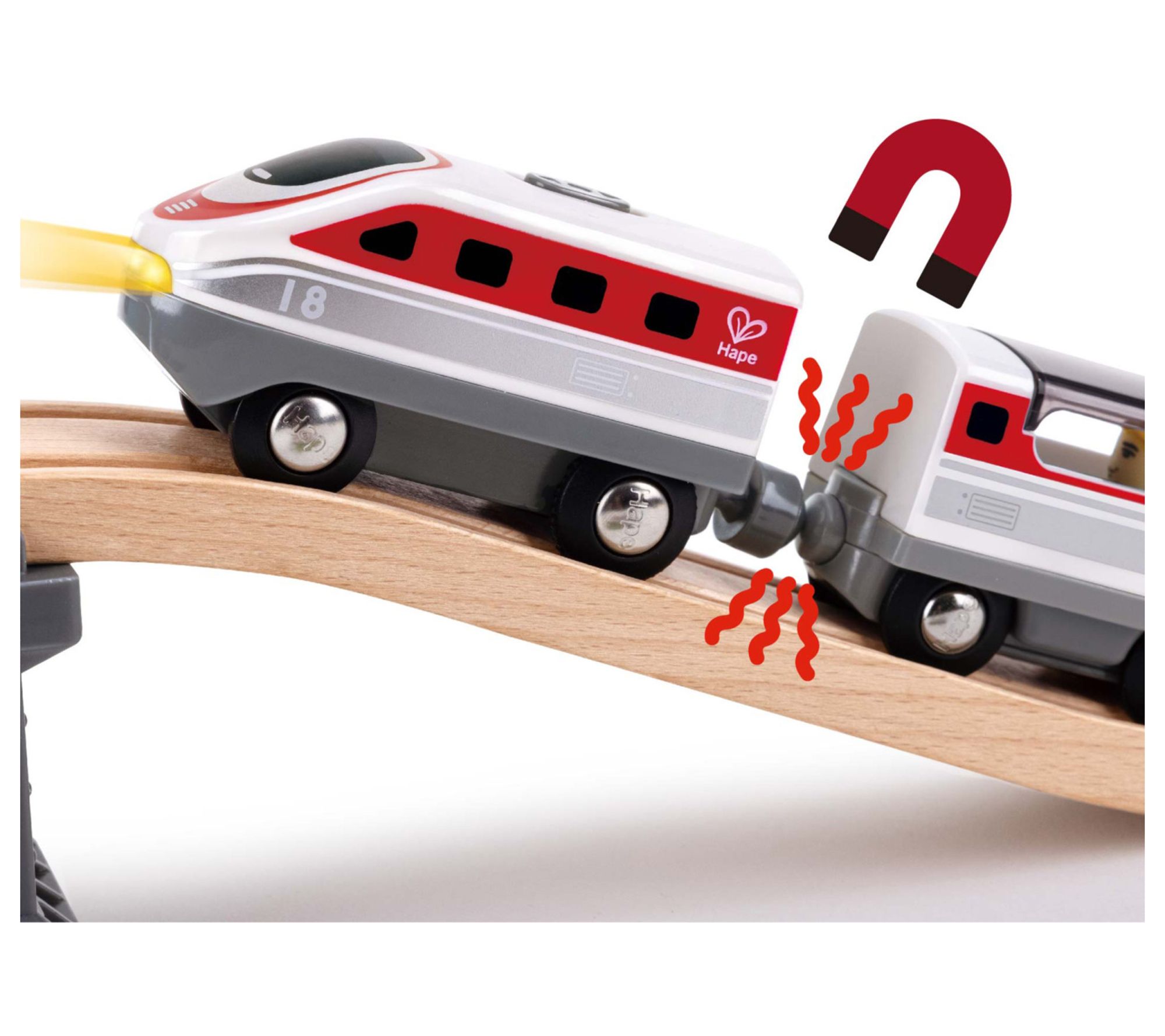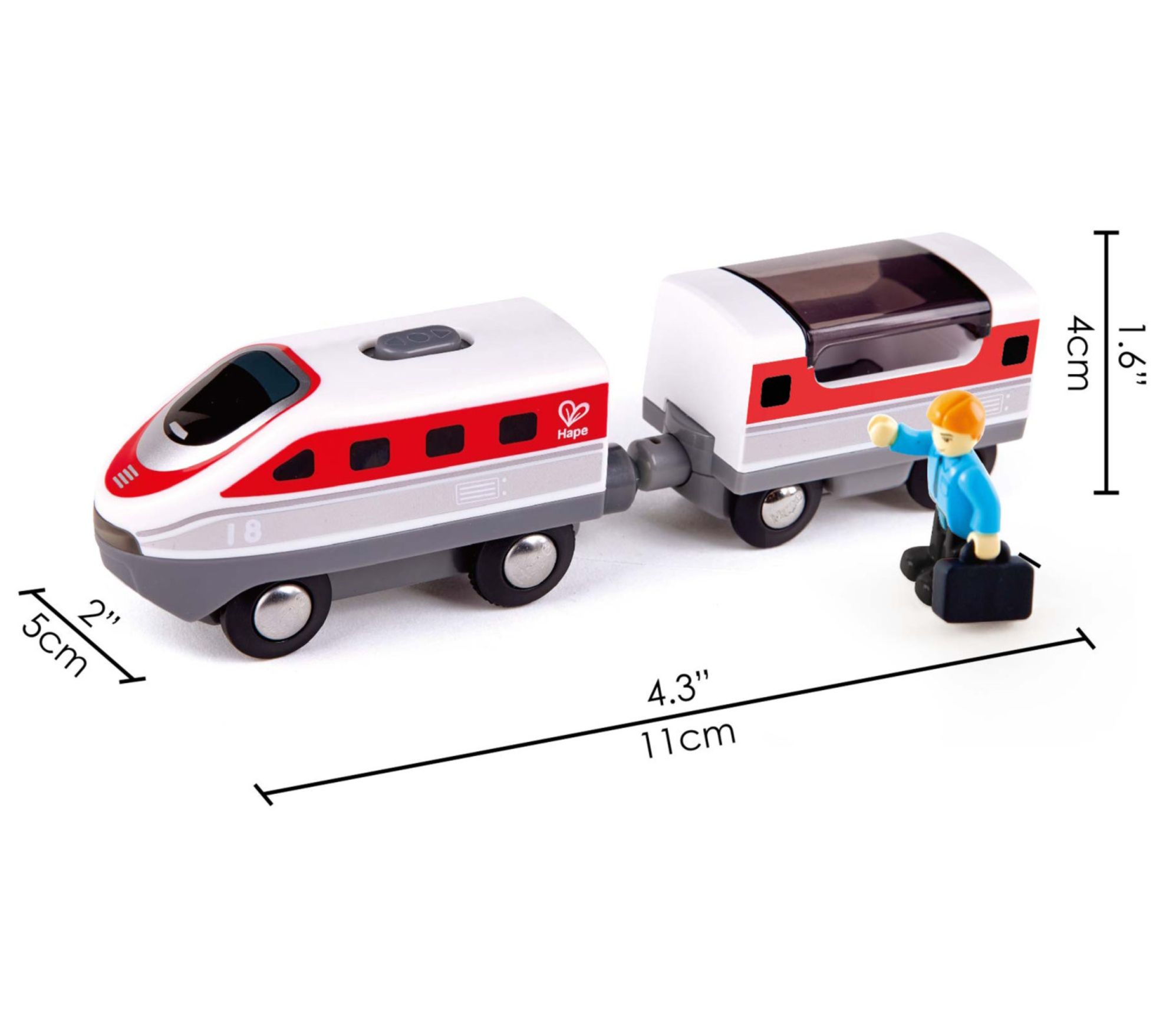 Get ready for endless adventures with the Hape intercity battery-powered train set. This engaging set includes an engine, train car, passenger, and briefcase, perfect for imaginative play. Watch the train move forward and backward with the touch of a button, connecting with other carriages using the magnetic joint. Designed to ignite creativity, it's the perfect addition to any playroom. From Hape.