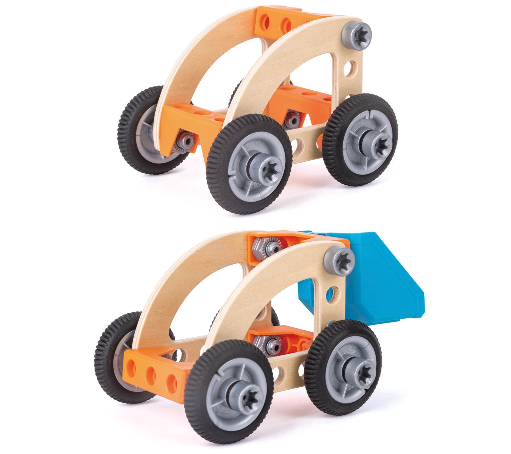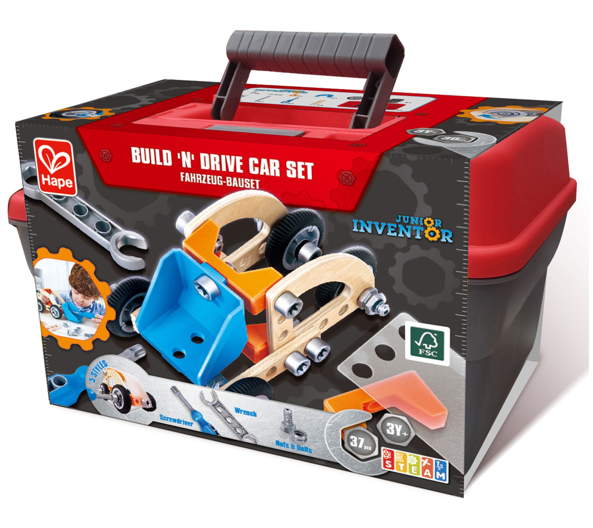 Unleash creativity with the Hape Junior Inventor build 'n' drive car set. Perfect for budding engineers, this set includes everything needed to construct a vehicle, from wooden pieces to safe, easy-to-use tools. Kids can build one of five cars or invent their own design, enhancing problem-solving and fine motor skills. Once assembled, the car is ready to zoom around, sparking imagination and fun. From Hape.