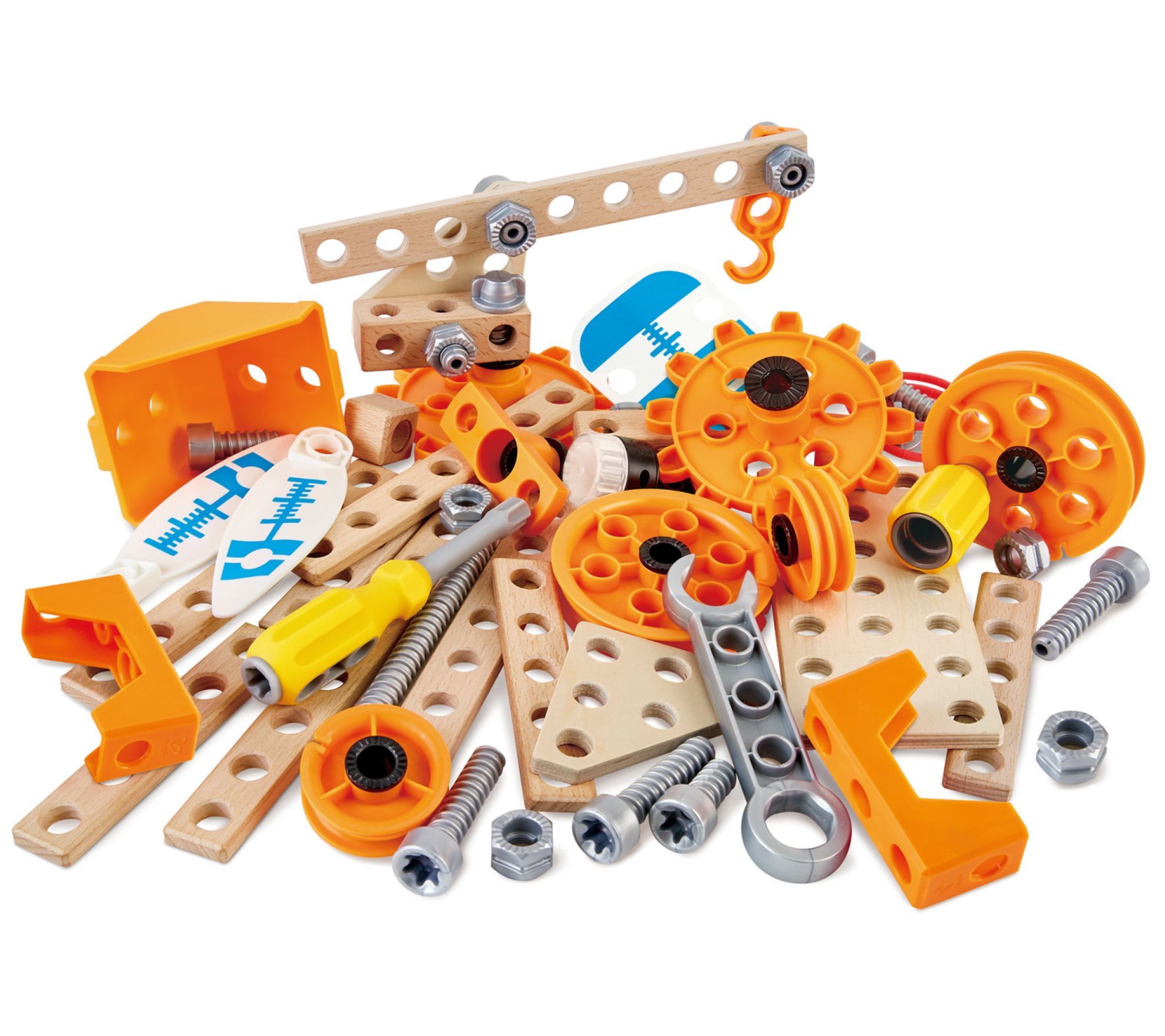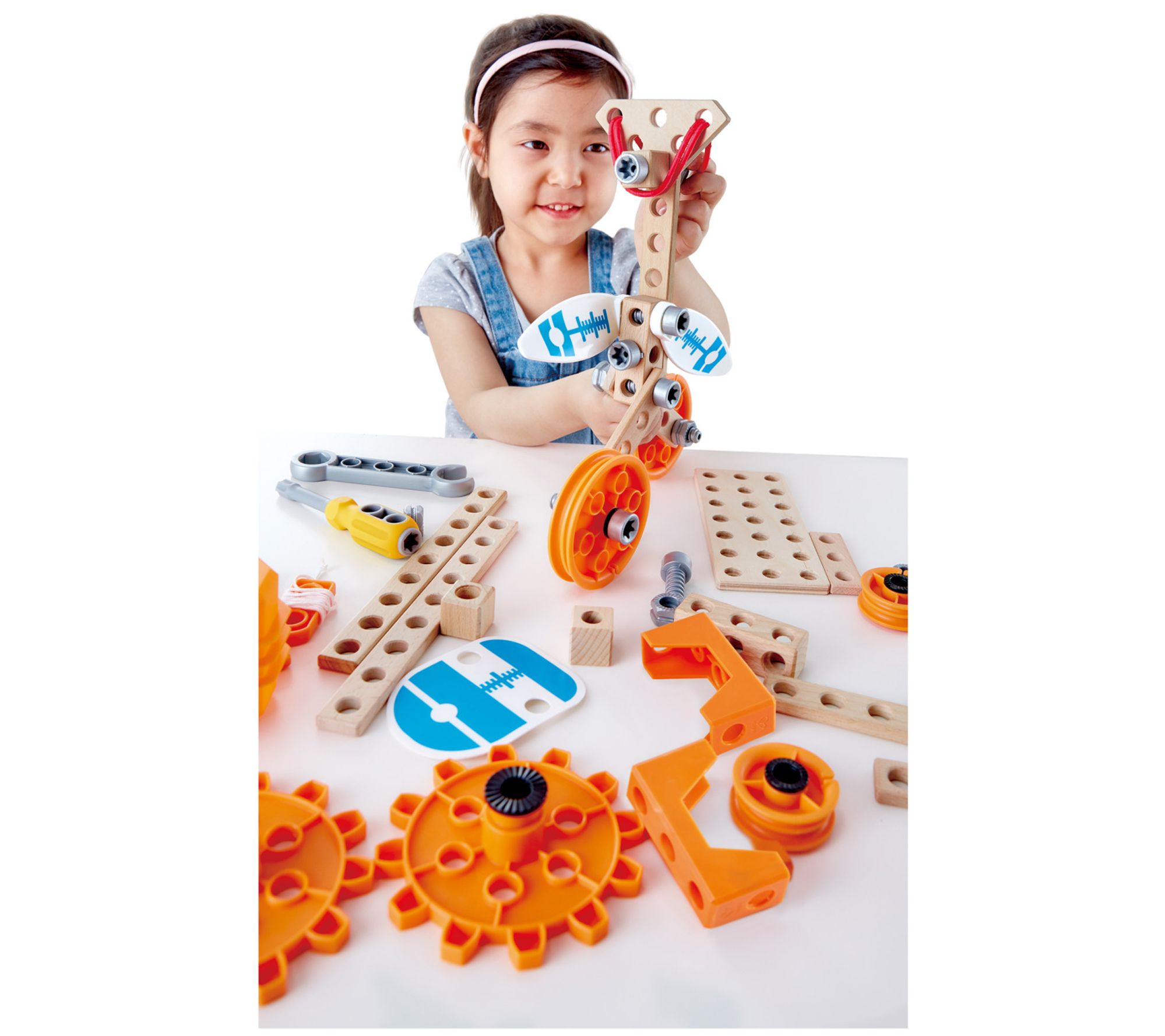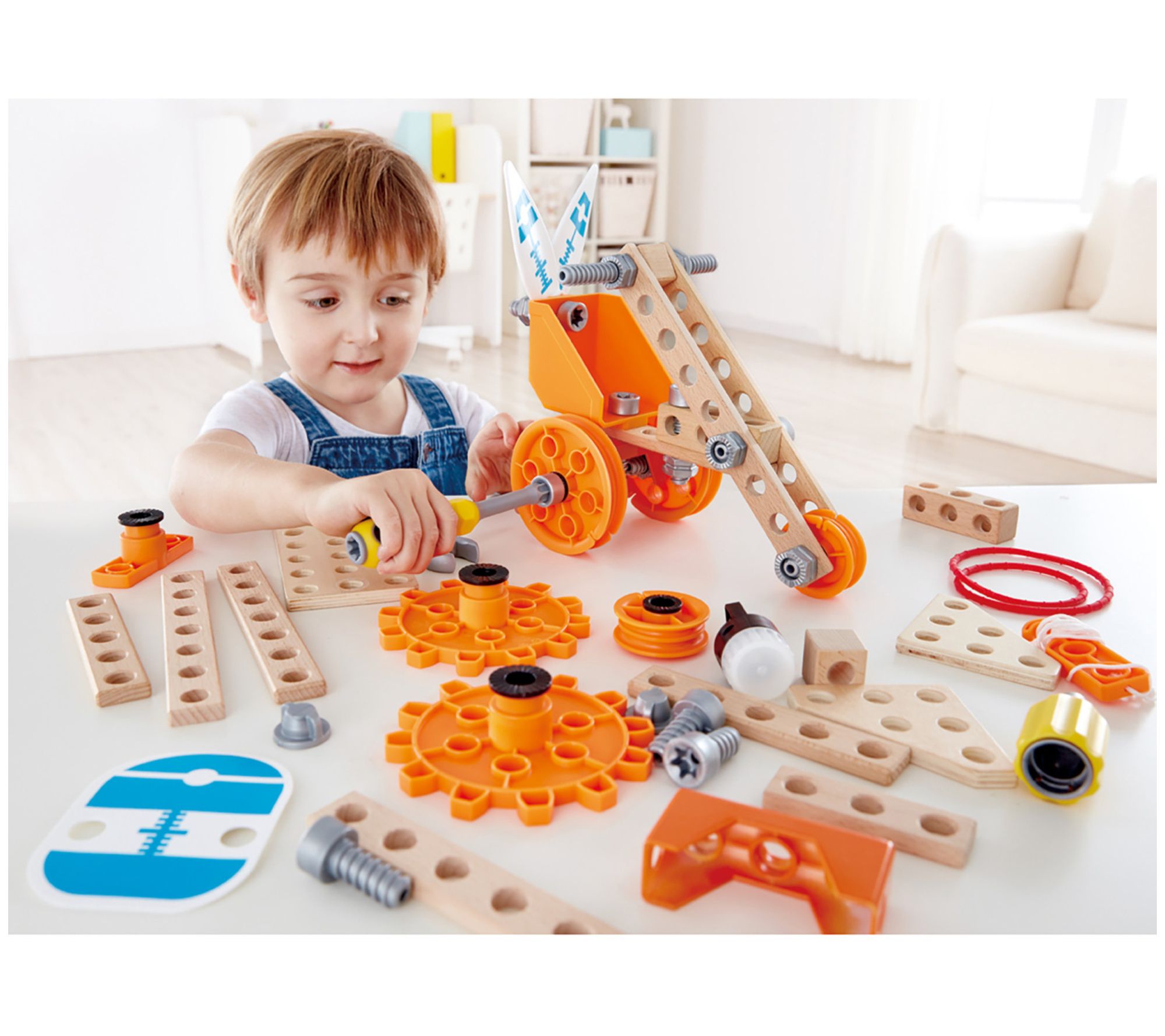 Unleash your child's creativity with the Hape Junior Inventor deluxe experiment kit. This engaging set includes 57 pieces like pulleys, propellers, and an LED light, providing endless opportunities for imaginative building. With inspiration cards and tools designed for small hands, it's perfect for budding inventors. From Hape.