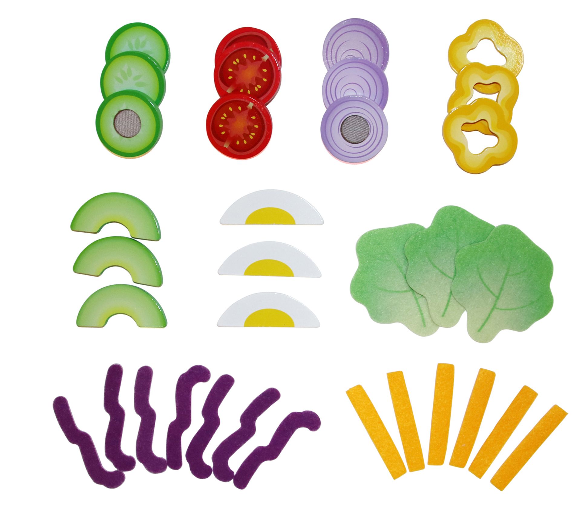 • Includes salad bowl with spoon and fork, realistic play knife, two bottles of dressing, eggs, avocado, cucumber, tomato, onions, and assorted vegetable pieces