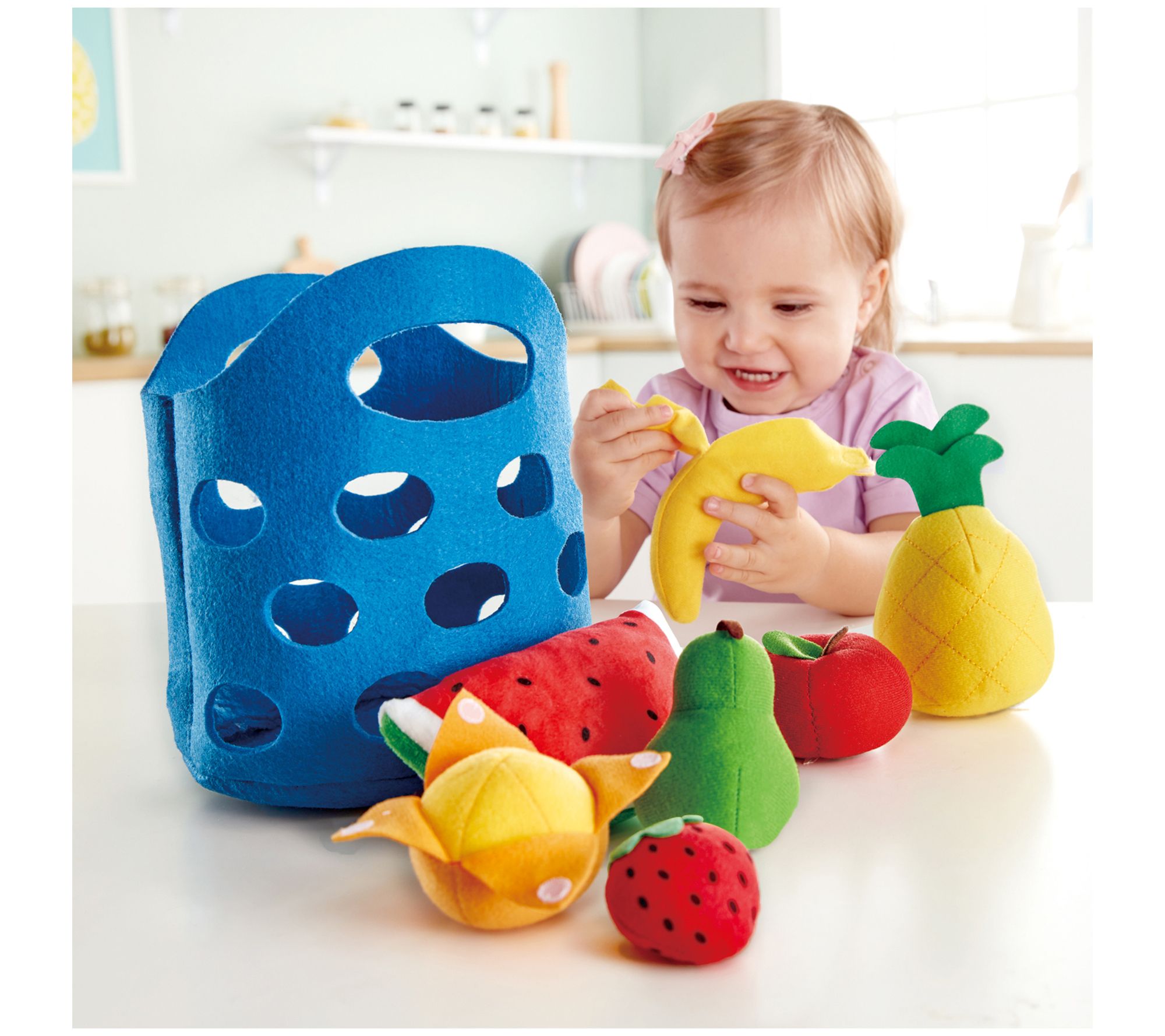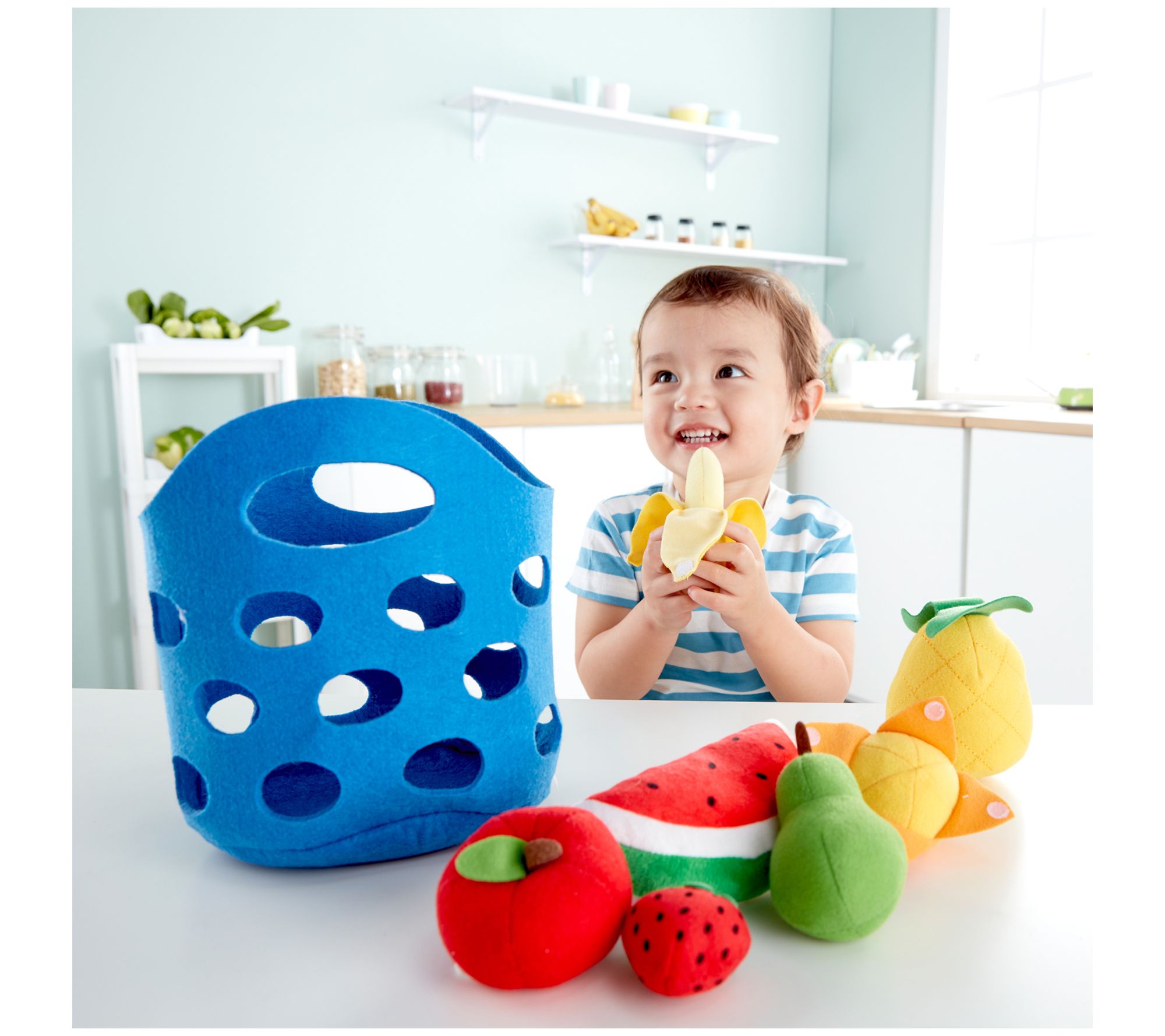 Your little one will be set for a day of imaginative play with this food basket playset featuring peelable fruit made in soft felt. From Hape International Inc.