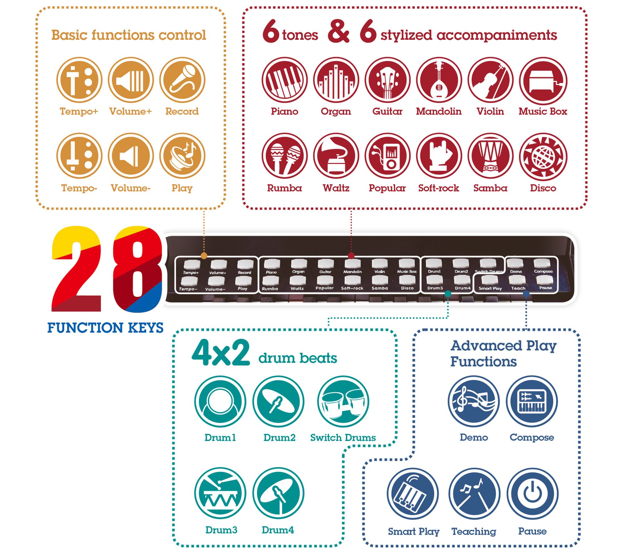 • Six tunes and eight drumbeats with adjustable tempos