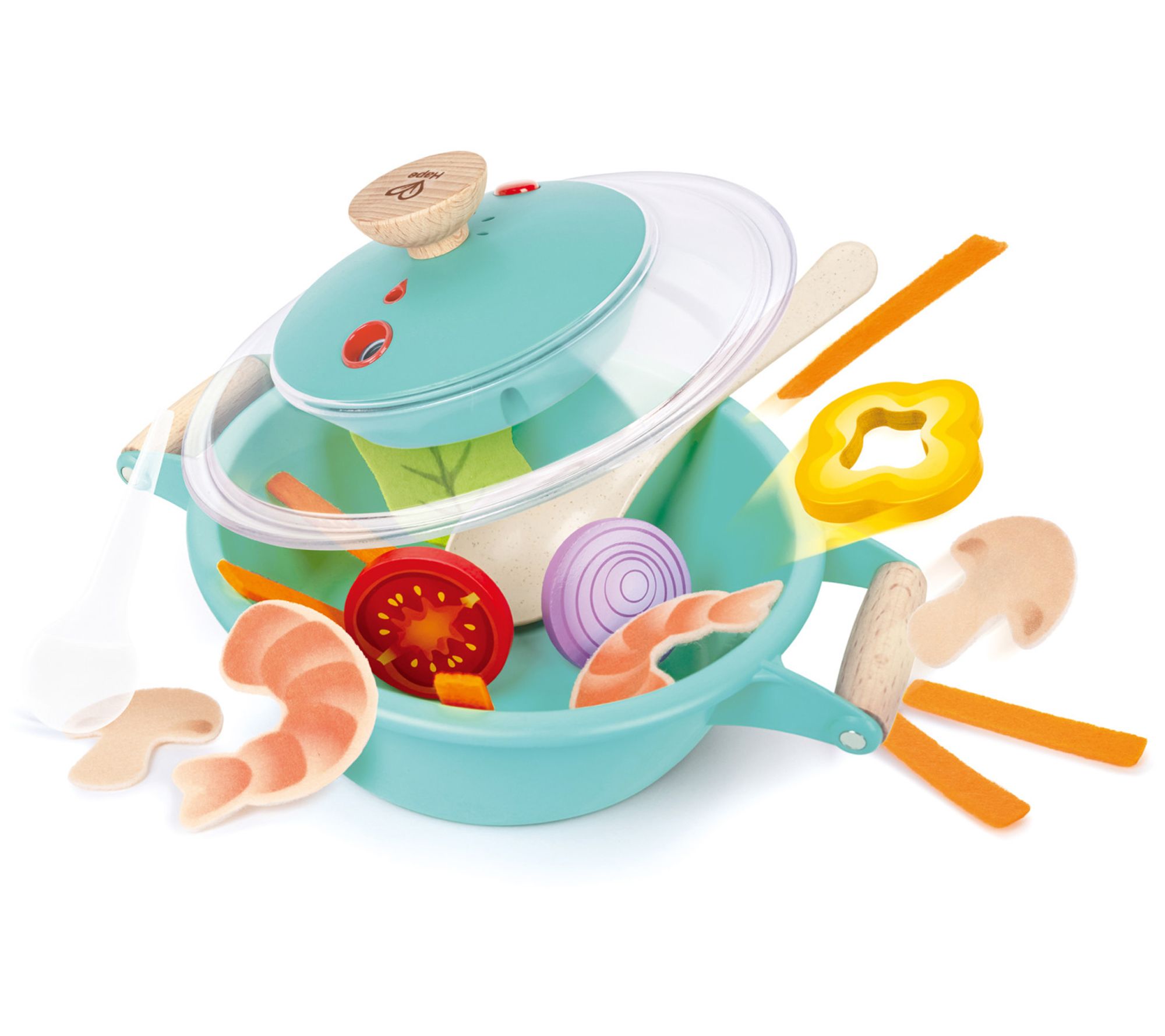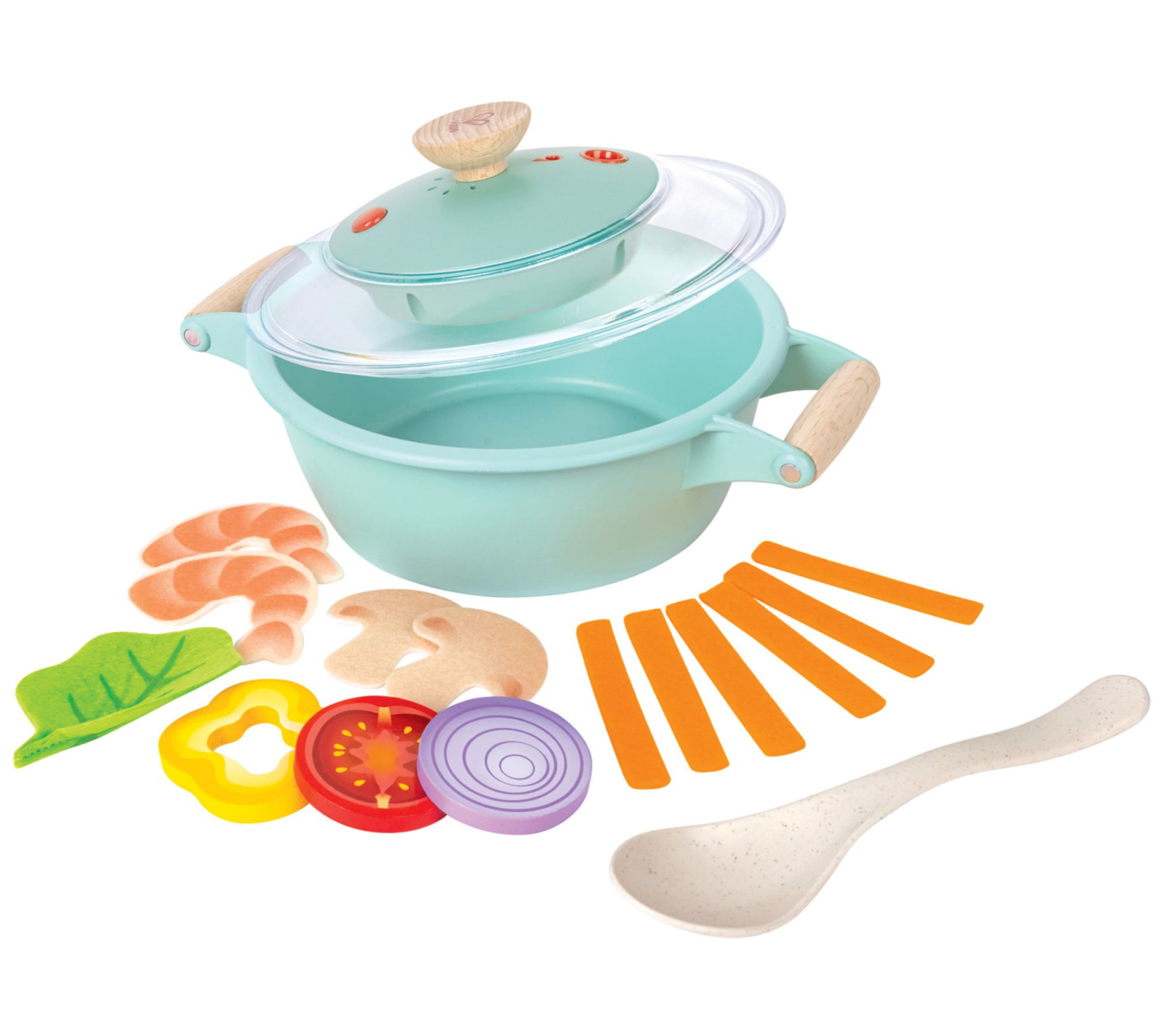 • Includes pot with lid, spoon, yellow pepper slice, onion piece, tomato slice, lettuce leaf, prawns, mushroom, six carrot slices