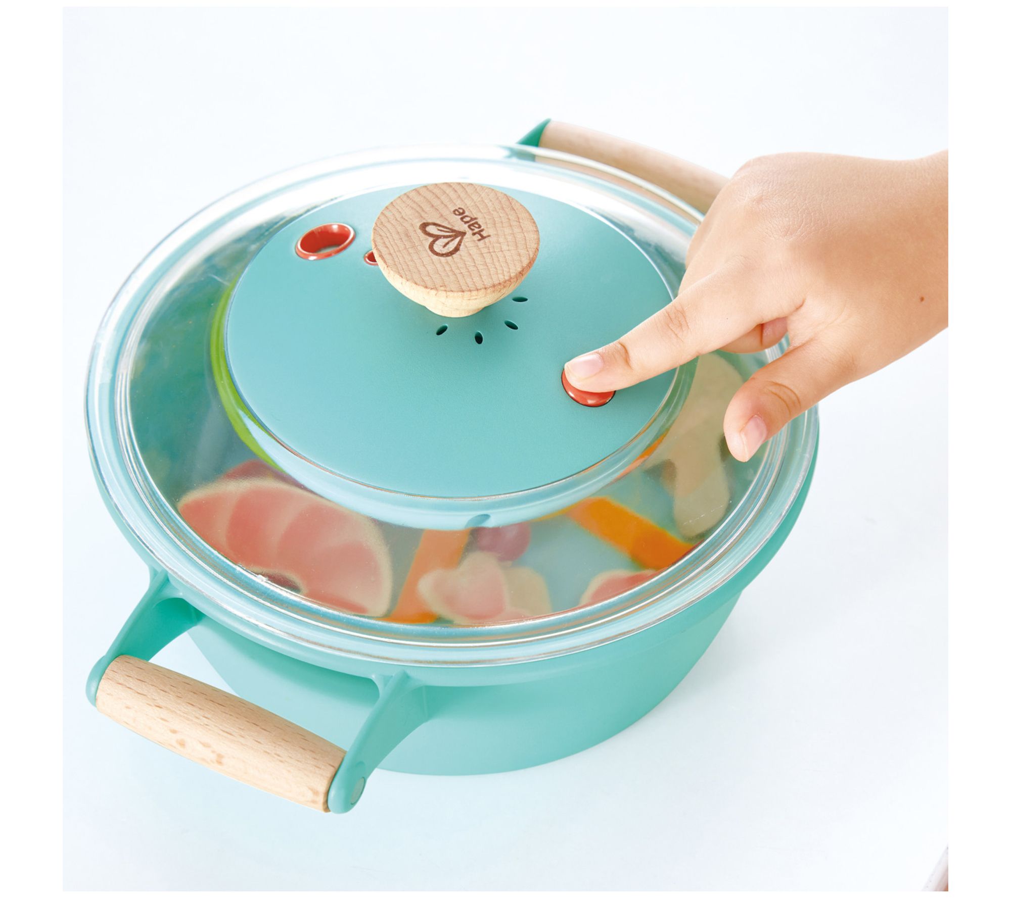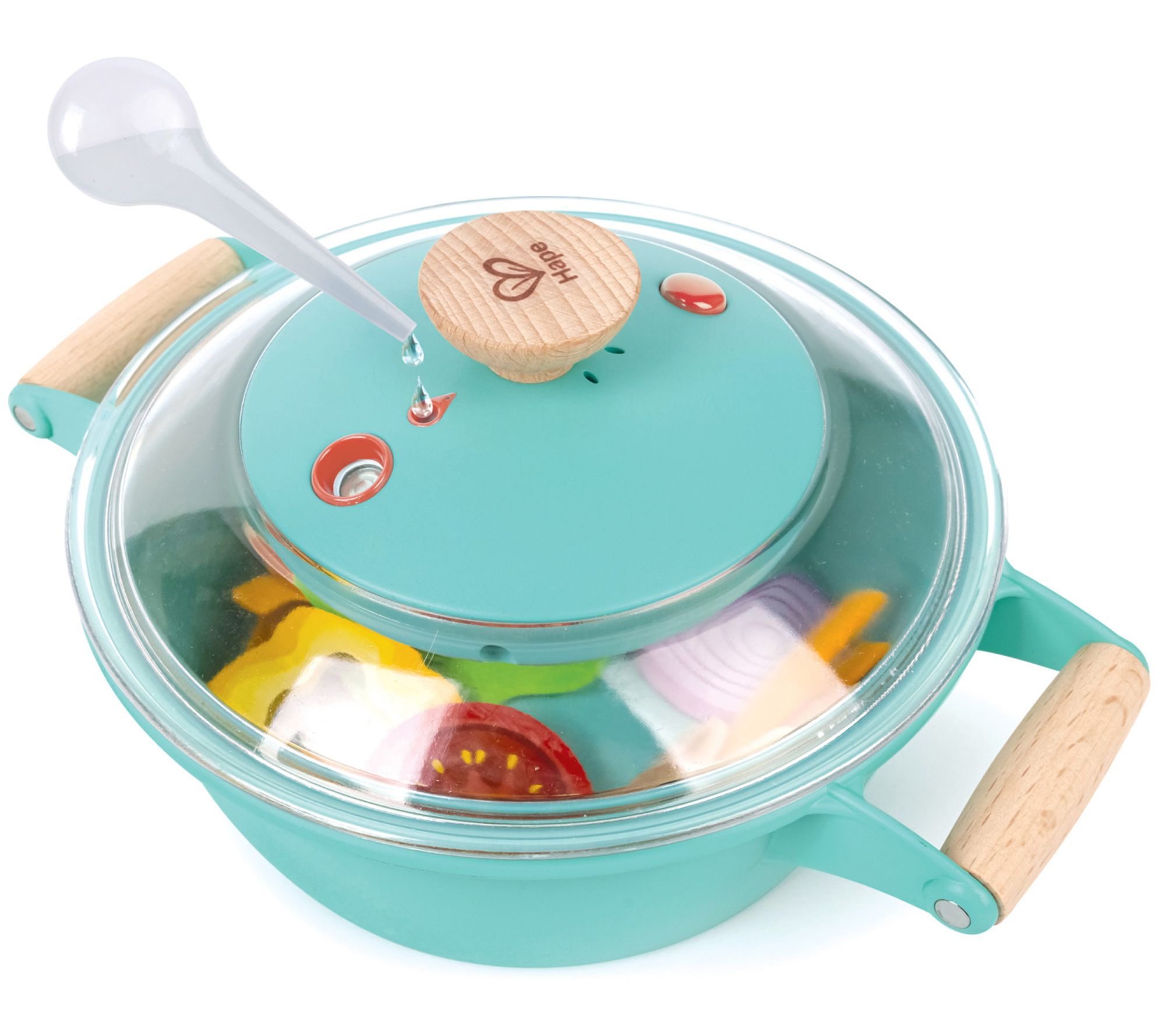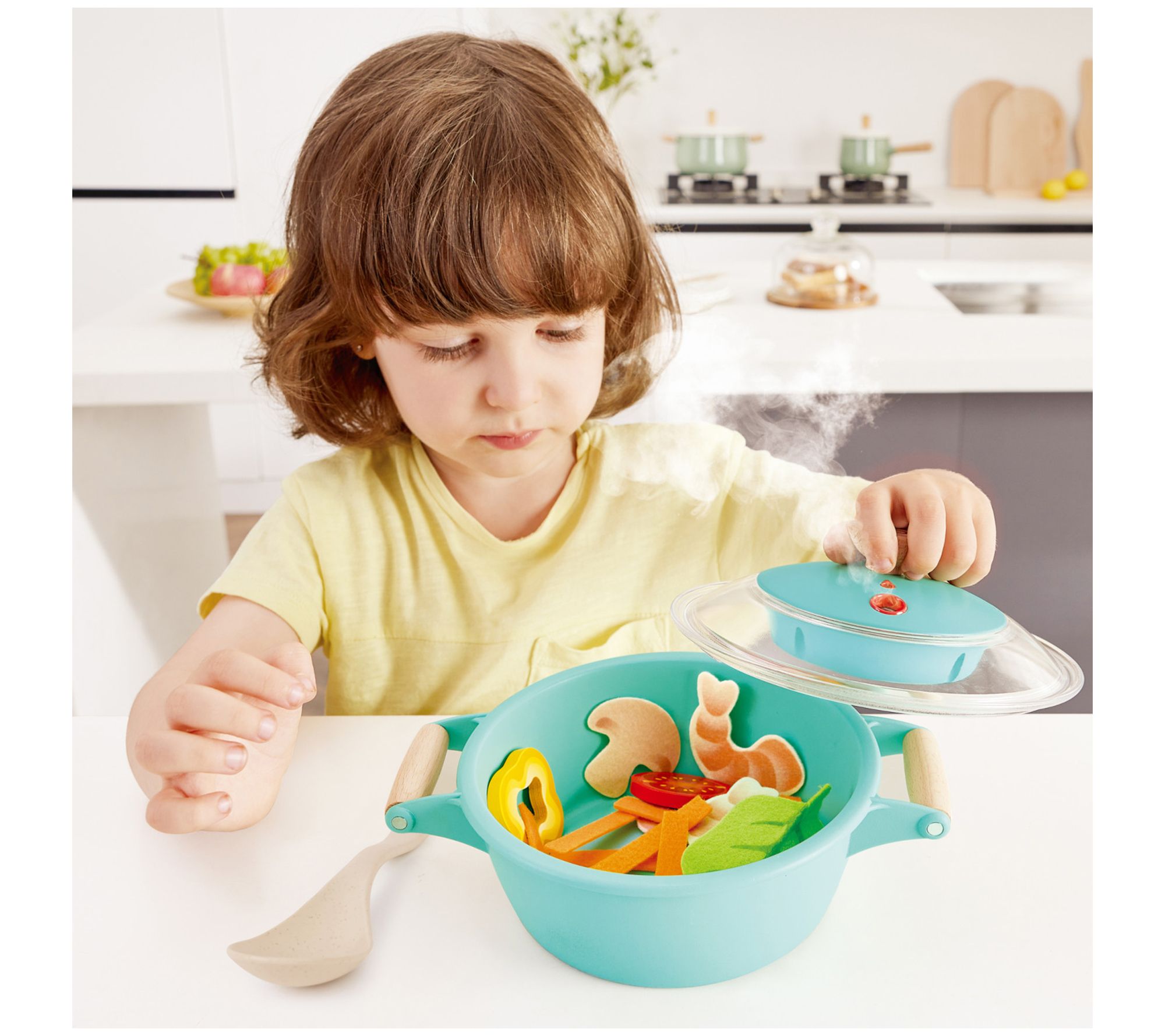 Cook up some fun with the Hape Little Chef cooking steam playset. This interactive toy lets kids mimic real cooking with a pot that emits cool mist, creating a realistic steam effect. Complete with veggies and prawns, it's perfect for sparking culinary creativity and enhancing fine motor skills. From Hape.