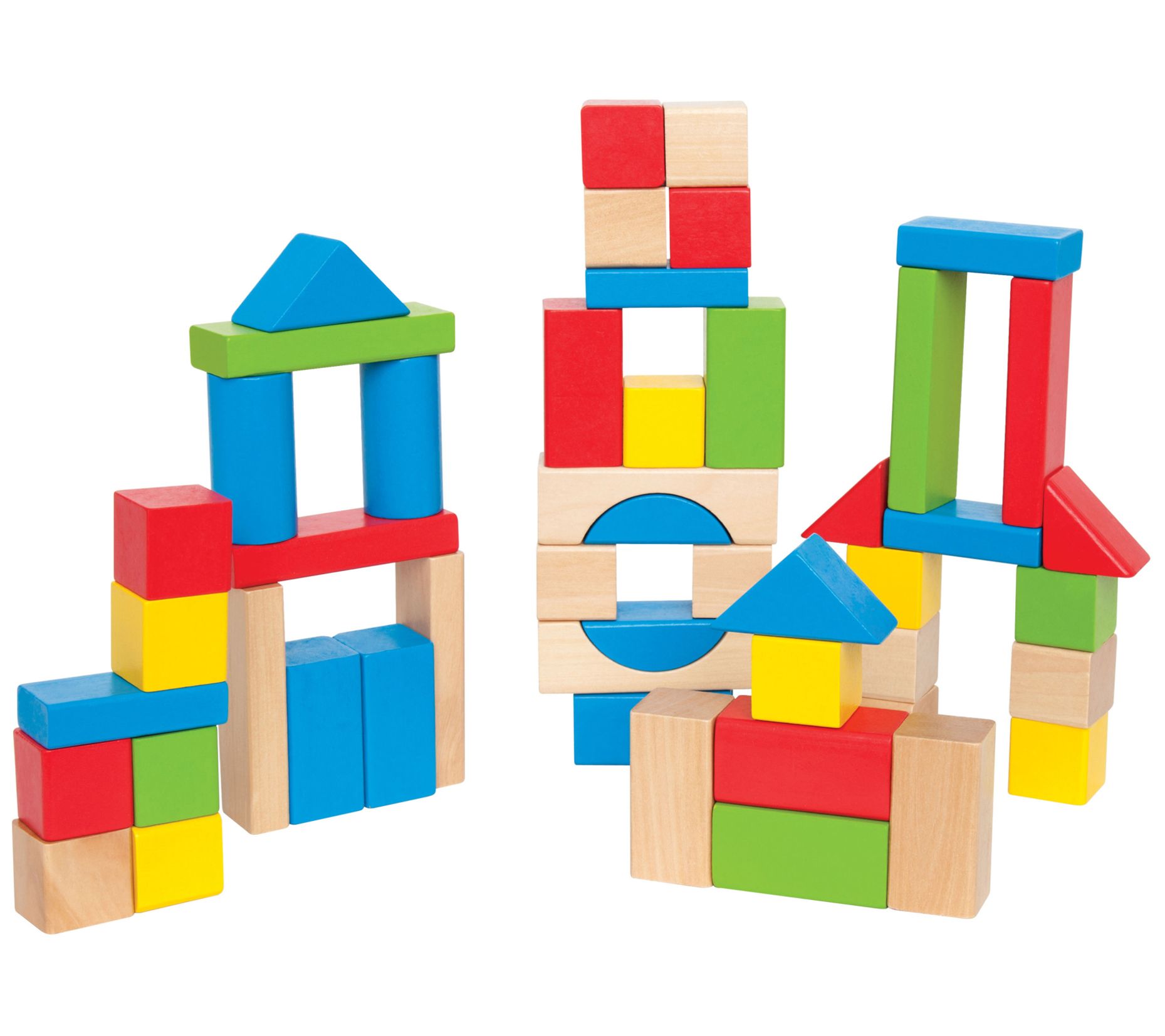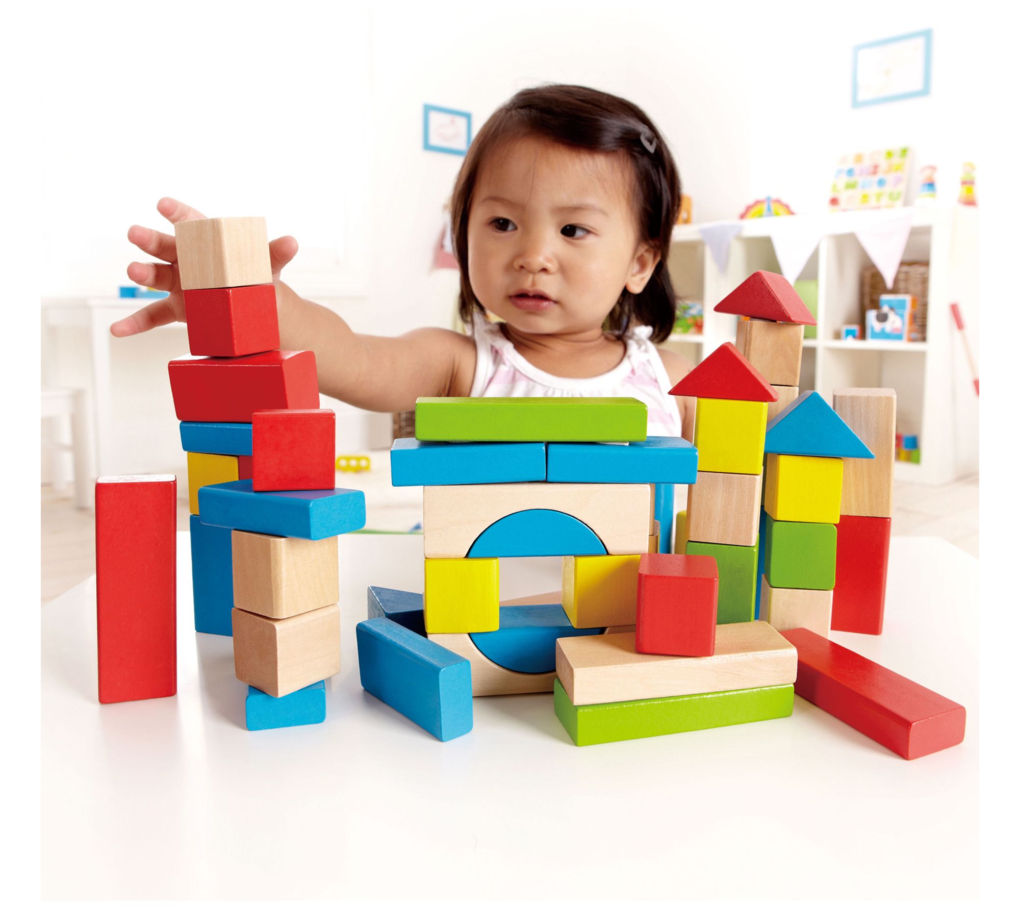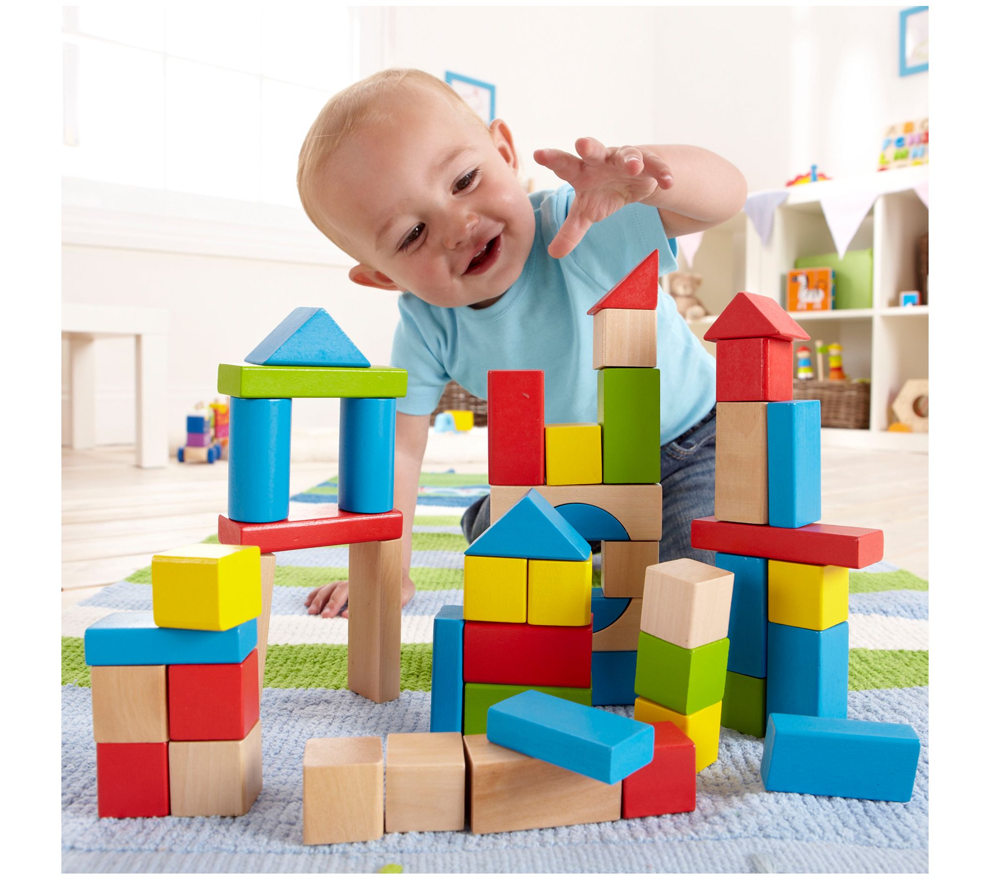 Help their imaginations soar! This set of 50 wooden blocks gives little ones a classic way to explore shapes, build structures, and practice their fine motor skills. From Hape International, Inc.