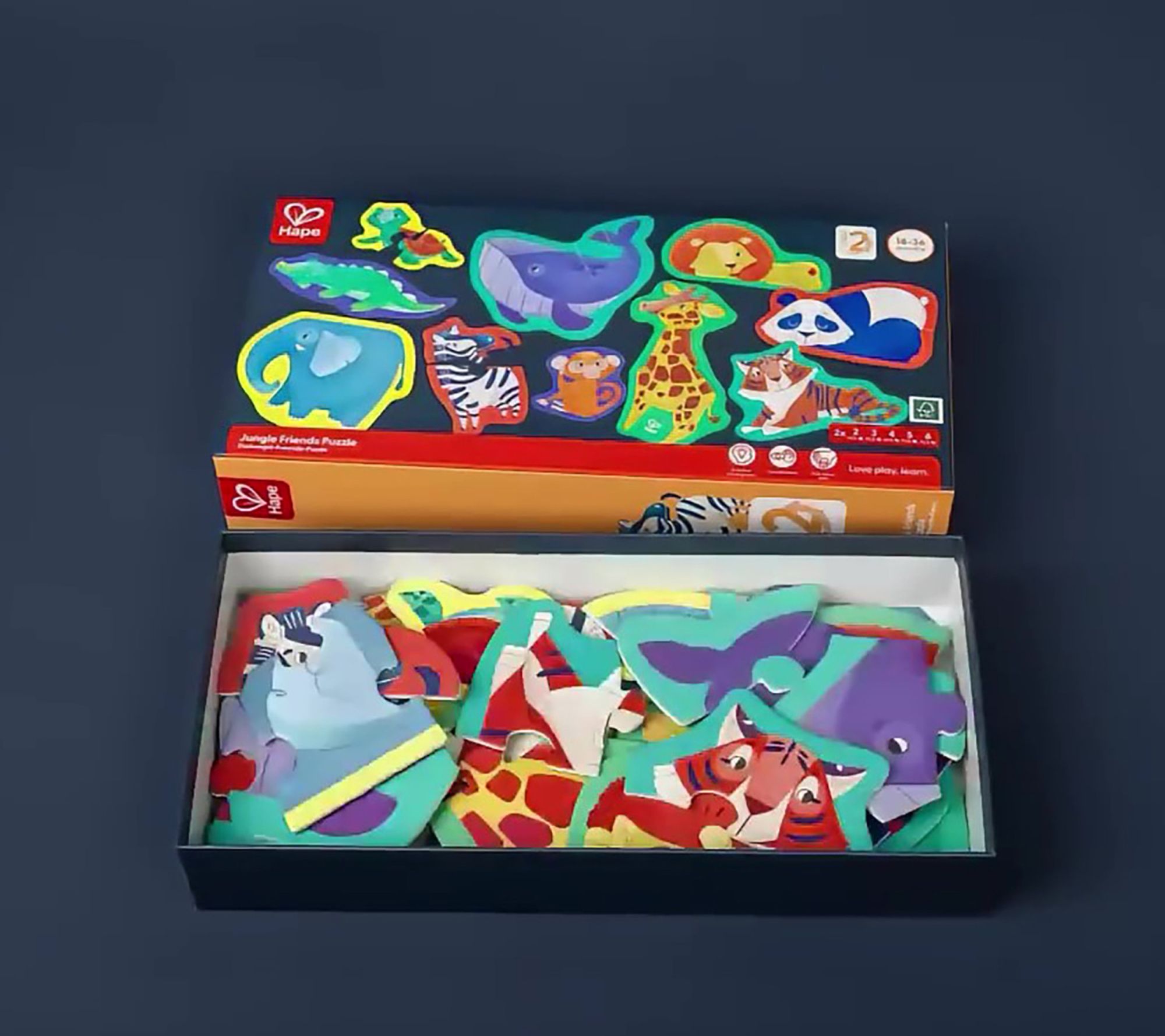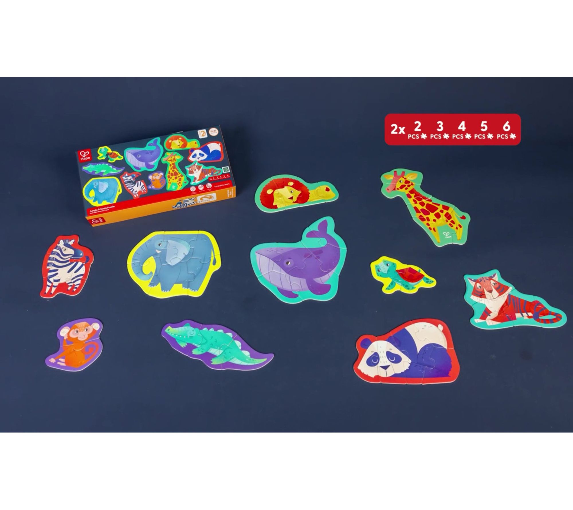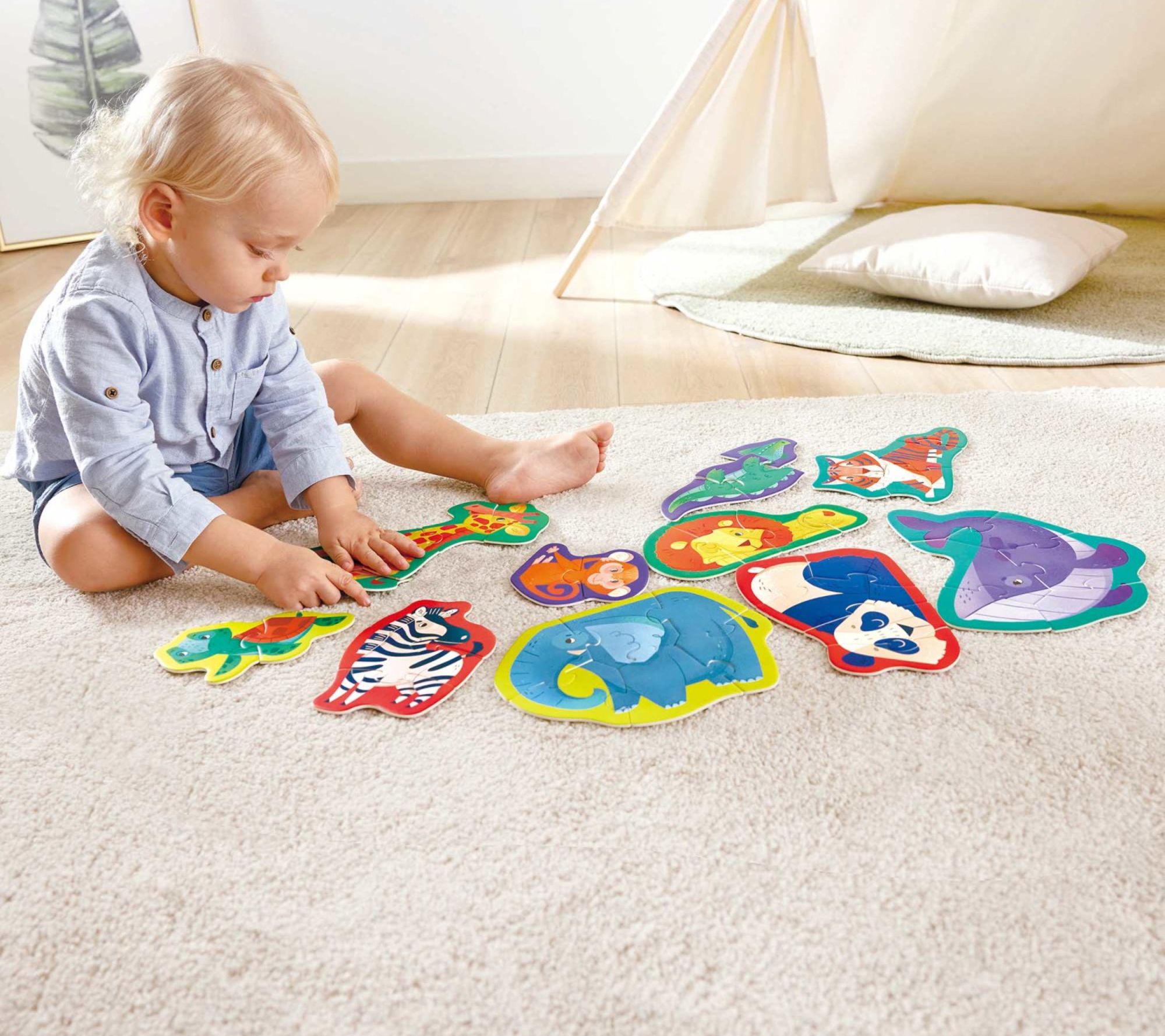 Introduce your little one to the wonders of the animal kingdom with the Hape Mini Animal Shaped Puzzle Set. As they piece together each majestic creature, engage their imagination by naming and mimicking the sounds of jungle animals. From Hape.