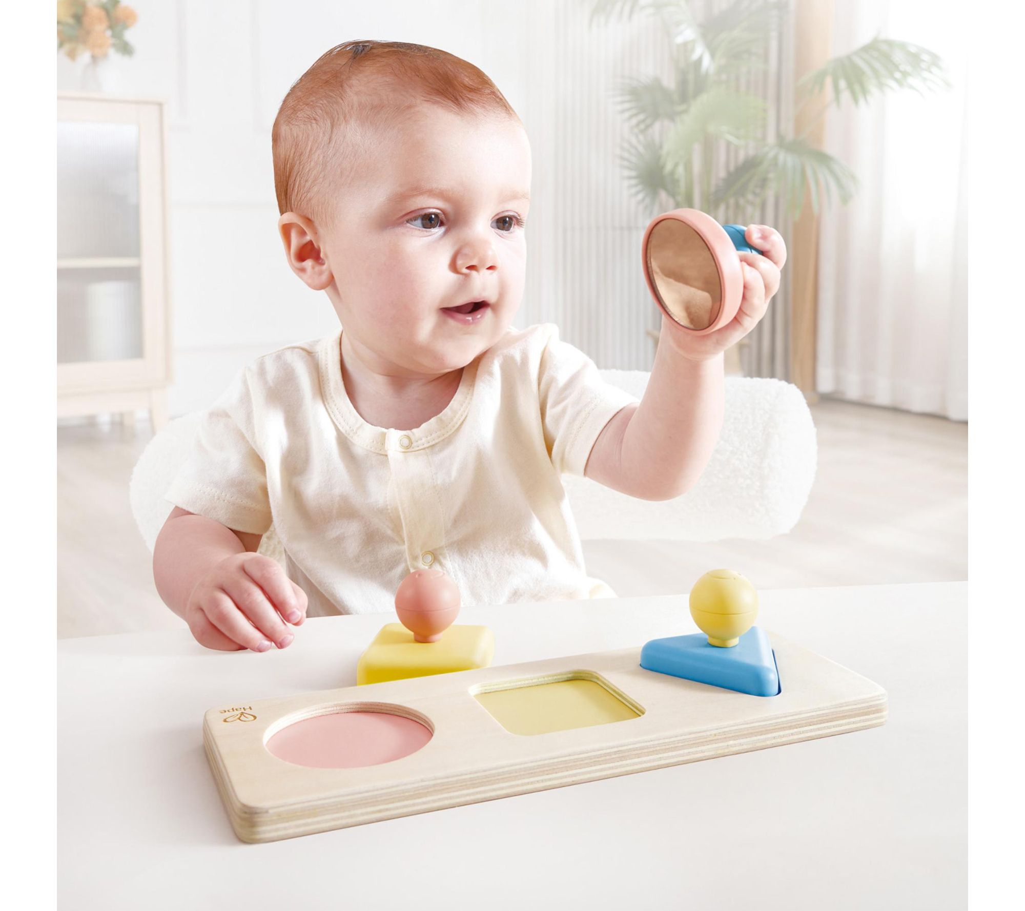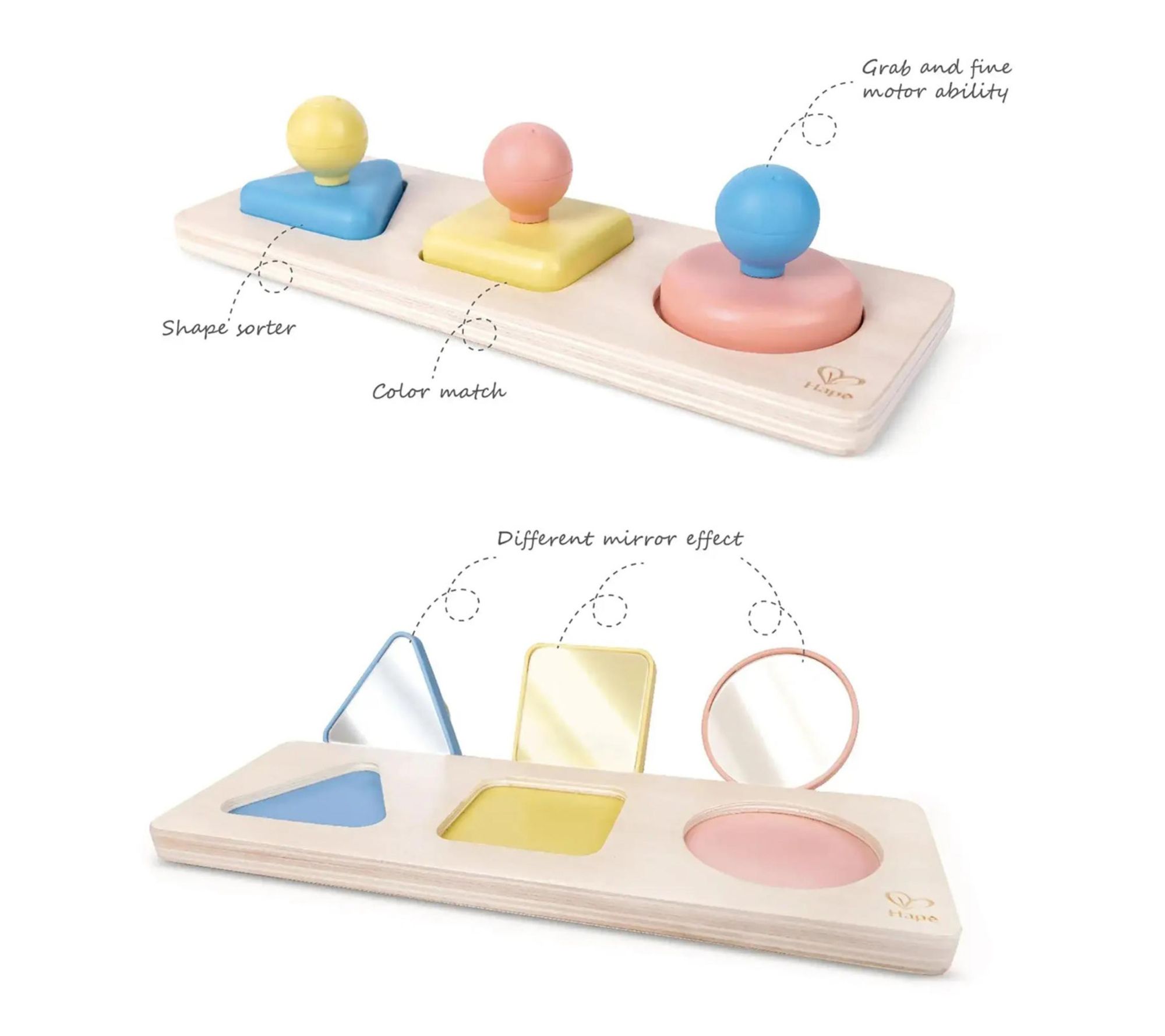 Encourage little ones to explore colors, shapes, and self-recognition with this Montessori-inspired mirror shape puzzle playset. Easy-to-grip pieces feature soft textures and engaging reflective surfaces, inviting hours of sensory discovery while developing fine motor skills and coordination in your child's daily play routine. From Hape.