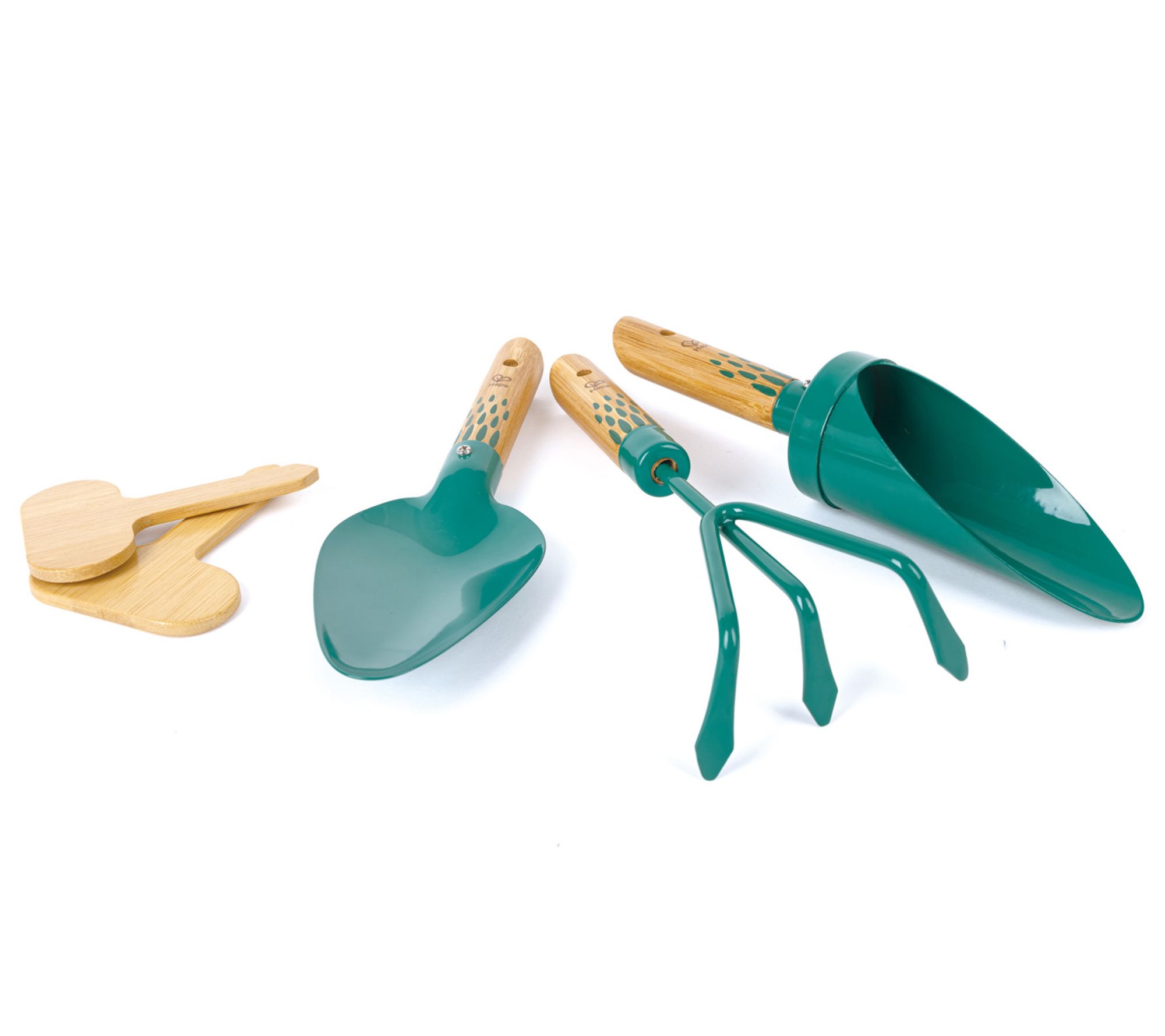 • Includes watering can, sharp shovel, rake, cylinder shovel, two bamboo labels