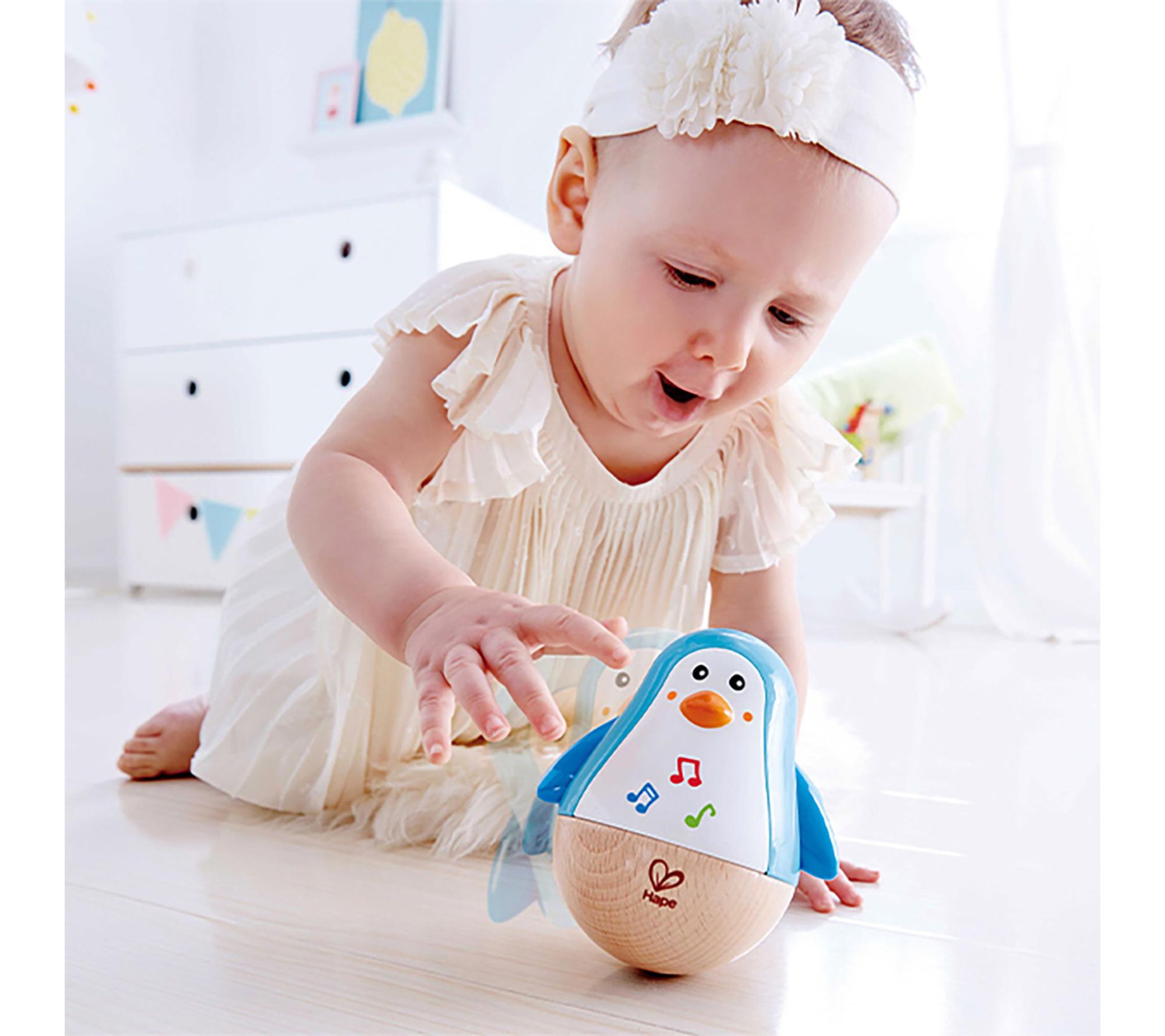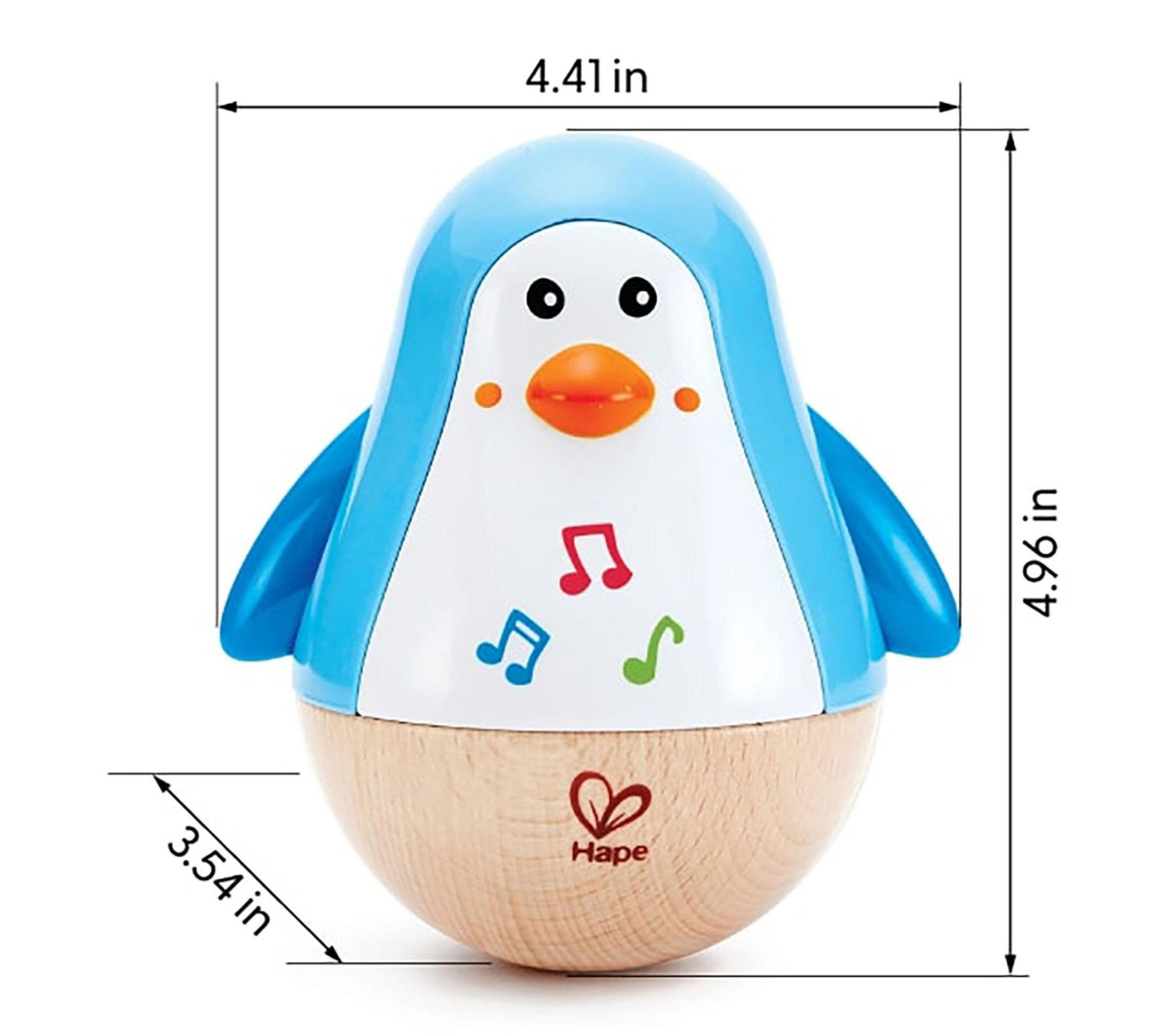 A gently push brings this penguin-shaped musical toy to life -- delighting little hands as it wobbles and emits soothing tinkling sounds. Watch as its arms comically shake and it settles upright, encouraging babies to explore music, melody, and movement during playtime or on-the-go. From Hape.