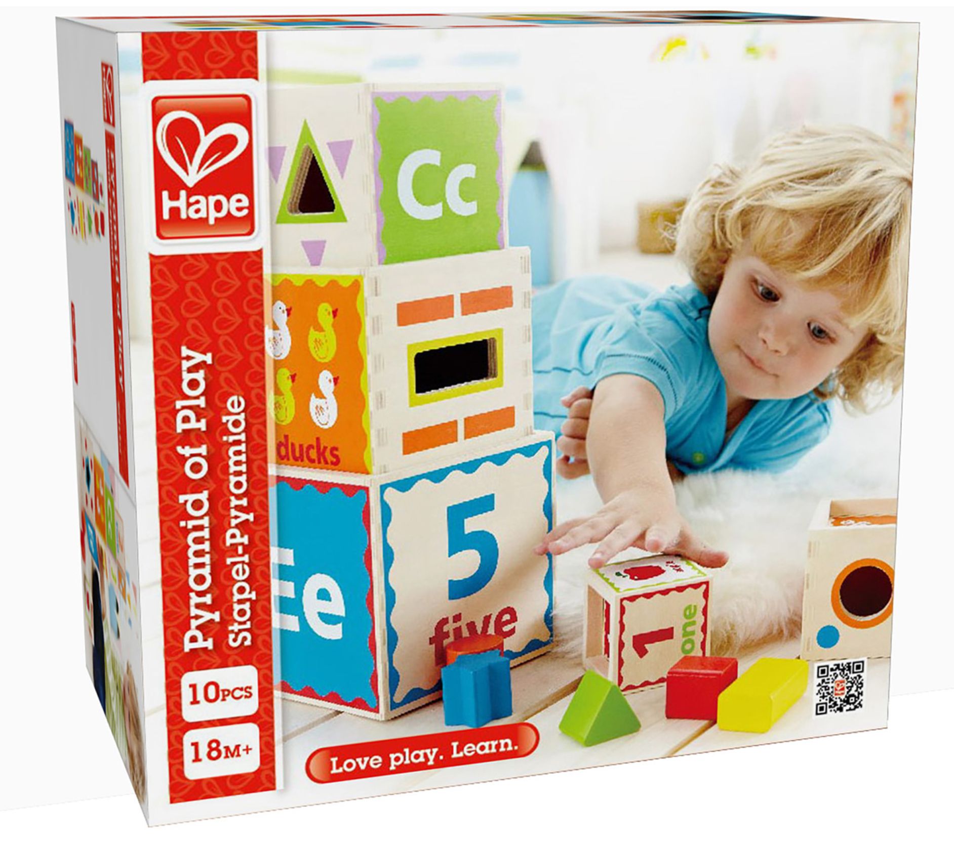 The Pyramid of Play from Hape offers endless fun with five wooden nesting blocks, each featuring letters, numbers, and colorful shapes. Perfect for developing fine motor skills, these blocks allow children to stack, sort, and explore comparative concepts like size and height. From Hape.