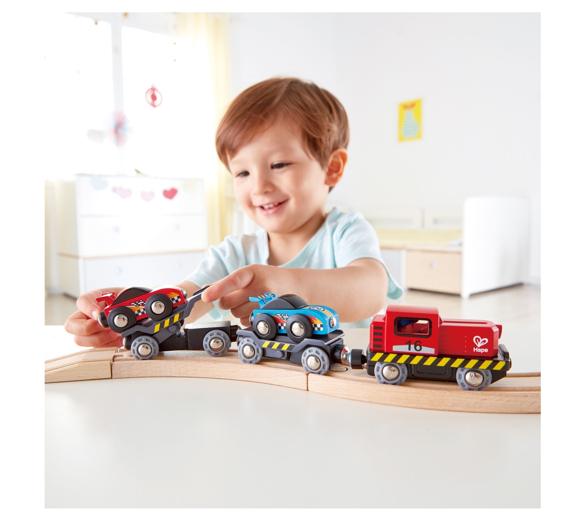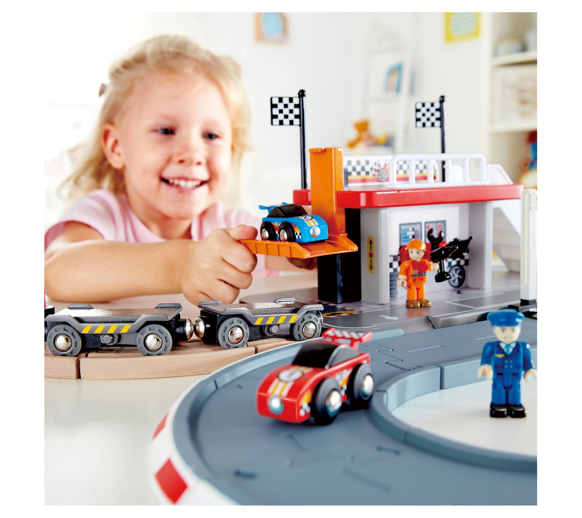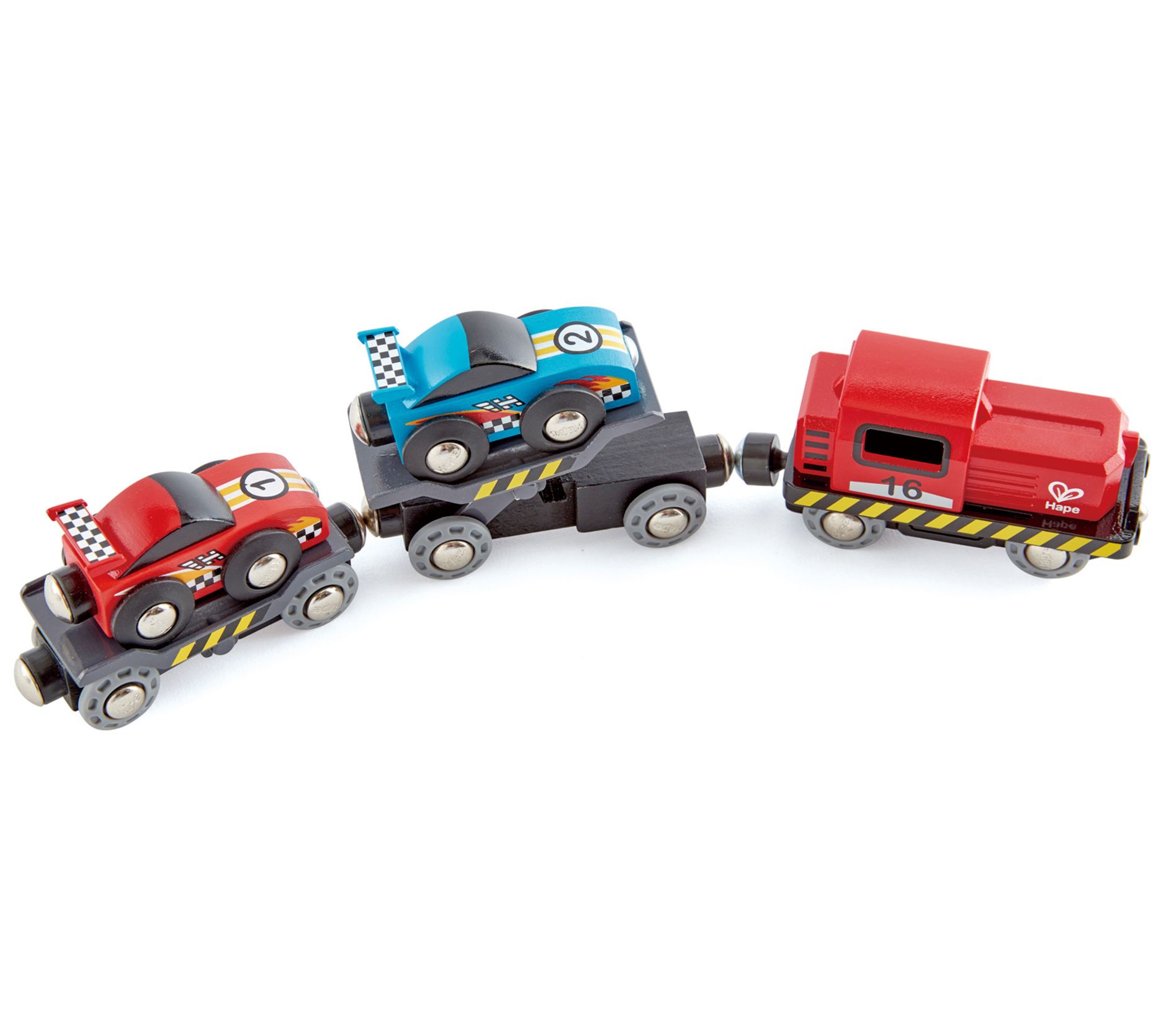 Rev up the imagination with this six-piece race car set designed for high-speed fun and creative play. This set features a foldable ramp for easy car loading onto the transporter, magnetic couplings for quick connections, and is compatible with Hape and other leading wooden railway brands. From Hape.