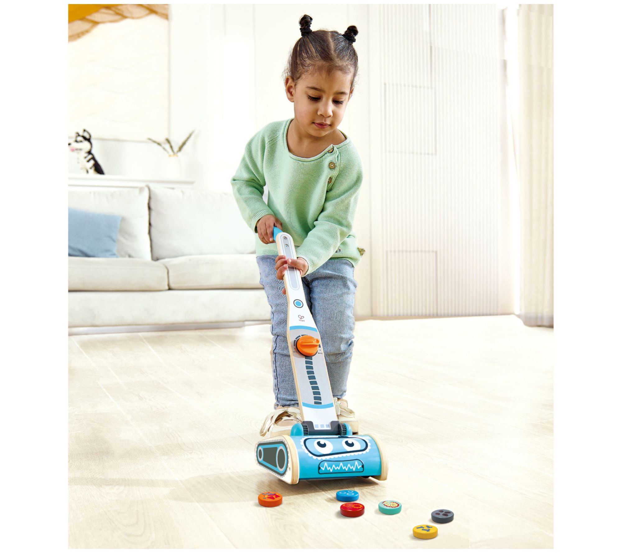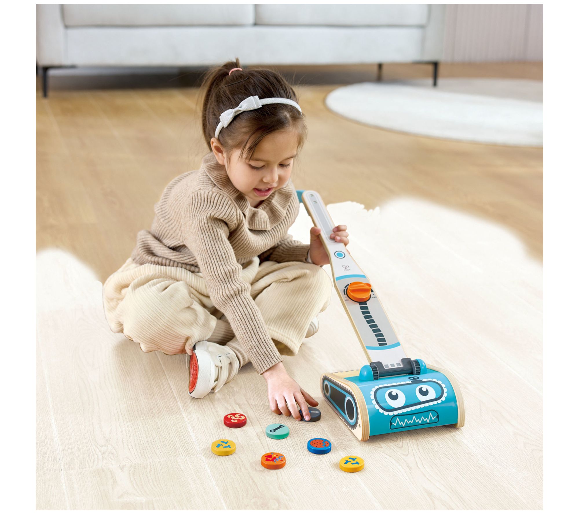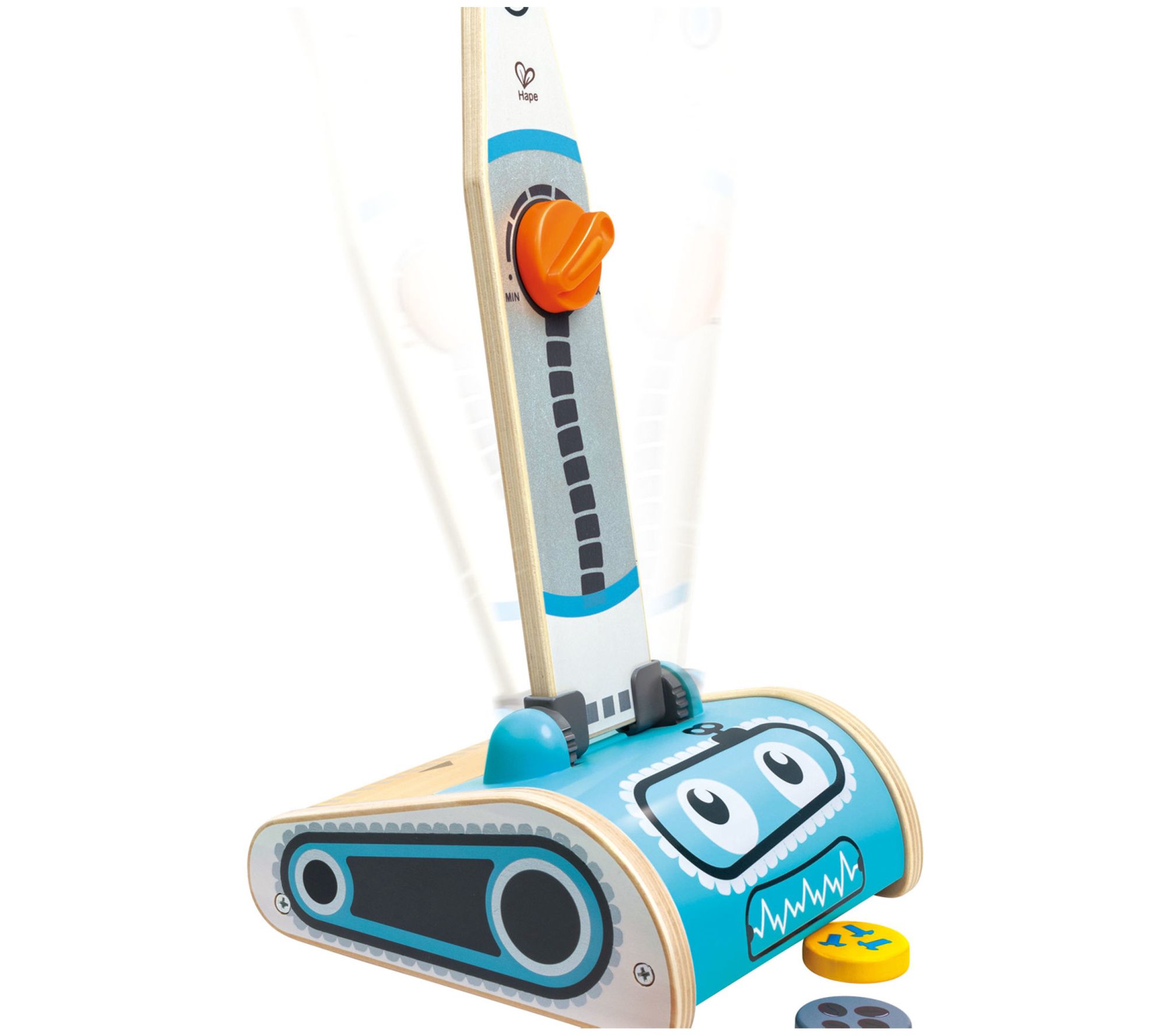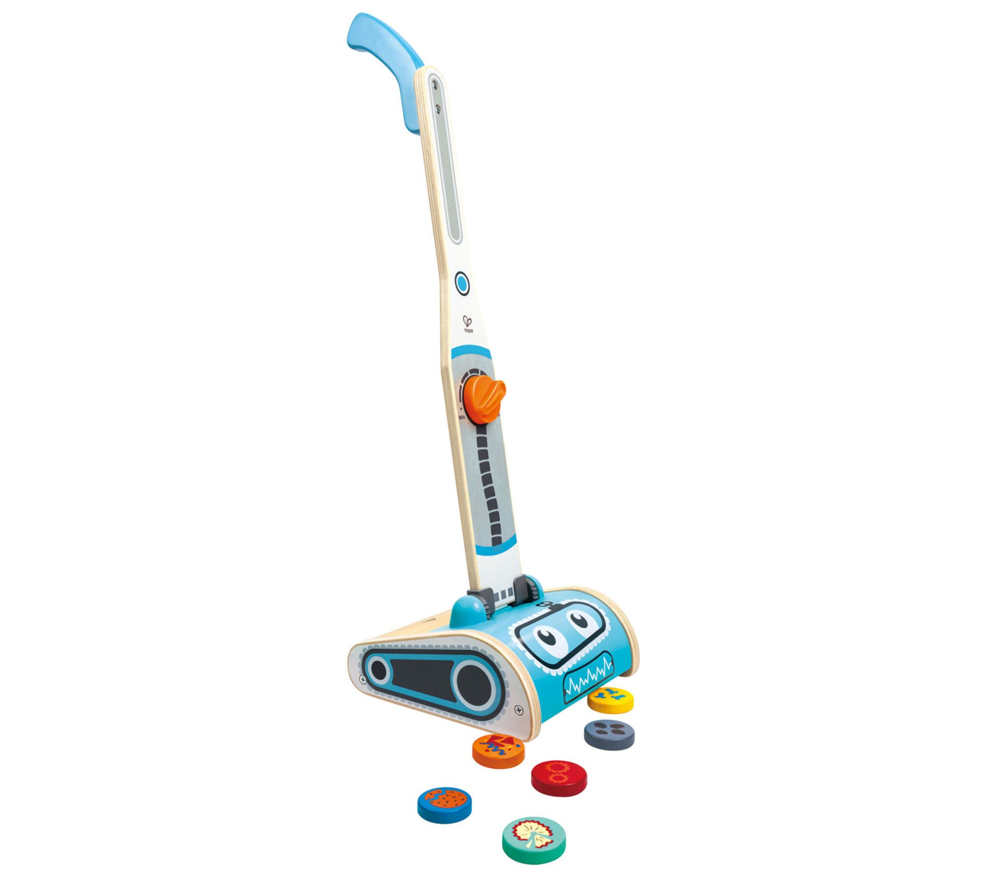 Watch your little one happily learn to tidy up with the Hape robot vacuum clean up toy. This charming vacuum, complete with a funny robot face, lets kids scoop up pretend rubbish, making cleaning fun and educational. Perfect for role-play, it encourages fine motor skills and language development. From Hape.