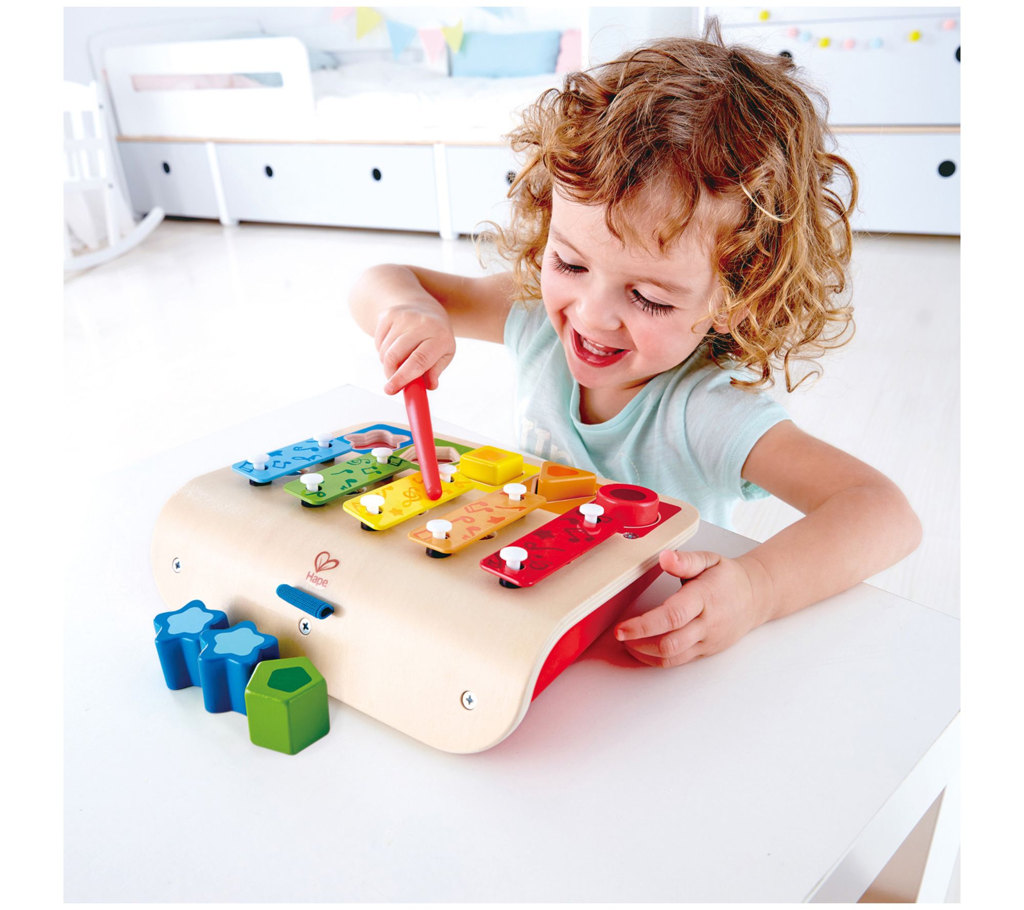 Introduce your little one to the world of music and learning with the Hape shape sorter wooden xylophone toy. This multifunctional toy combines a piano, xylophone, and shape-sorting game, encouraging exploration and creativity. Match the puzzle pieces by shape or color and create delightful tunes with the included baton. From Hape.