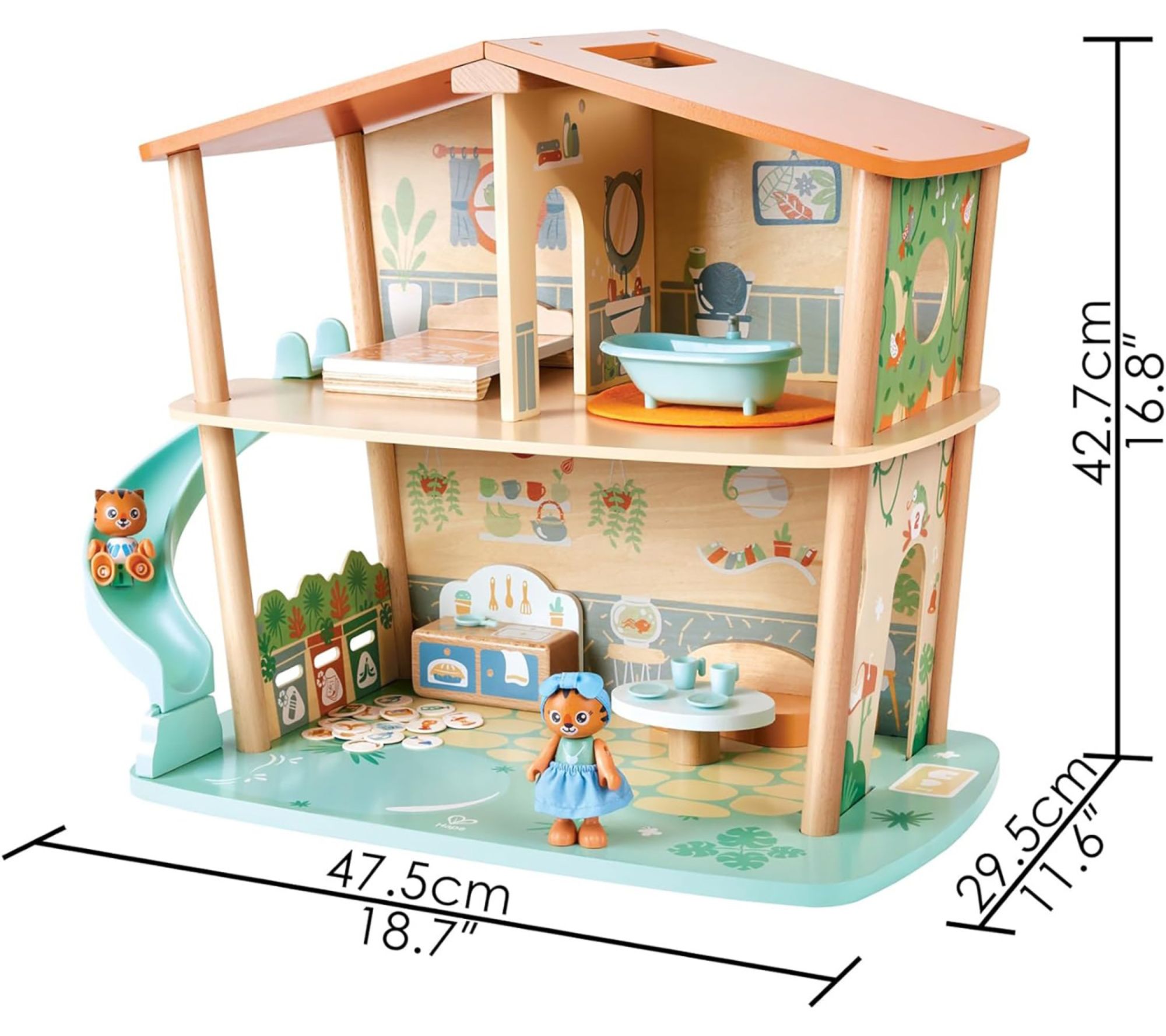 Get ready for endless adventures with the Hape Tigers' Jungle House Wooden Toy Set. Crafted from wood, this 34-piece playset features a variety of interactive elements like a pond, slide, and waste sorting games to spark your child's curiosity and creativity. From Hape International.