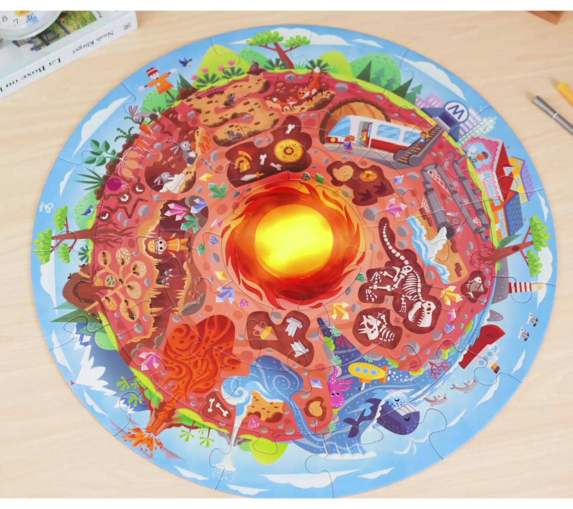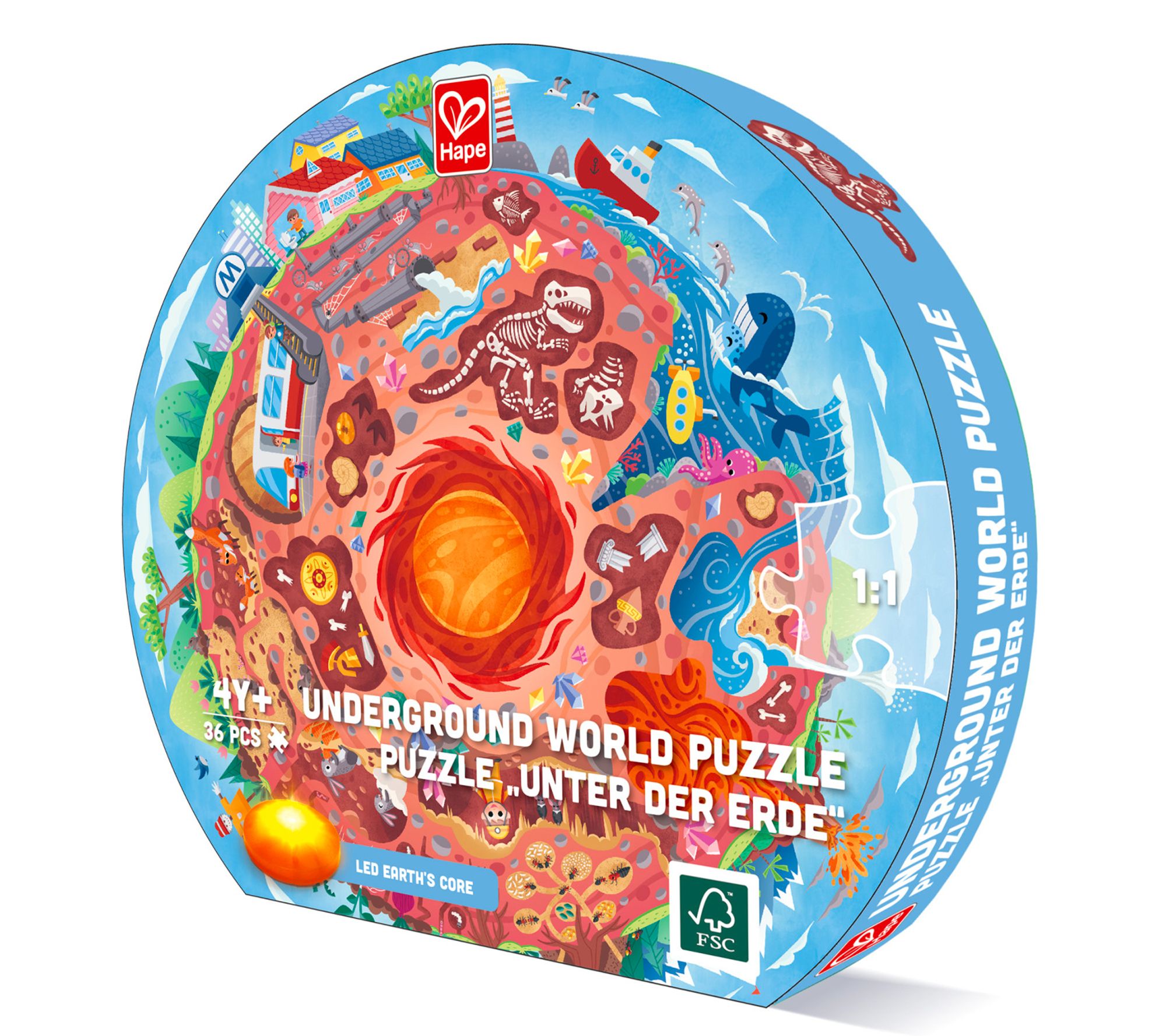 Dive into a fun science lesson with the Hape underground world puzzle! This 36-piece, extra-large floor puzzle features a light-up LED Earth's core and vibrant illustrations that reveal what's beneath our feet. Kids will love the engaging details and the double-sided poster filled with fascinating facts. From Hape.