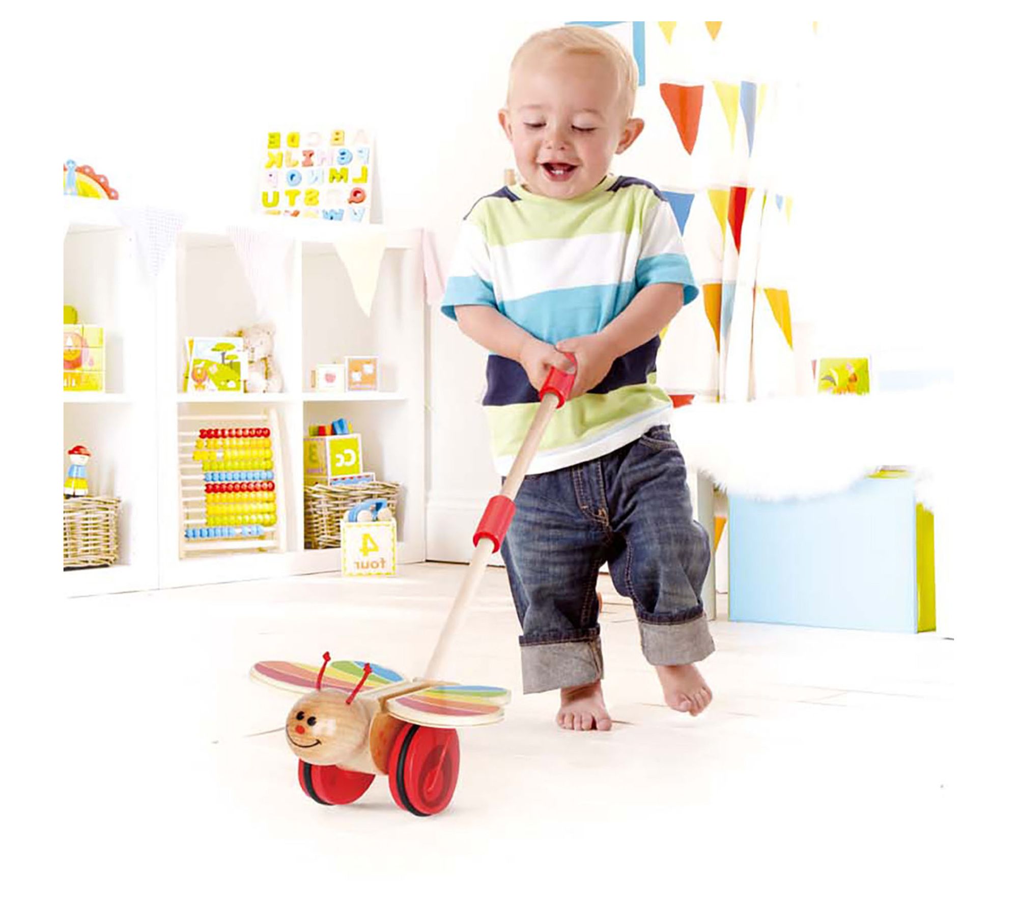 Watch your little one light up with joy as they chase after this adorable butterfly walking toy. A gentle push or pull sets the rainbow-colored wings in motion, captivating your child's attention while encouraging them to walk and run. From Hape.