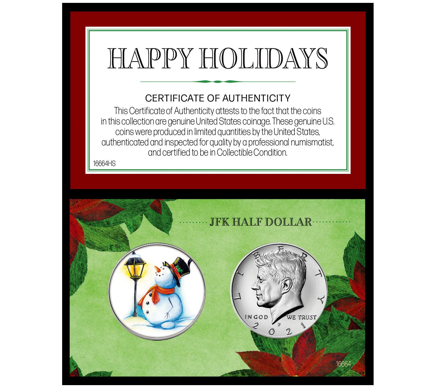 • Set includes a snowman colored half dollar, a 2021 JFK half dollar, a certificate of authenticity, and a mini greeting card