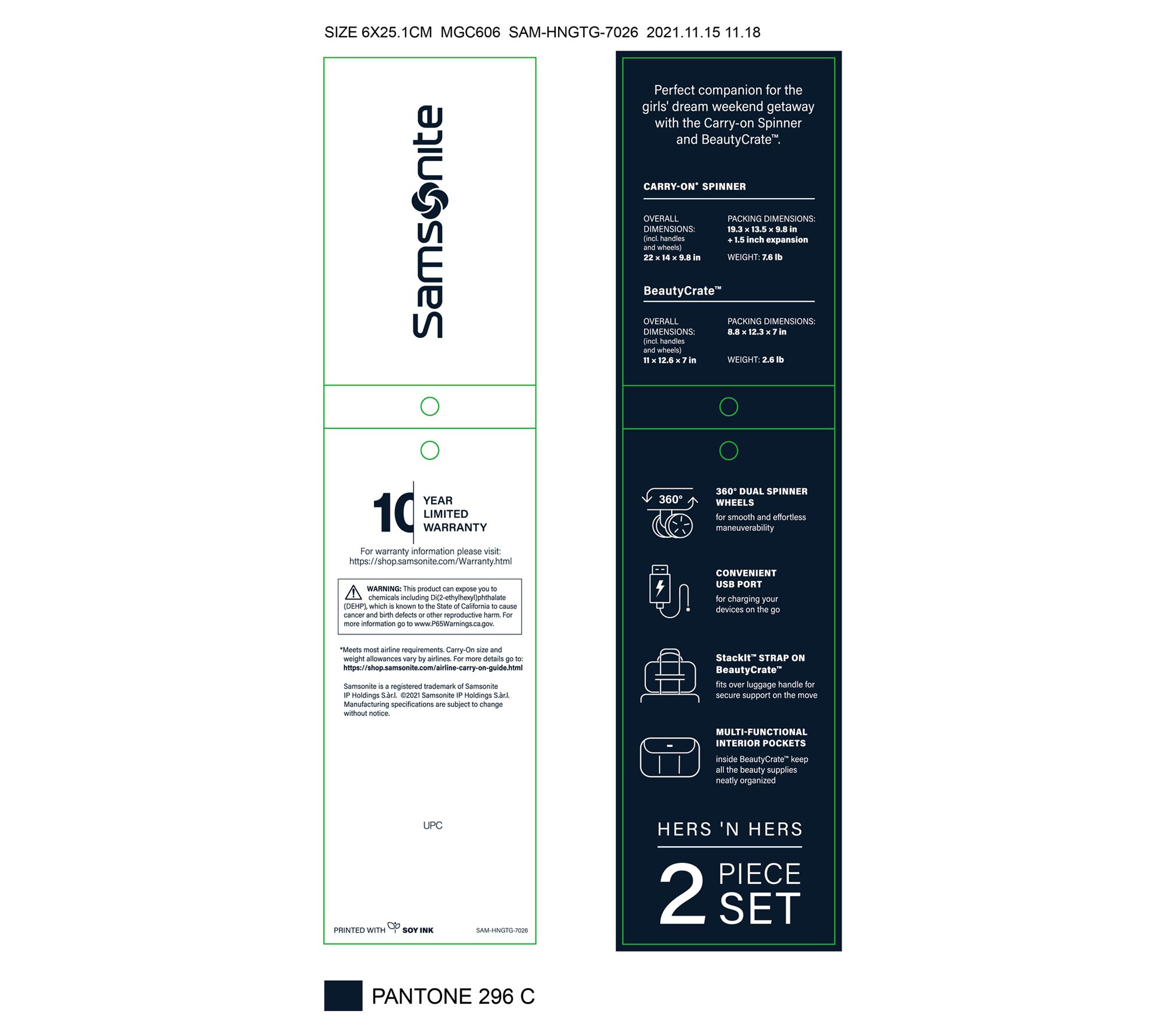 • Polyester exterior, zip closure, four spinner wheels, exterior zip pockets, aluminum push button locking handle, figure-eight leather wrapped carry handle, TSA-approved lock