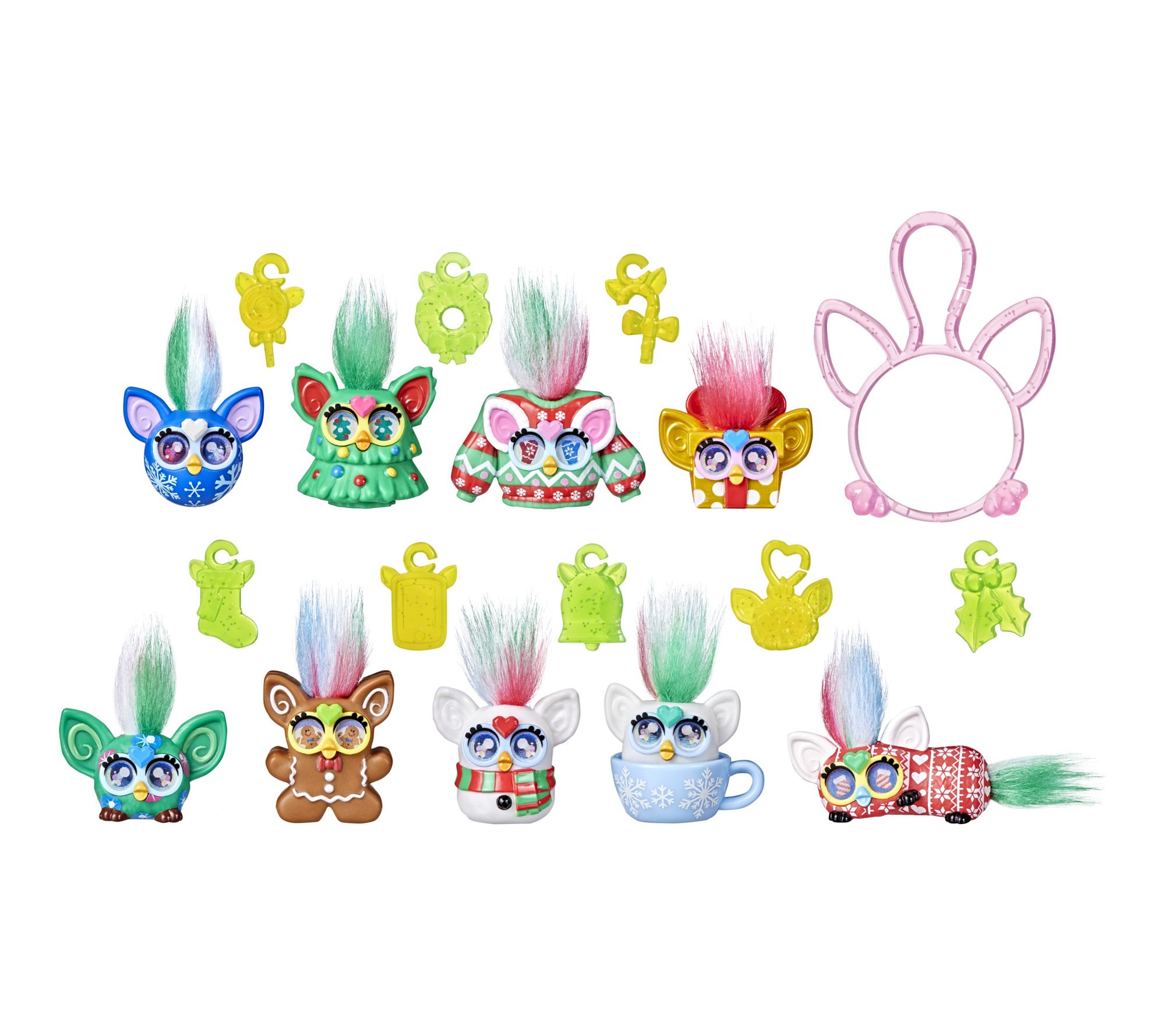 • Includes nine Furby Minis figures, a keychain clip with eight charms, and six stickers