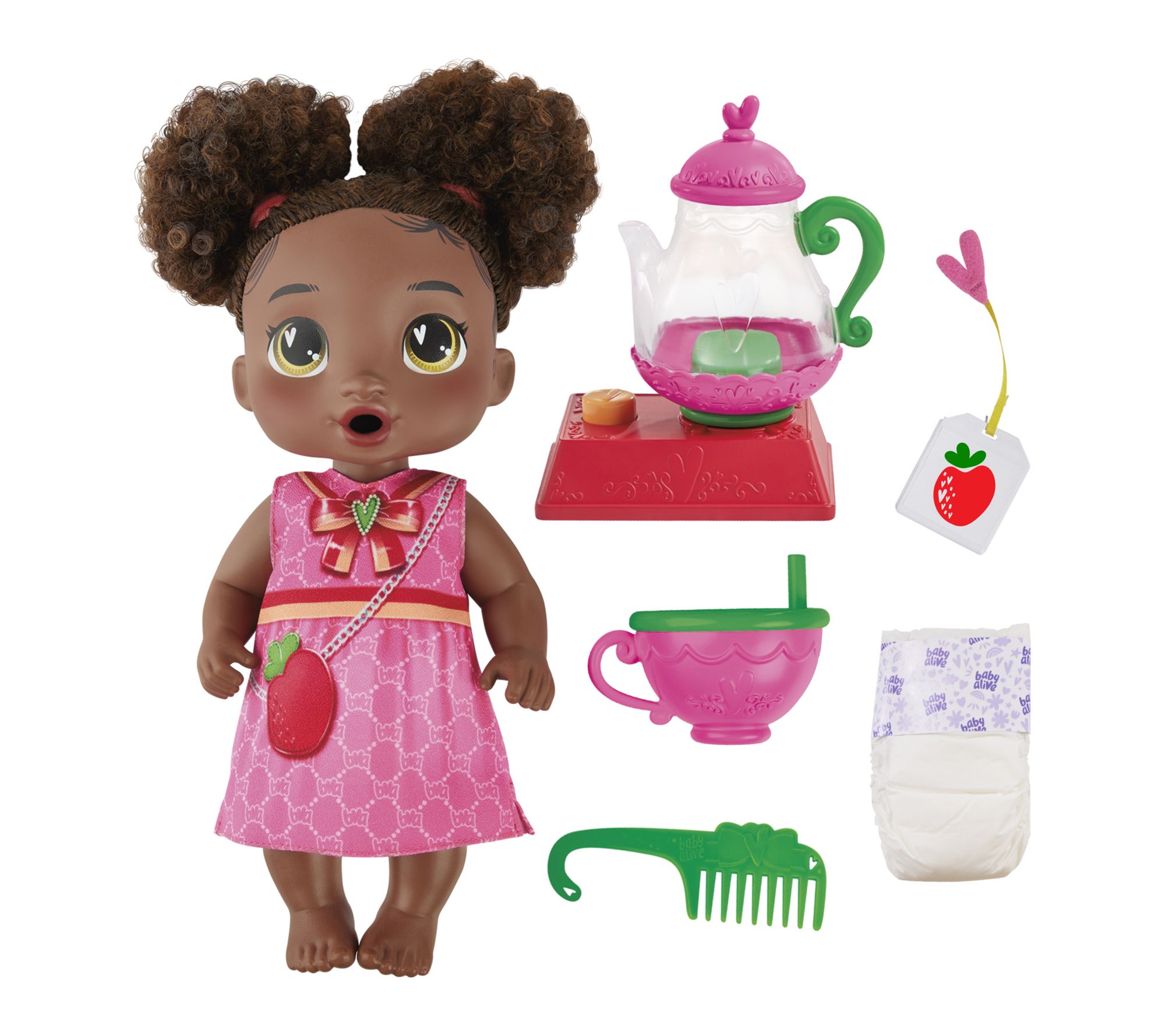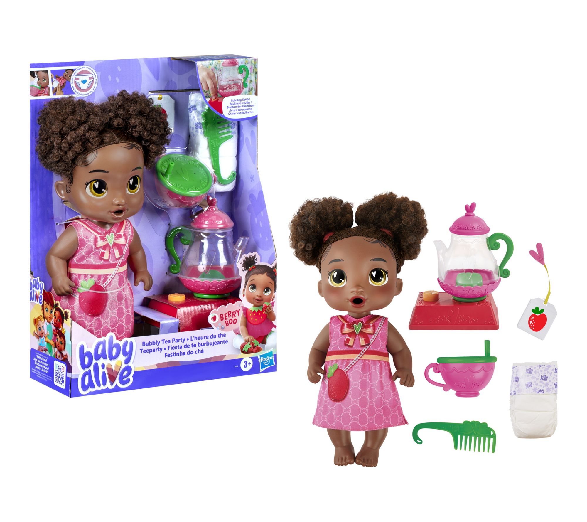 Host a magical afternoon of imaginative play with this interactive Baby Alive Bubbly Tea Party Berry Boo baby doll set. From creating bubbling pretend tea to styling Berry Boo's adorable pigtails and caring for her with a diaper change, this doll brings endless opportunities for curiosity and creativity during playtime tea parties. From Hasbro.