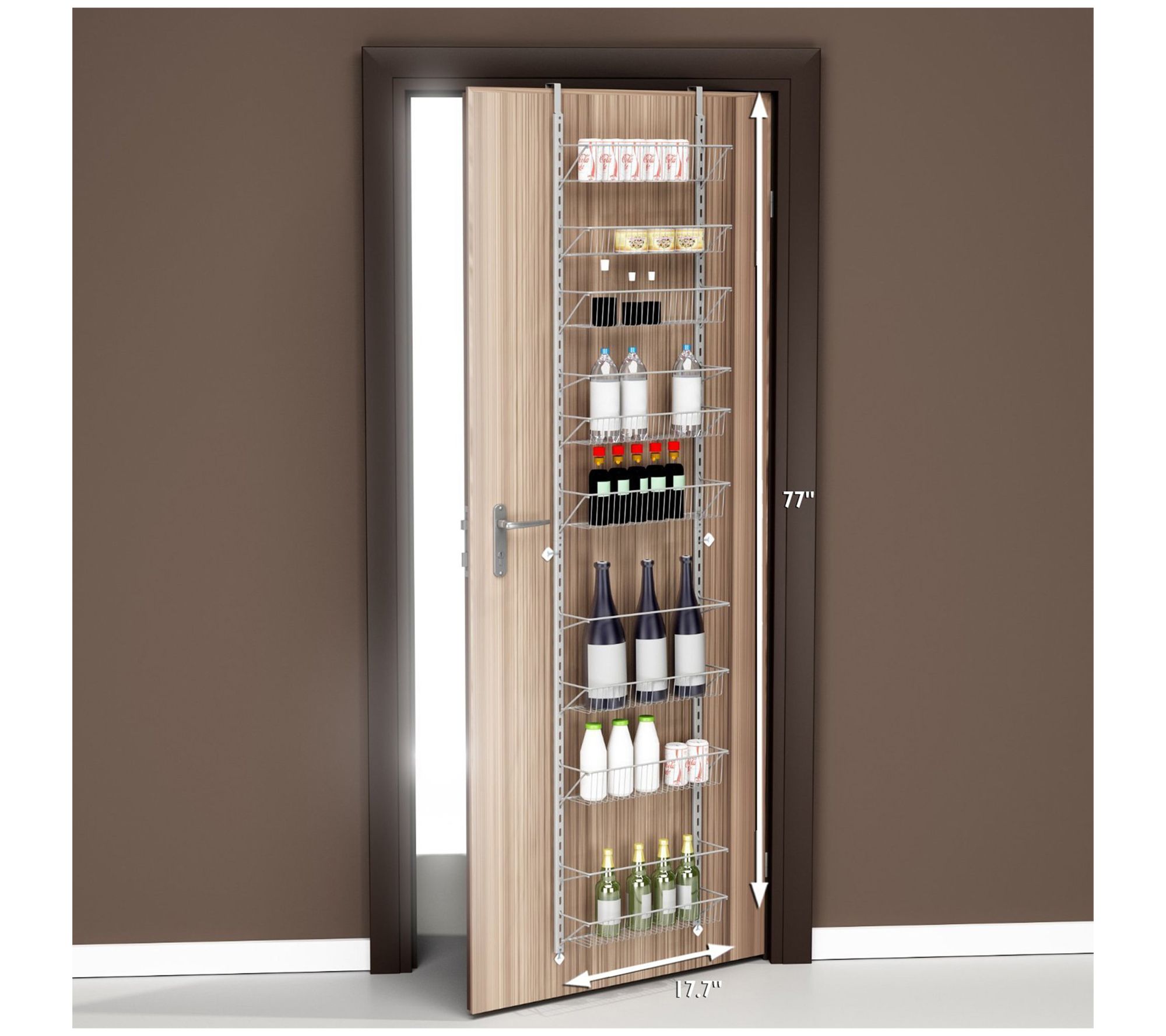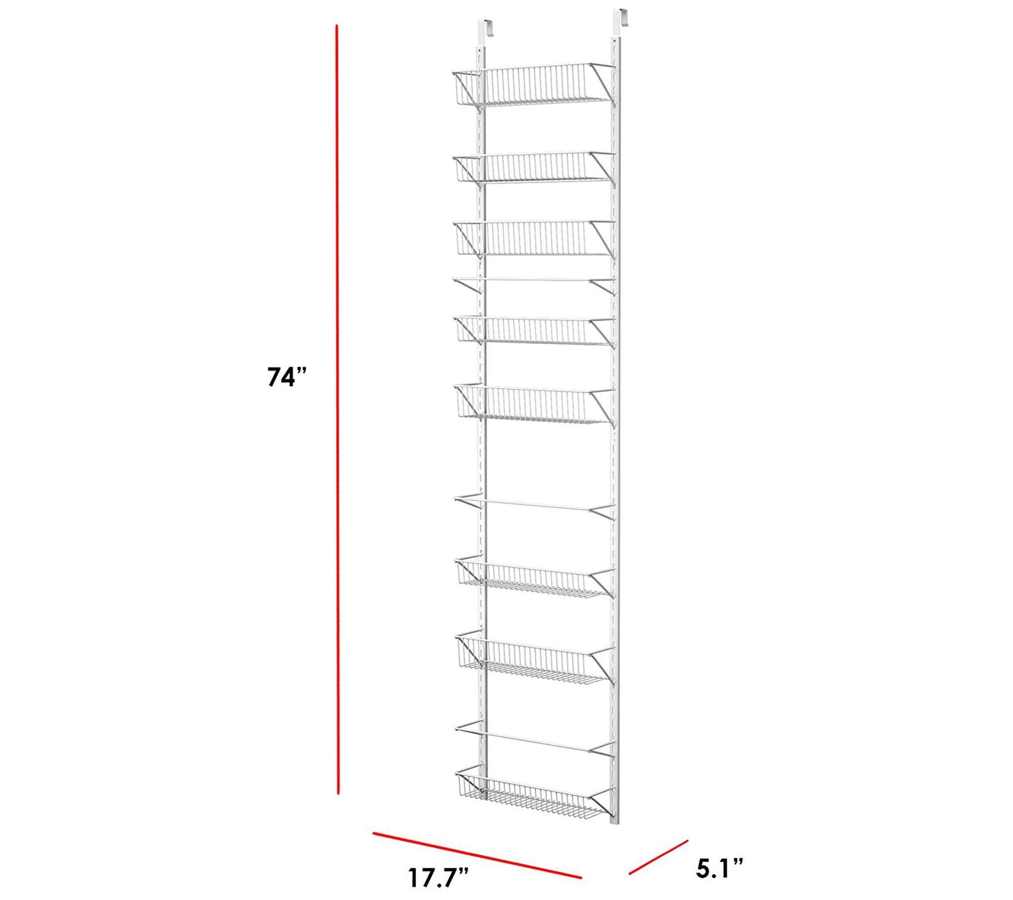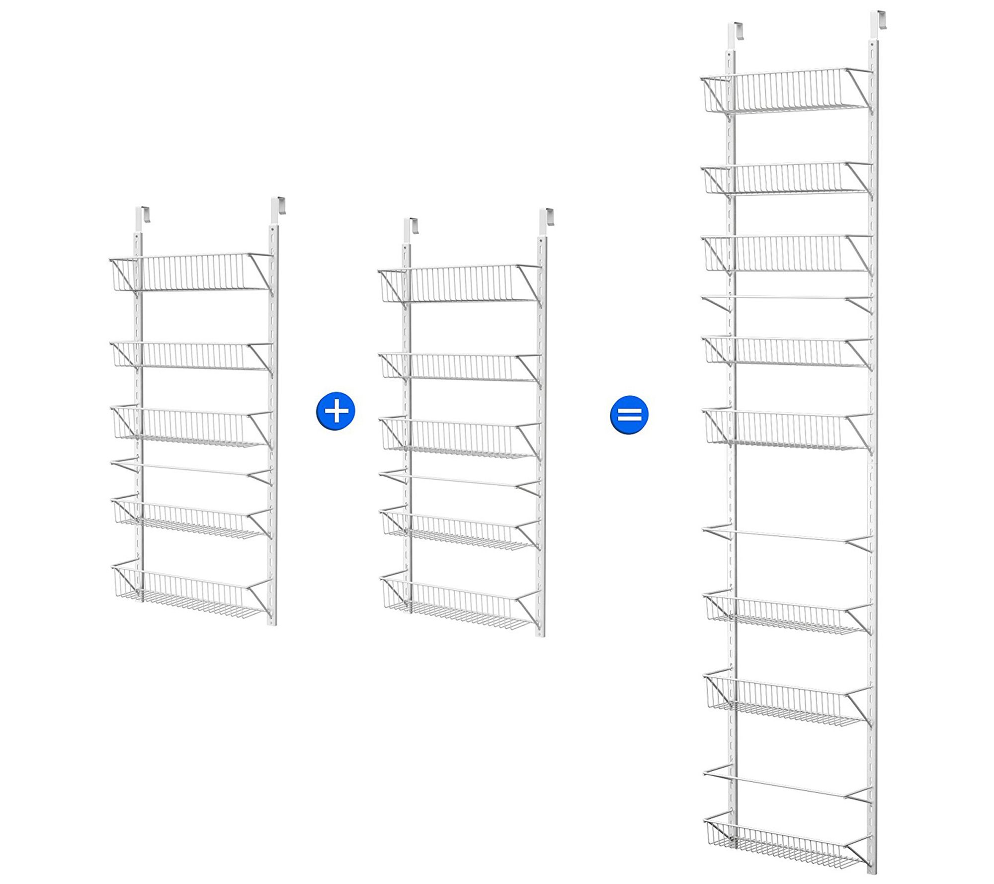 • Includes four rack rails, two rail connectors, eight baskets, three hanging bars, four door hangers, four adhesive hooks, eight drywall anchors, eight drywall screws, six screws and nuts