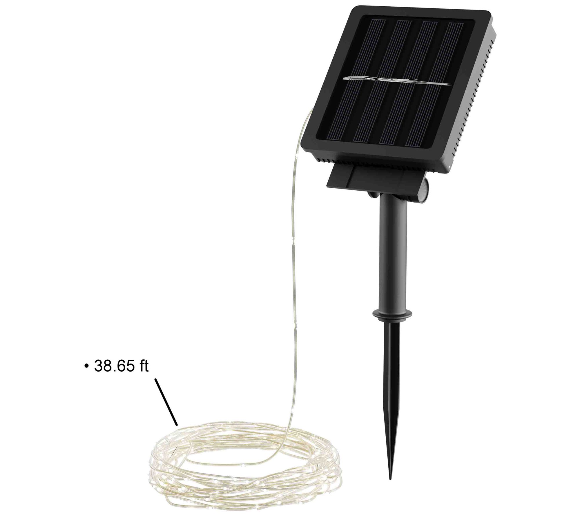 Light string measures approximately 38.65'; Solar panel 15"H x 3.5"W x 3.5"L