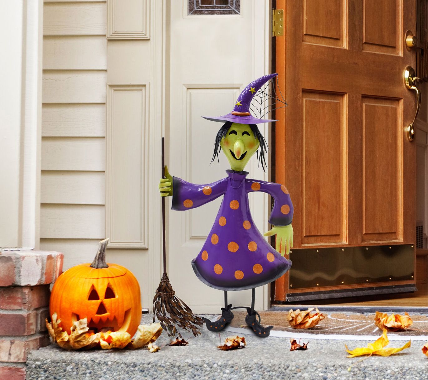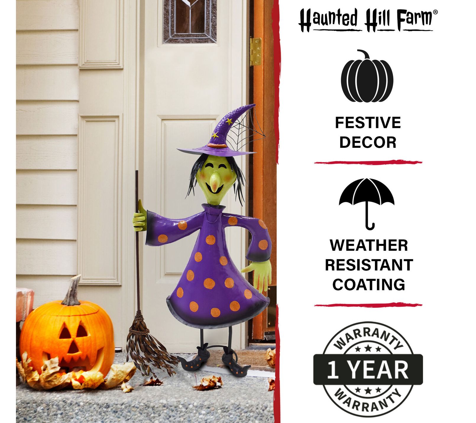 Perfect for your porch, foyer, entryway, or lawn, this whimsical witch is ready to greet partygoers and trick-or-treaters alike! From Haunted Hill Farm.
