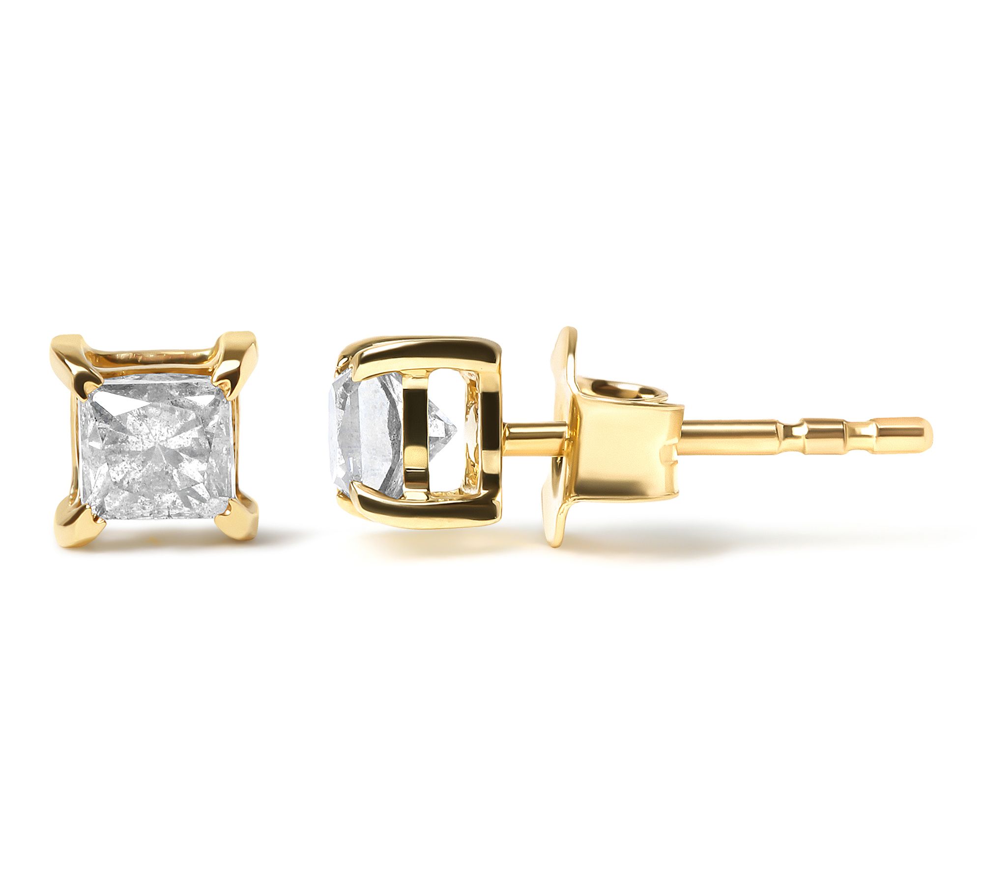 A glimmer of elegance for any occasion, these classic diamond stud earrings add subtle sparkle whether you're at brunch with friends or dressing up for a special evening. Set in 10K yellow gold-plated sterling silver, their princess-cut stones shimmer brilliantly, catching the light with each turn of your head. From Haus of Brilliance.