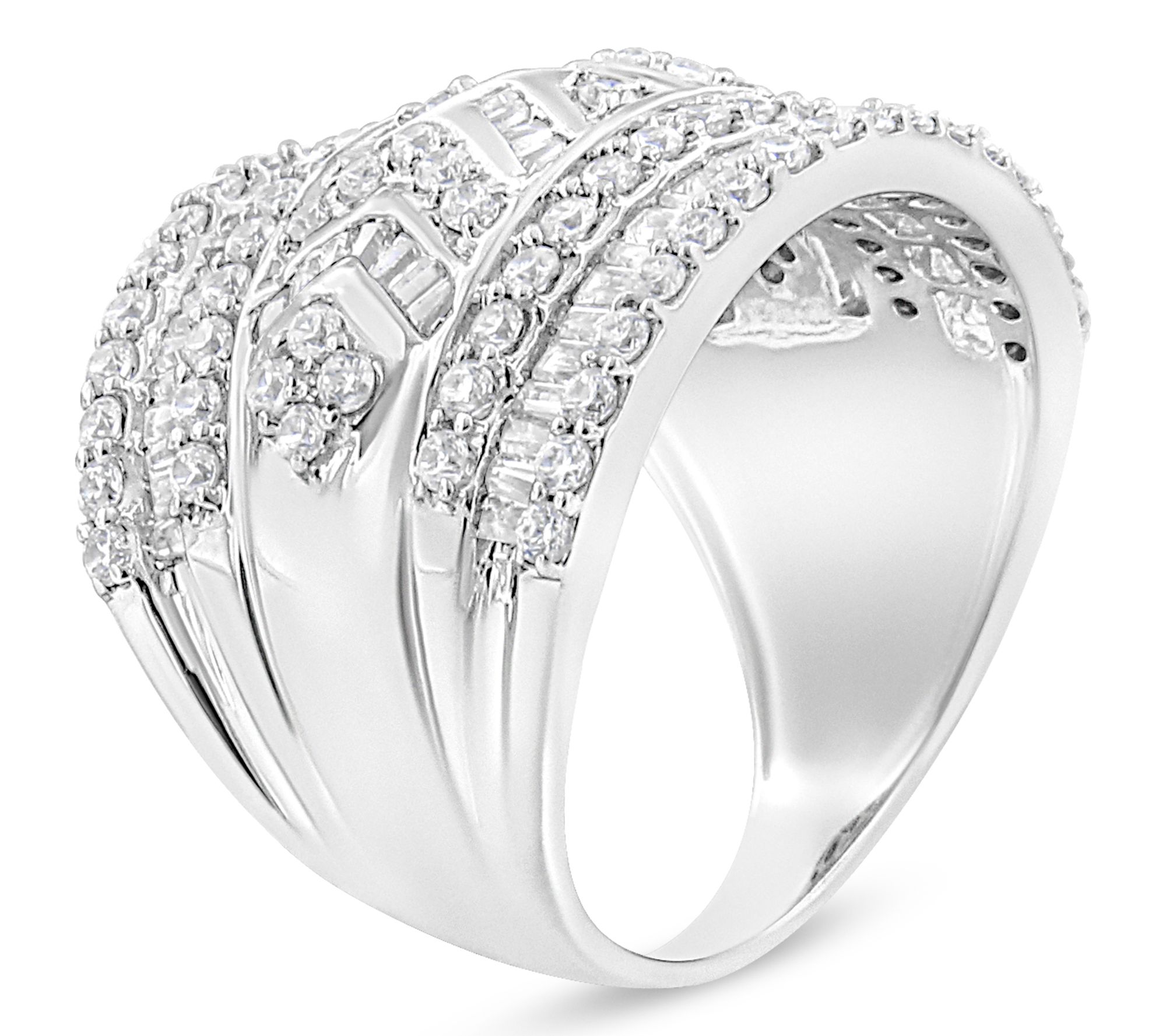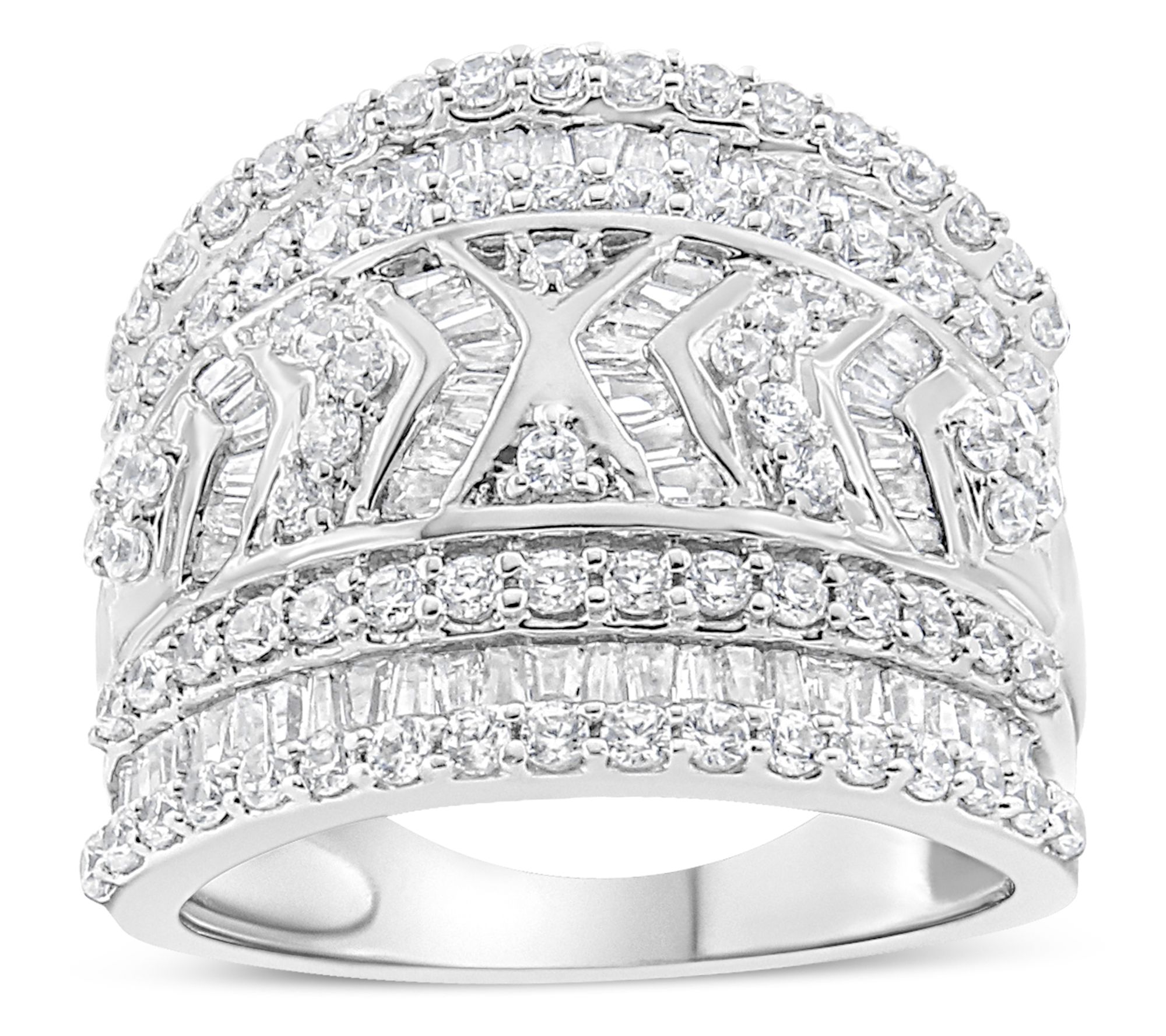 Radiate sophistication at any social event wearing this Haus of Brilliance 2.00 cttw diamond cocktail ring. The stunning piece features a dazzling array of 84 round-cut and 86 baguette diamonds, all set in rhodium-plated sterling silver. Perfect for special occasions or adding a touch of glamour to your everyday look. From Haus of Brilliance.