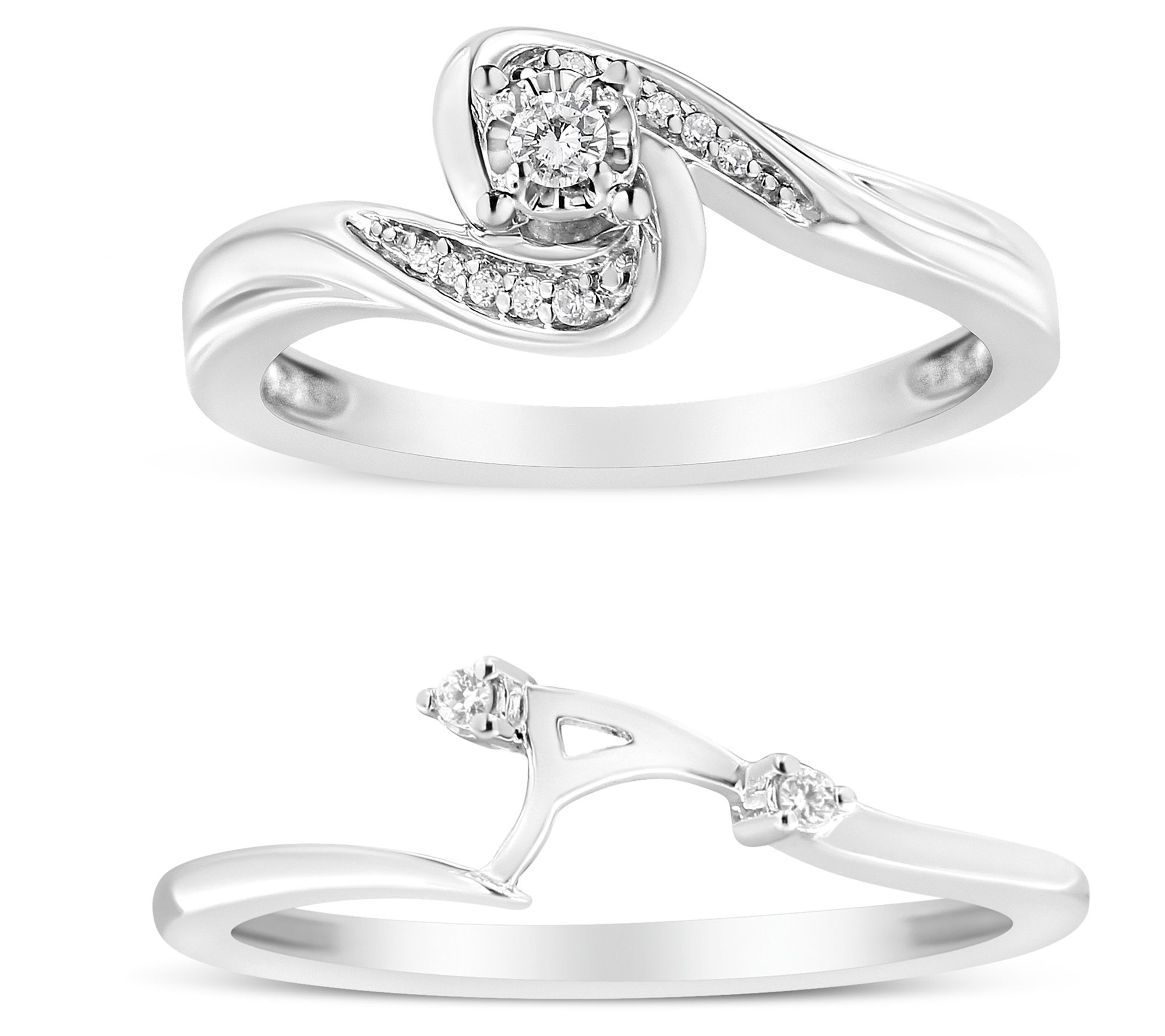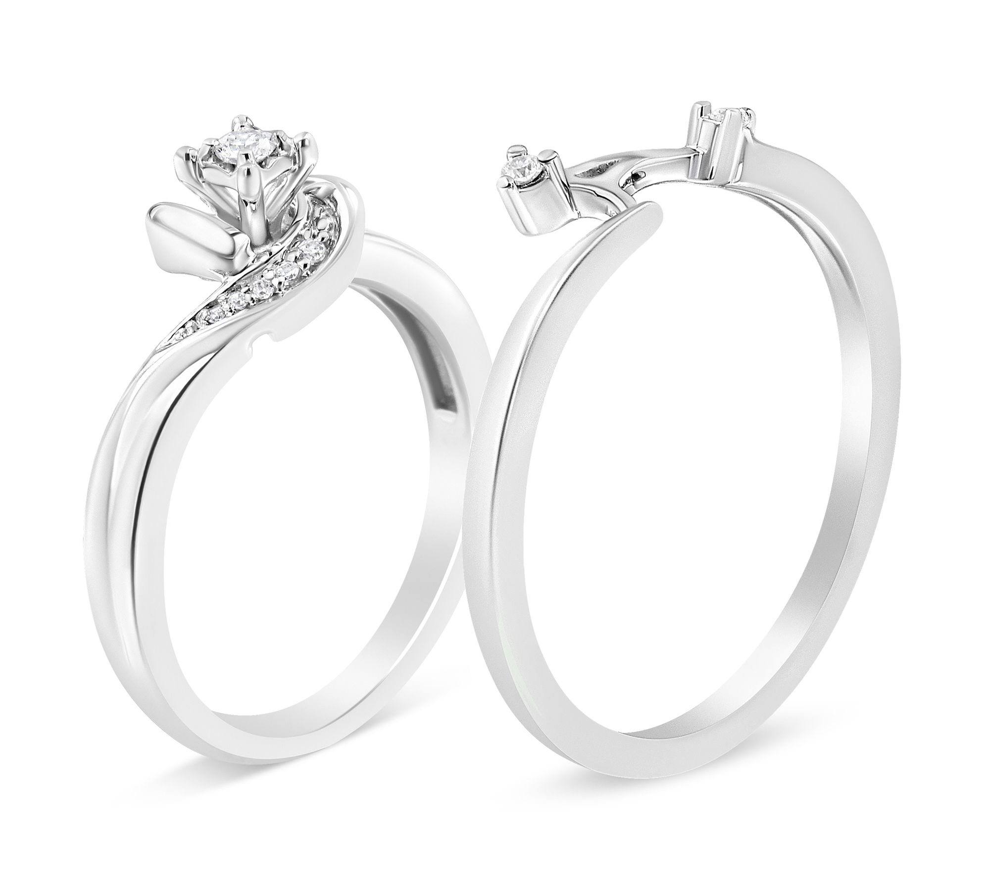 Celebrate your love story with this set of bridal rings, symbols of commitment and elegance. Crafted in rhodium-plated sterling silver, this set features a brilliant round-cut diamond accent, beautifully complemented by a polished shank for a touch of sophistication. Perfect for the bride who cherishes both tradition and style. From Haus of Brilliance.