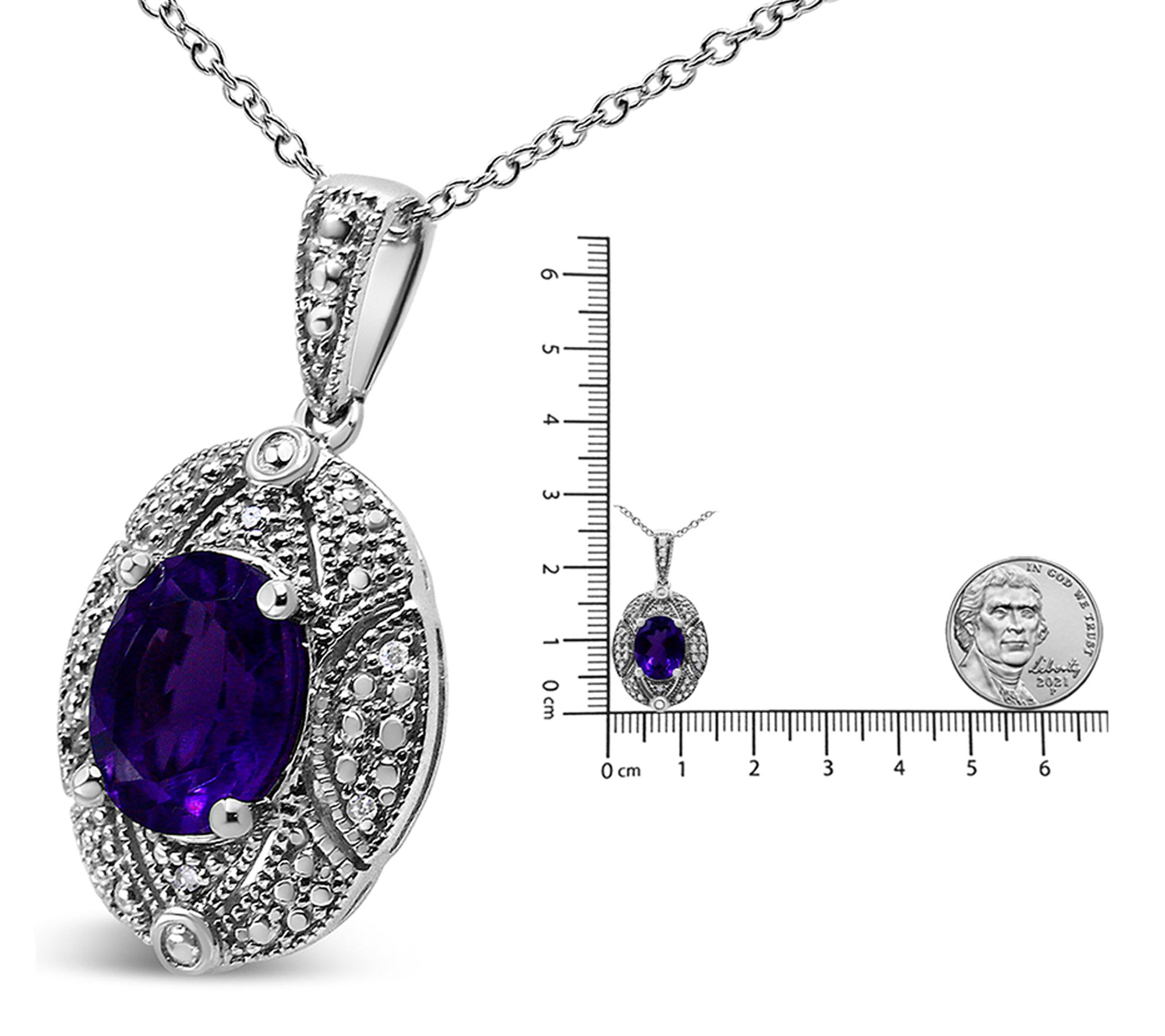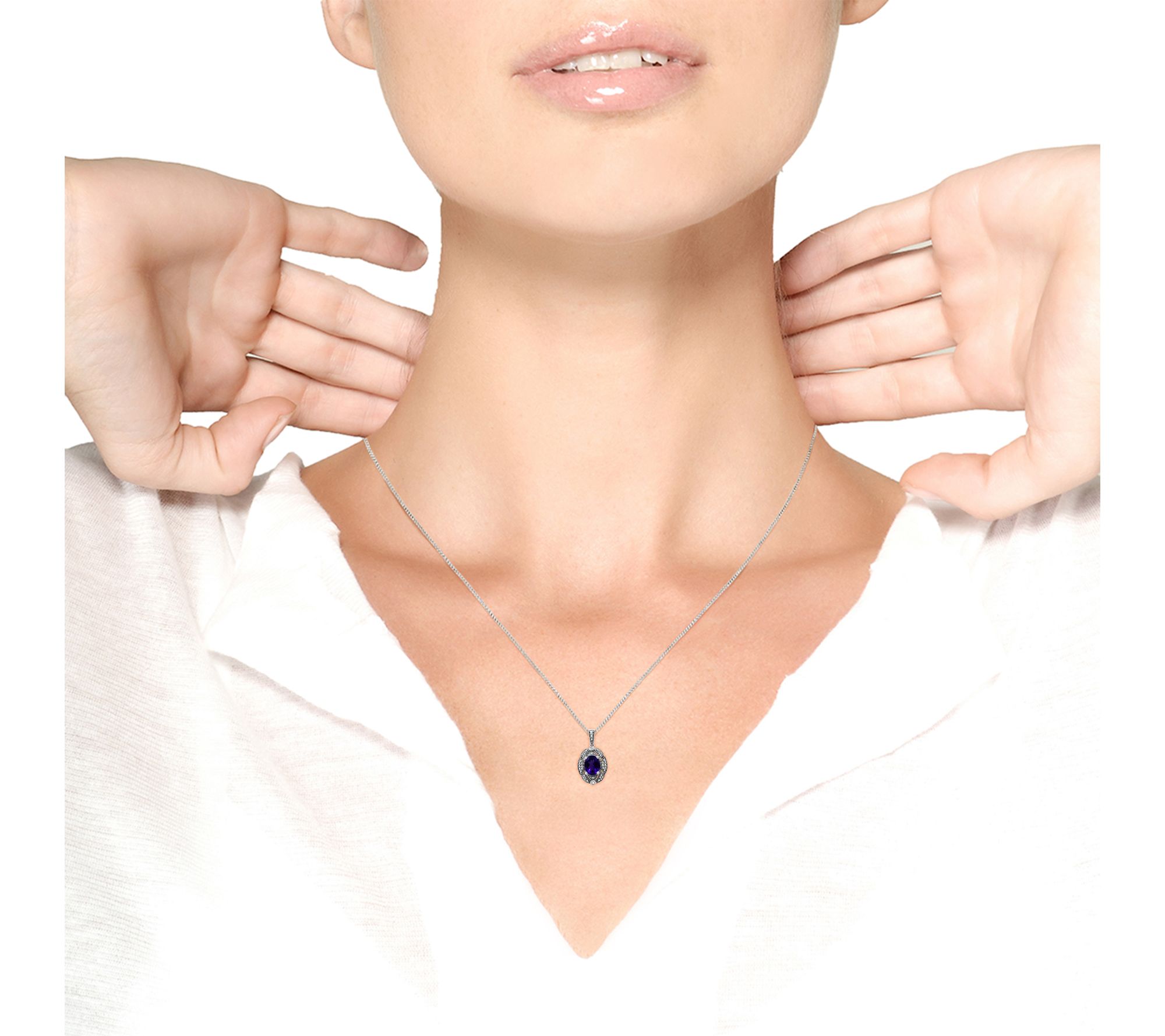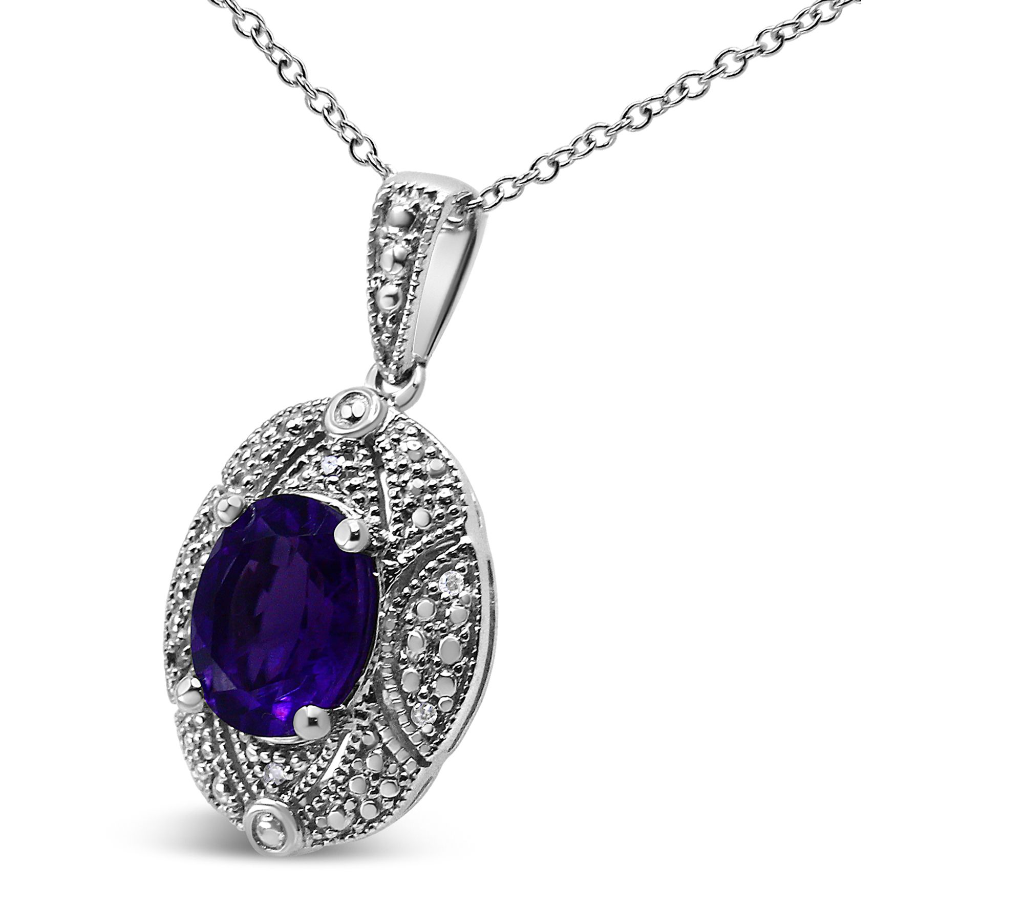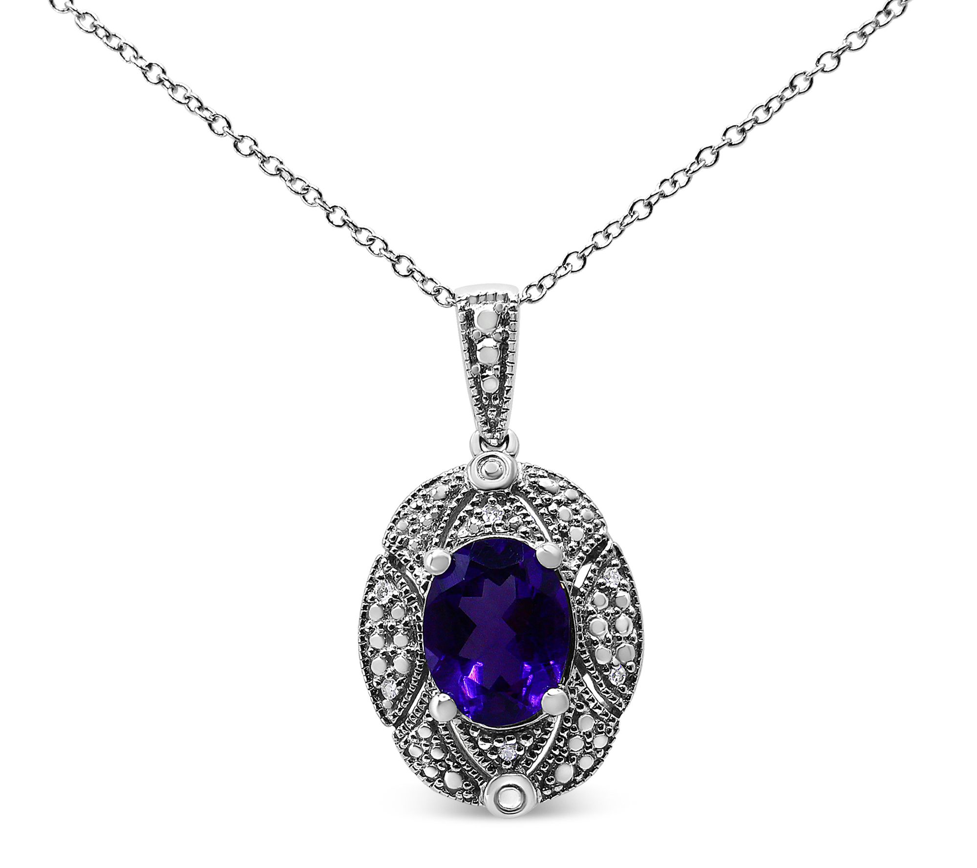The delicate sparkle of this amethyst and diamond necklace brings a touch of elegance to any moment, whether layered with other favorites for brunch or paired with a favorite dress for dinner. A vibrant oval-cut amethyst is complemented by round accent diamonds and sterling silver, creating a beautiful look for day or evening outings. From Haus of Brilliance.